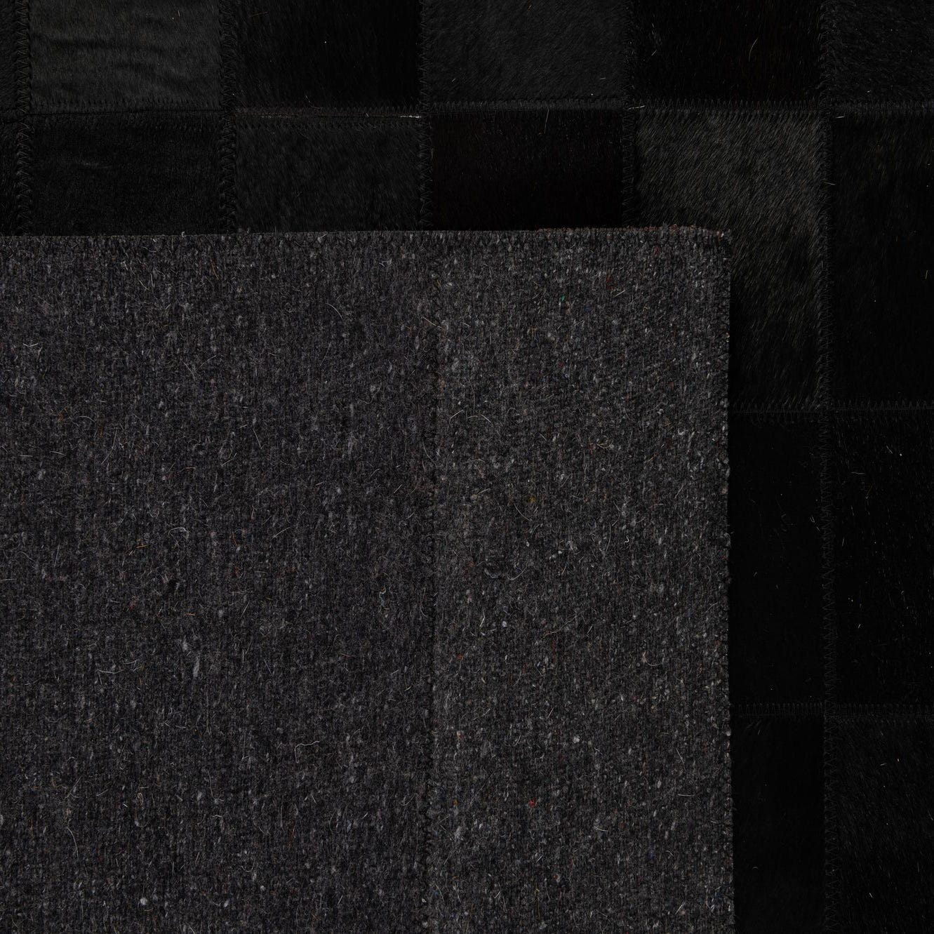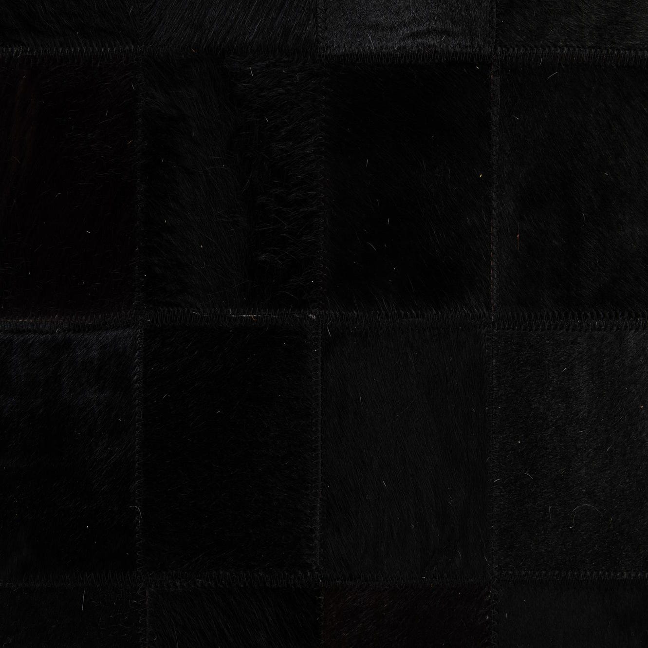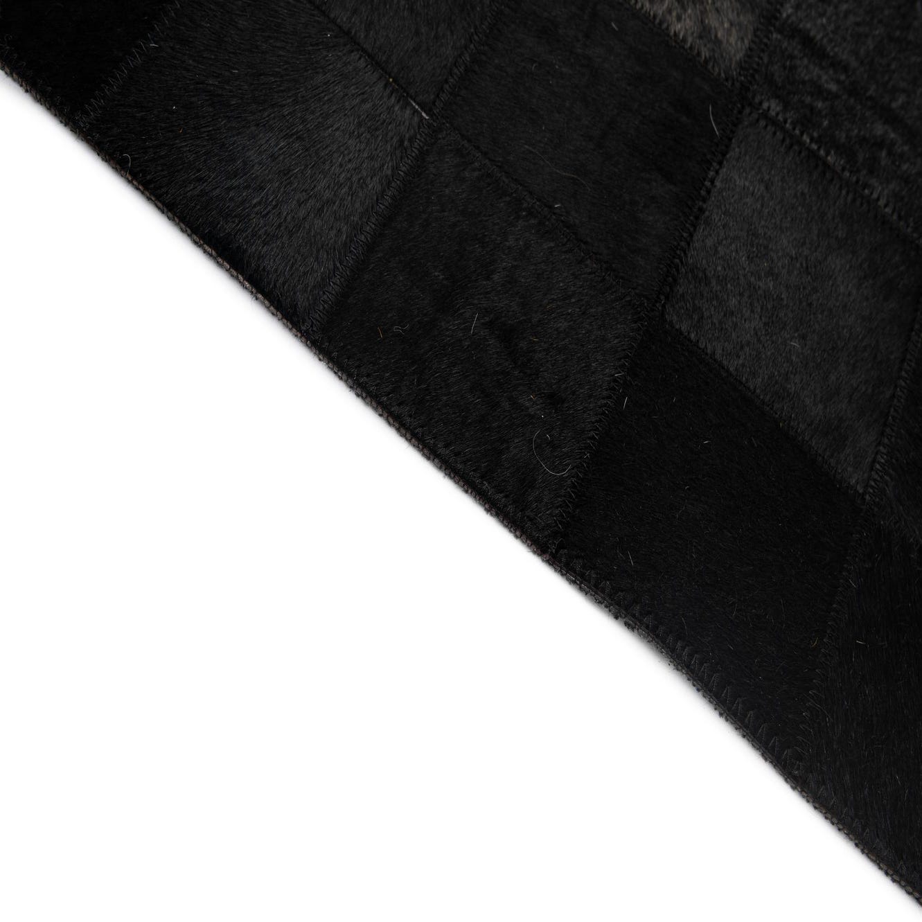 A 5x8 rectangular Cowhide - Patchwork rug by Rugs.com. The modern black rug features a grid of varying black cowhide squares, creating subtle texture and depth.