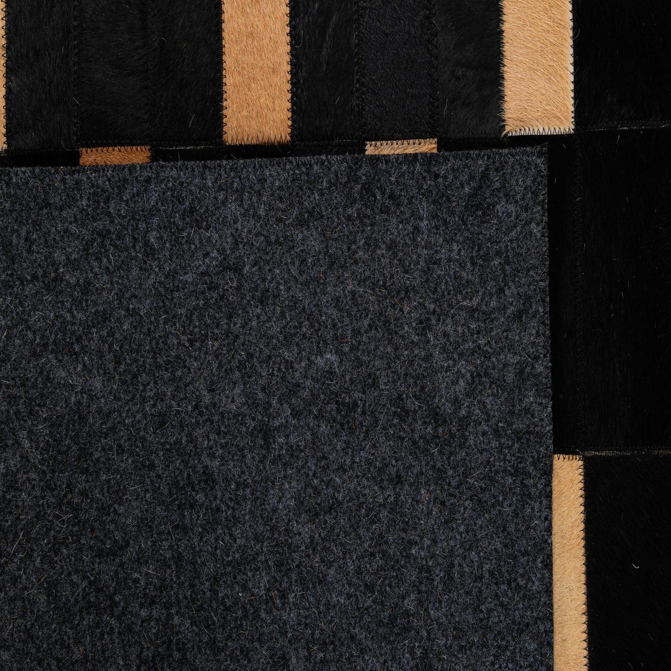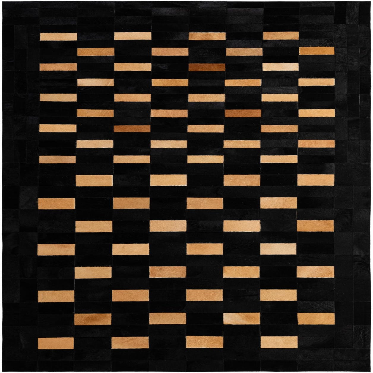 A 5x8 rectangular black and tan cowhide rug with a modern stripe patchwork pattern, ideal for a living room.