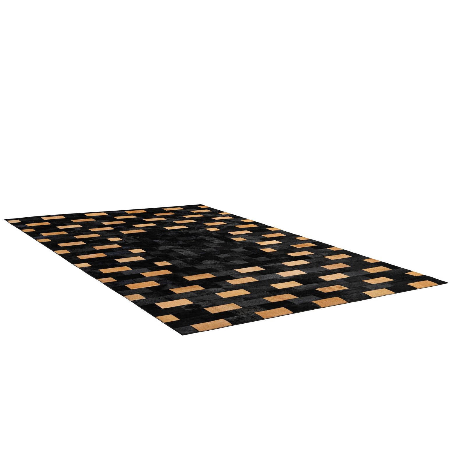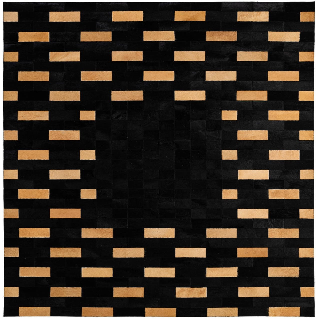A 5x8 rectangular black and tan cowhide rug with a modern stripe patchwork pattern, ideal for a living room.