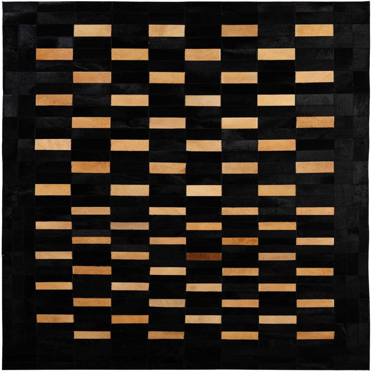 A 5x8 rectangular black cowhide rug with a modern patchwork design, featuring alternating black and light brown rectangular patches.