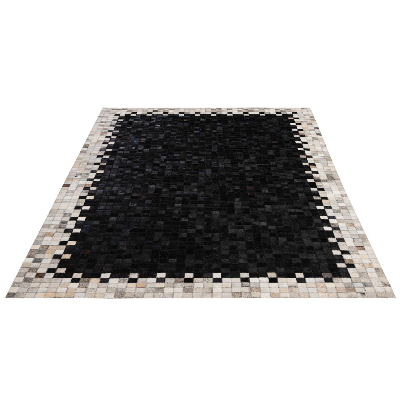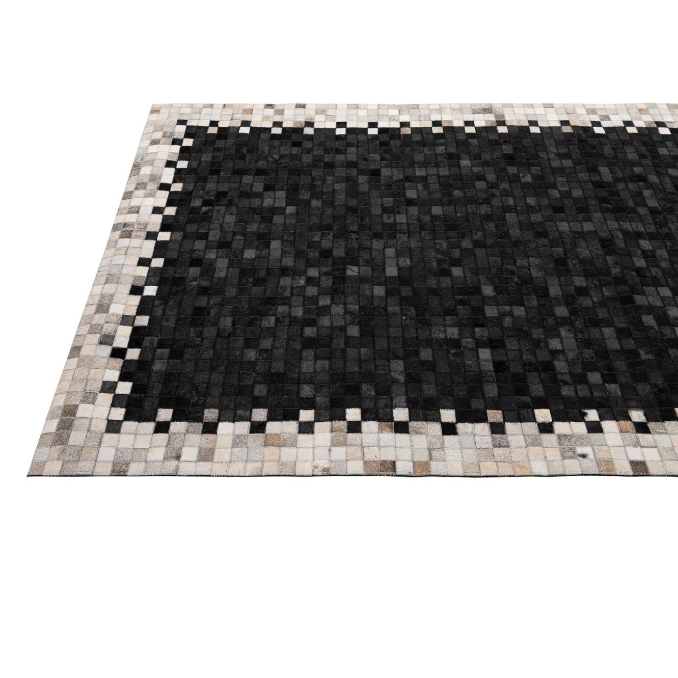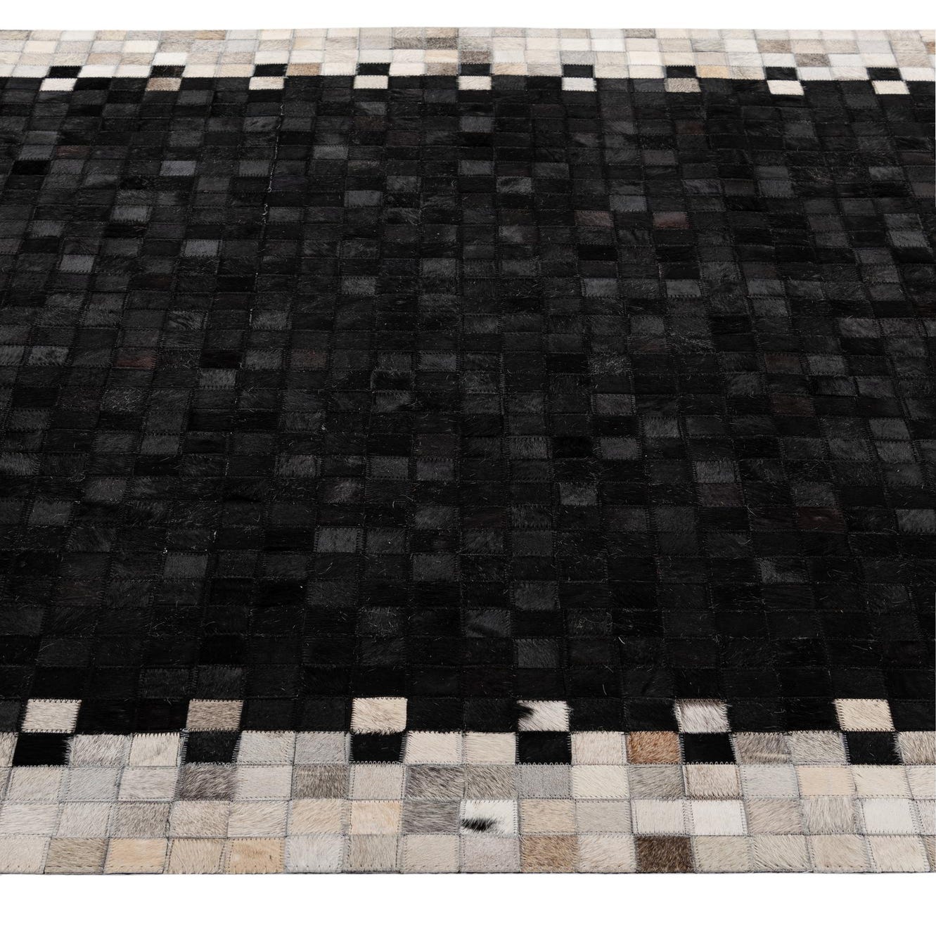 A 5x8 rectangular black cowhide rug with a modern patchwork design and a border of alternating black and white squares.