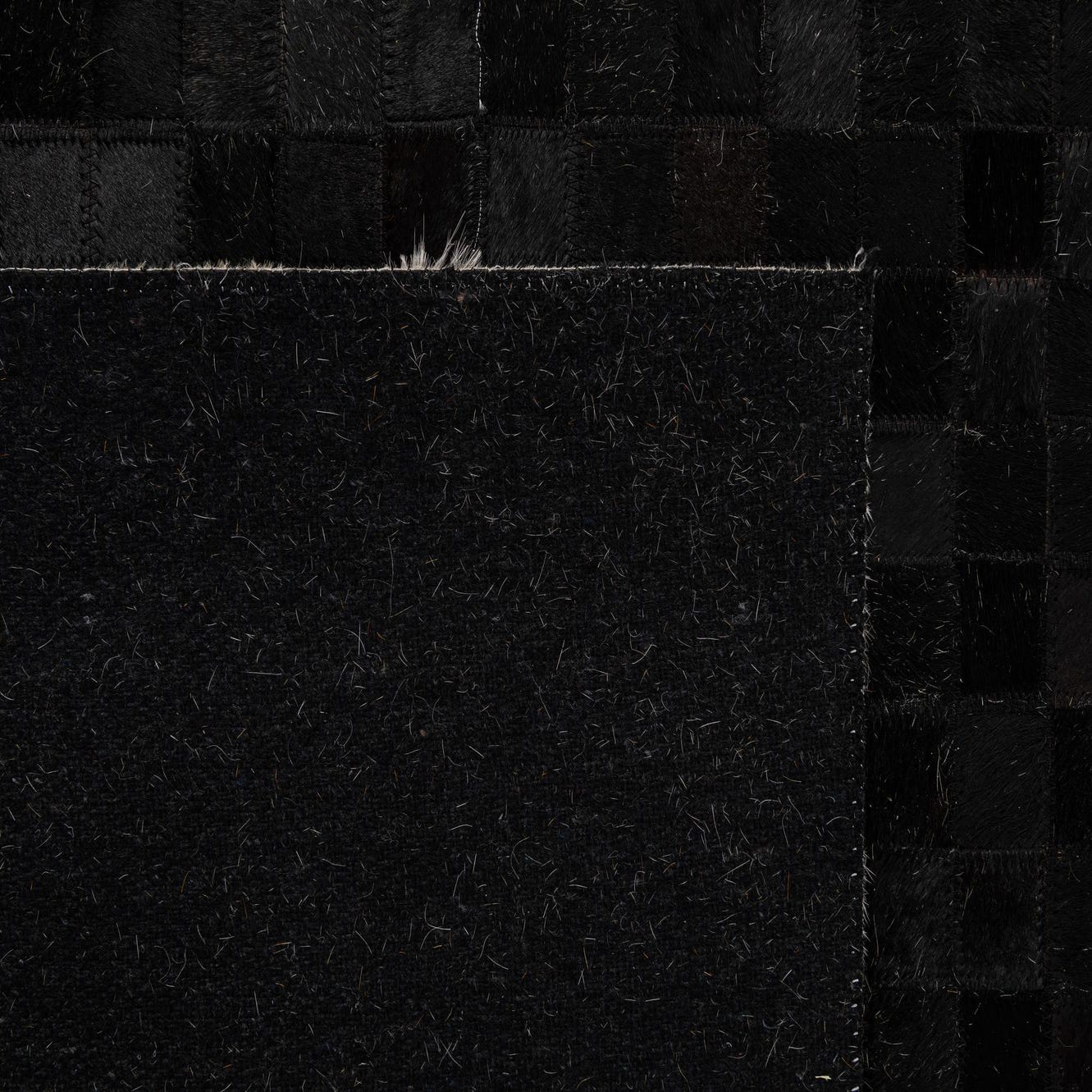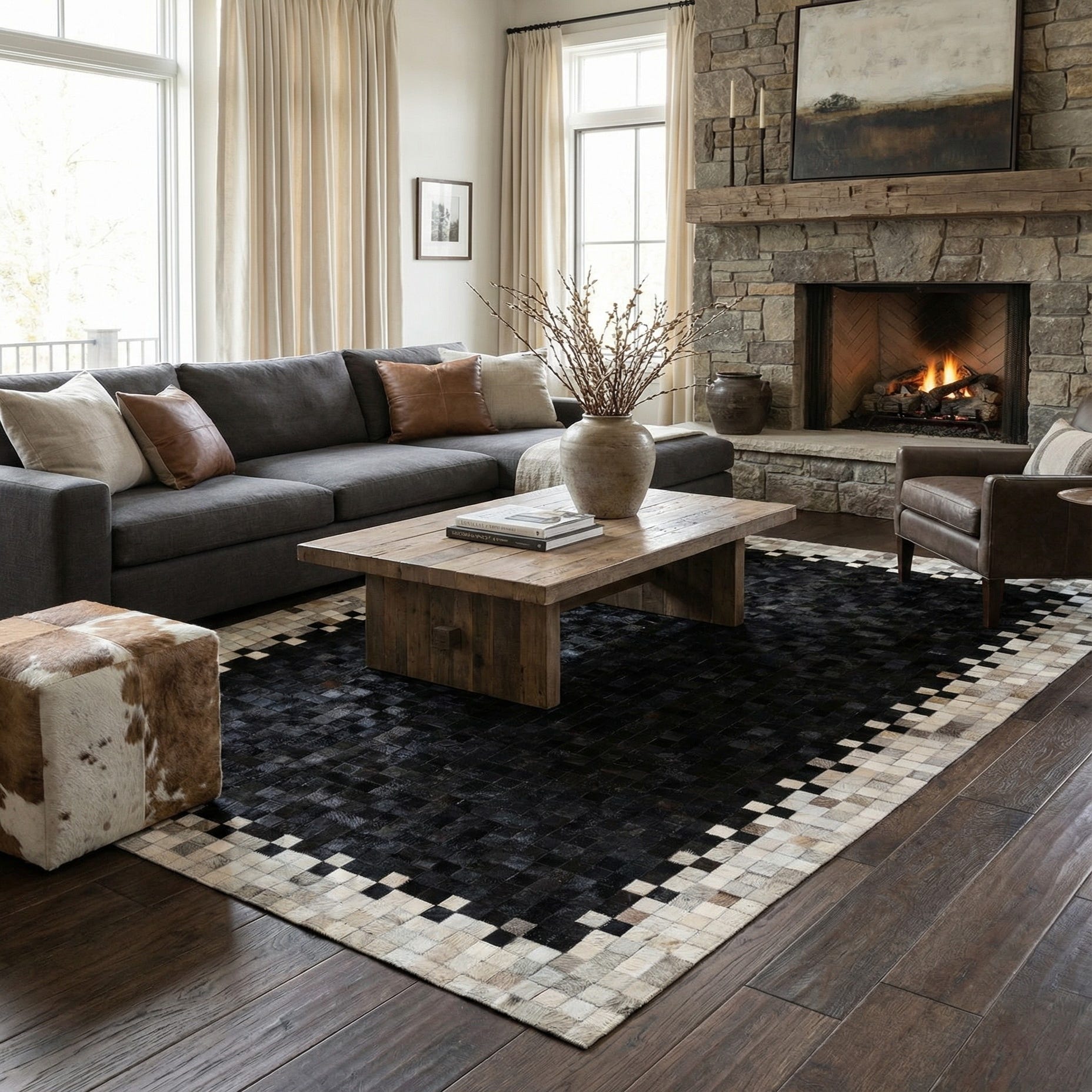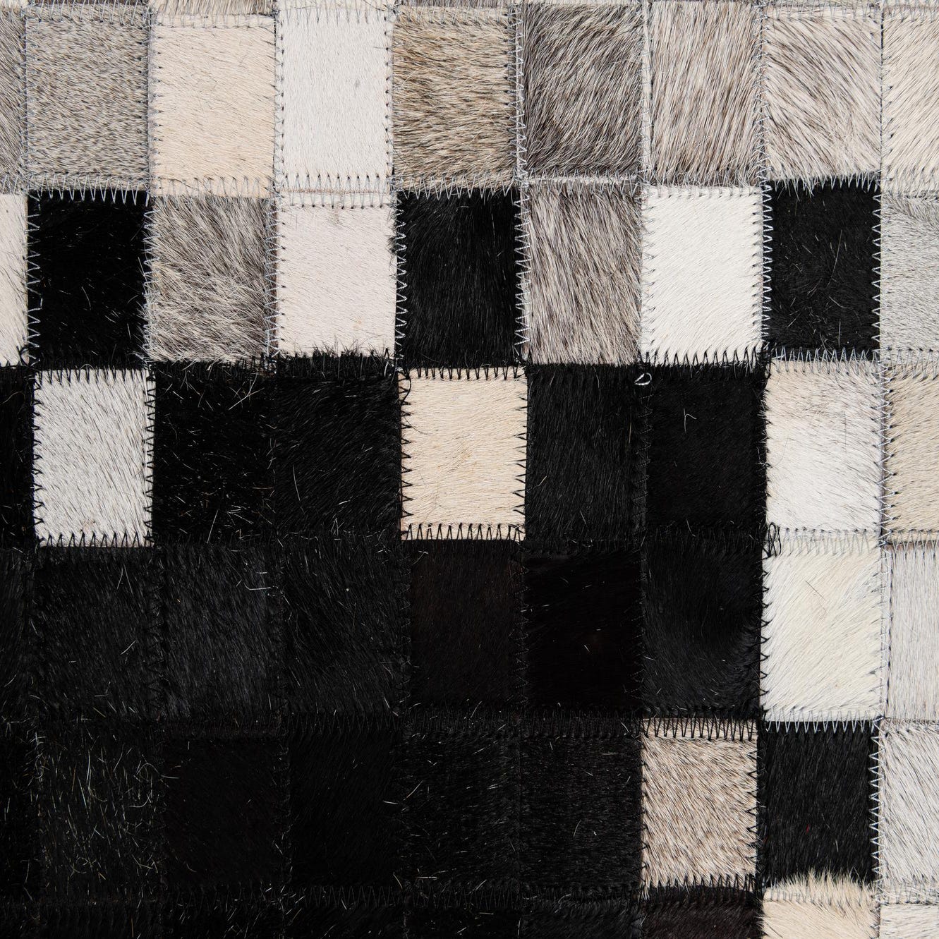 A 5x8 rectangular black cowhide rug with a modern patchwork design and a border of alternating black and white squares.