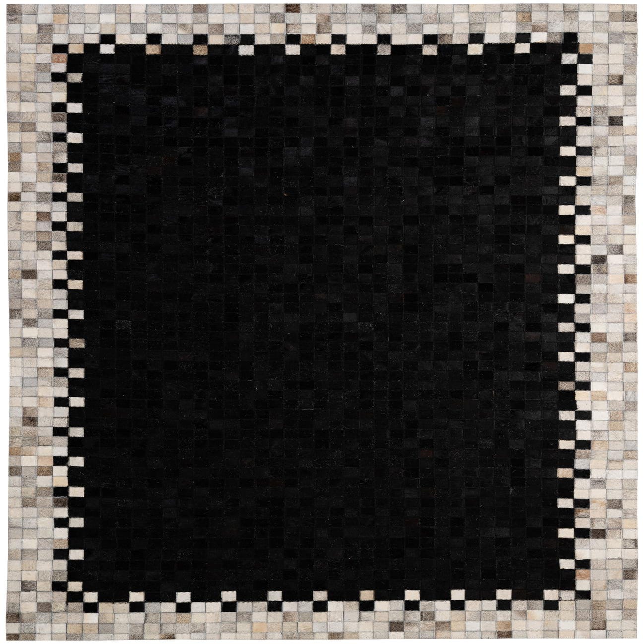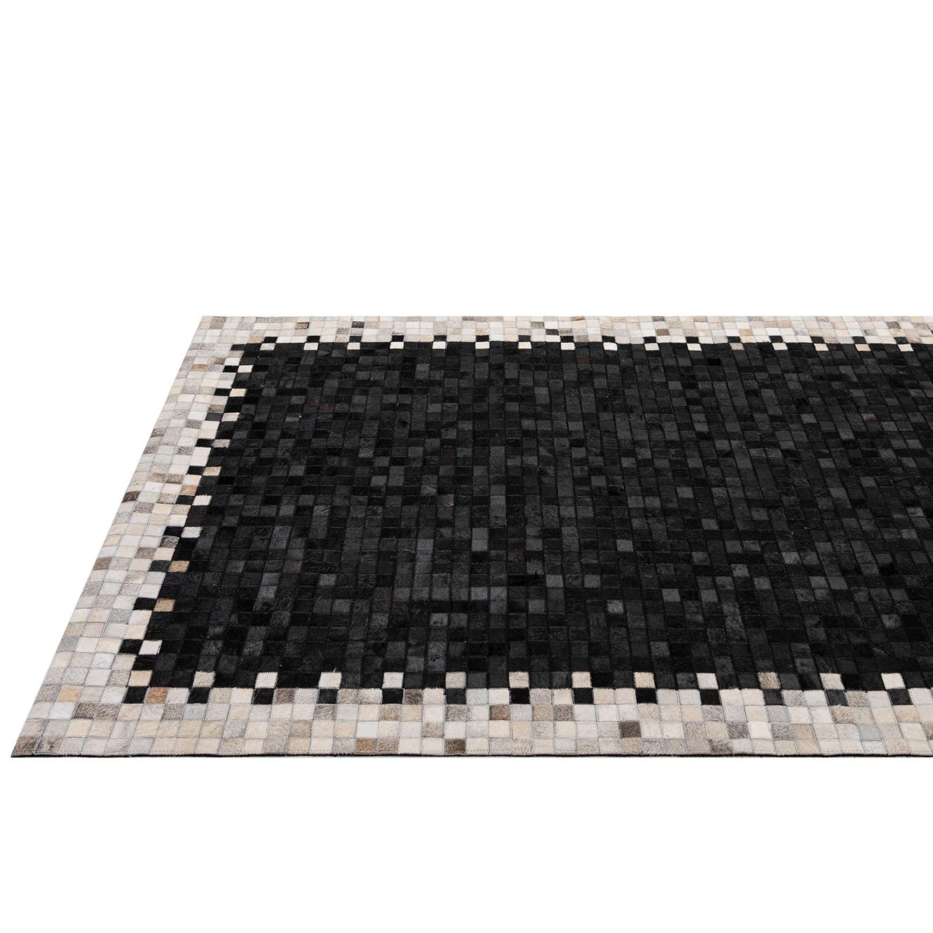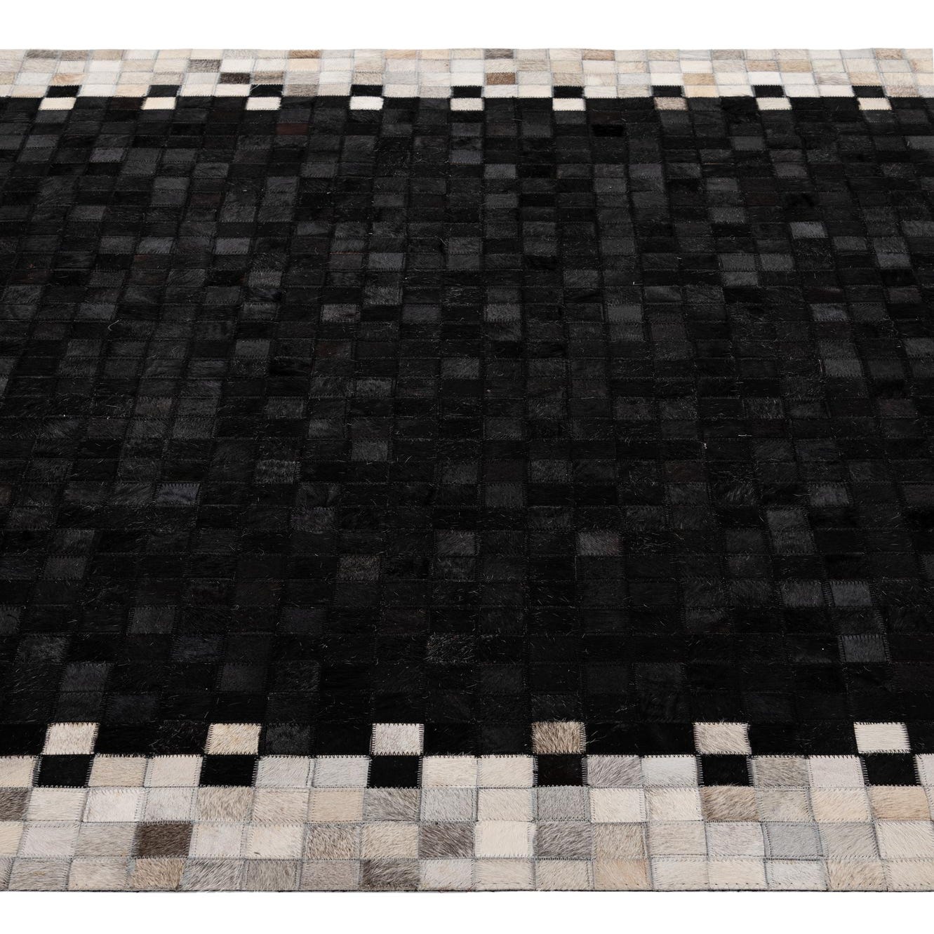 A 5x8 rectangular black cowhide rug with a modern patchwork design and a light grey and white checkered border.