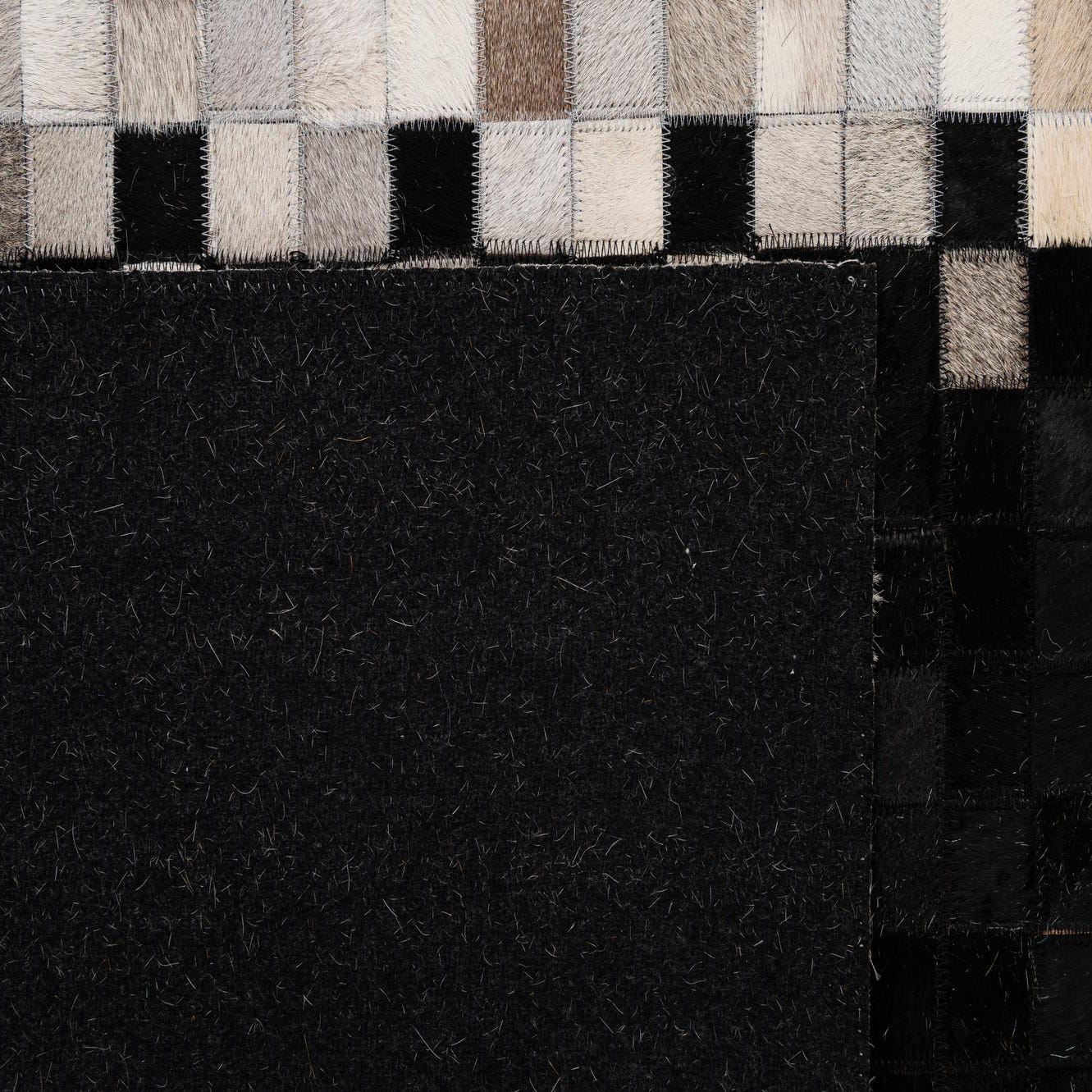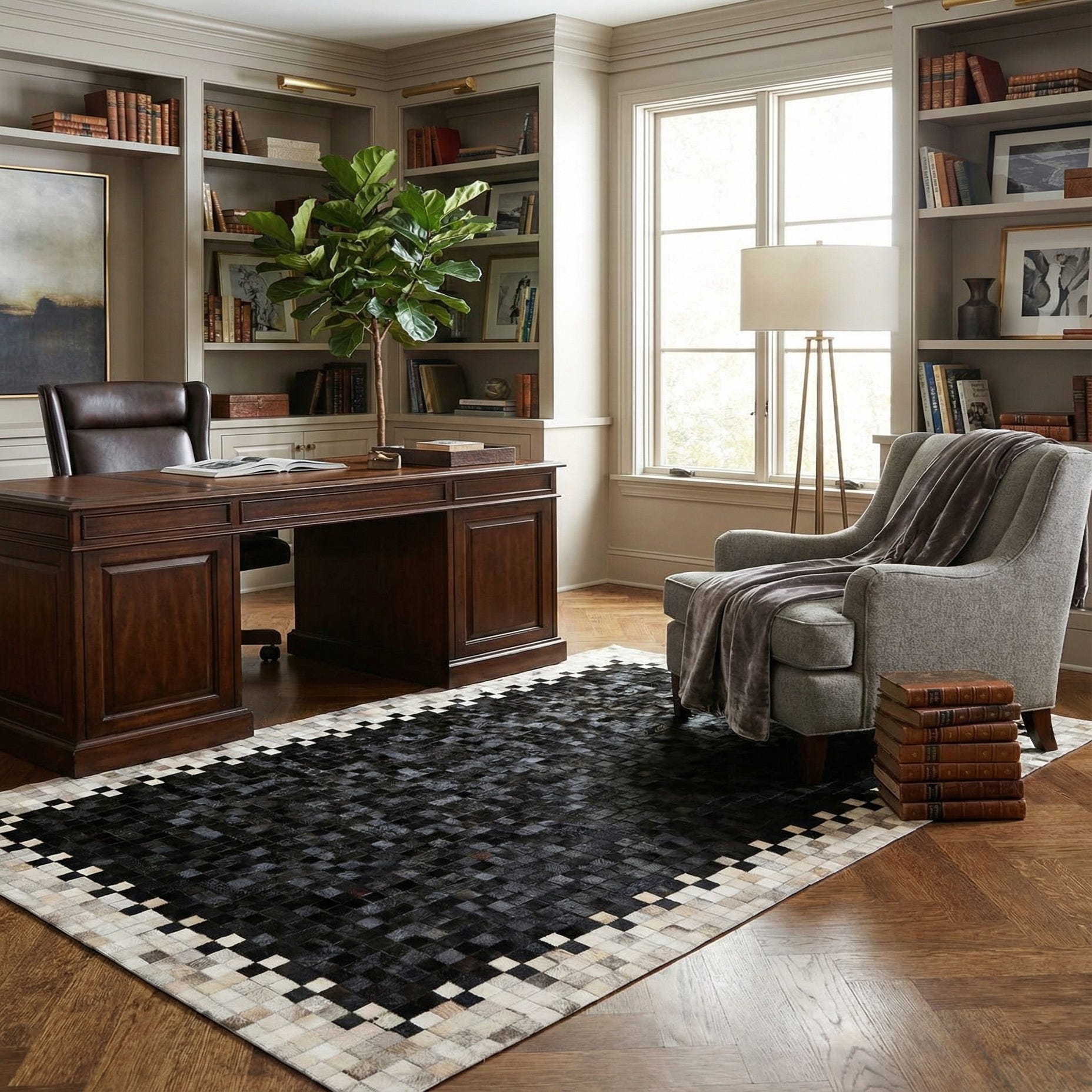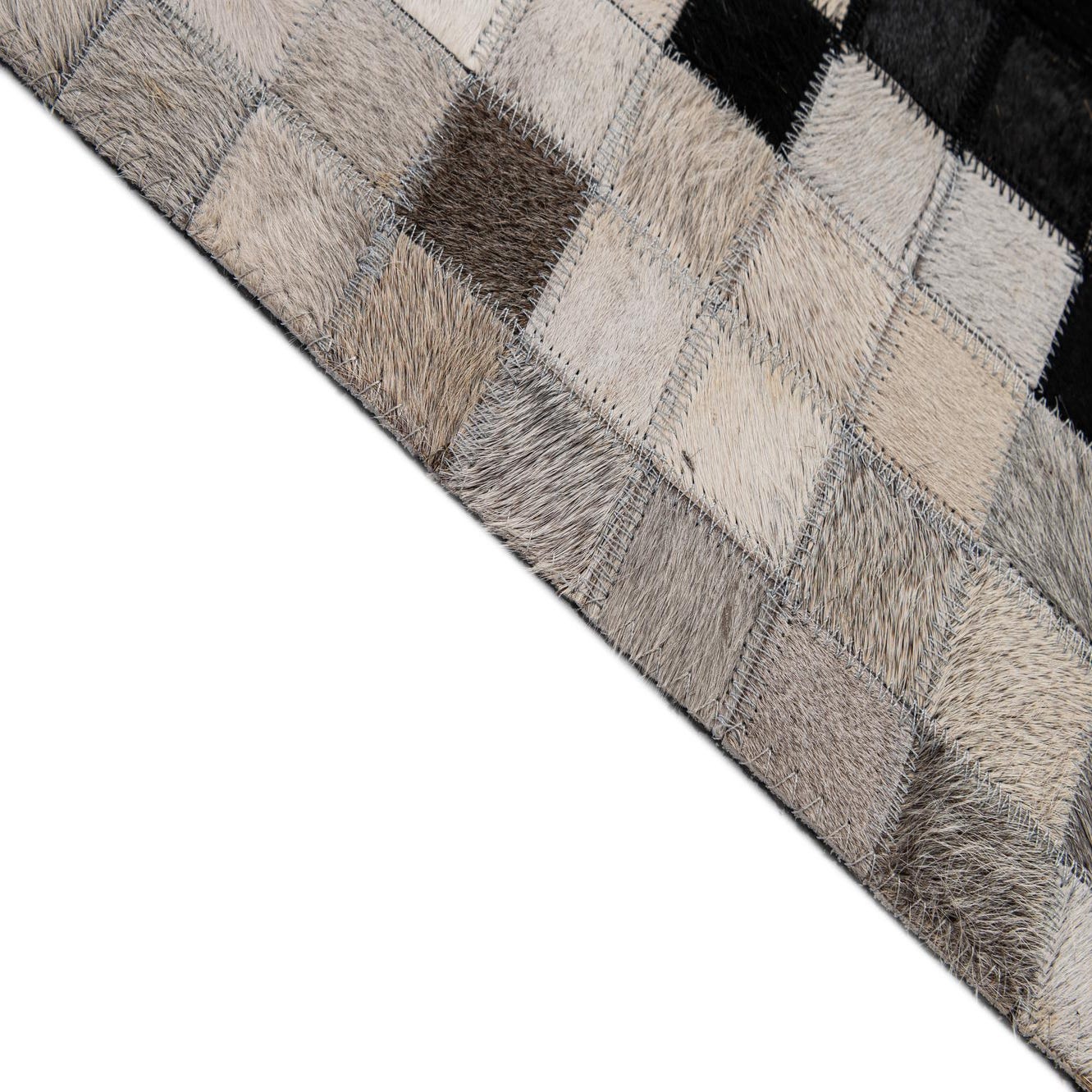 A 5x8 rectangular black cowhide rug with a modern patchwork design and a light grey and white checkered border.