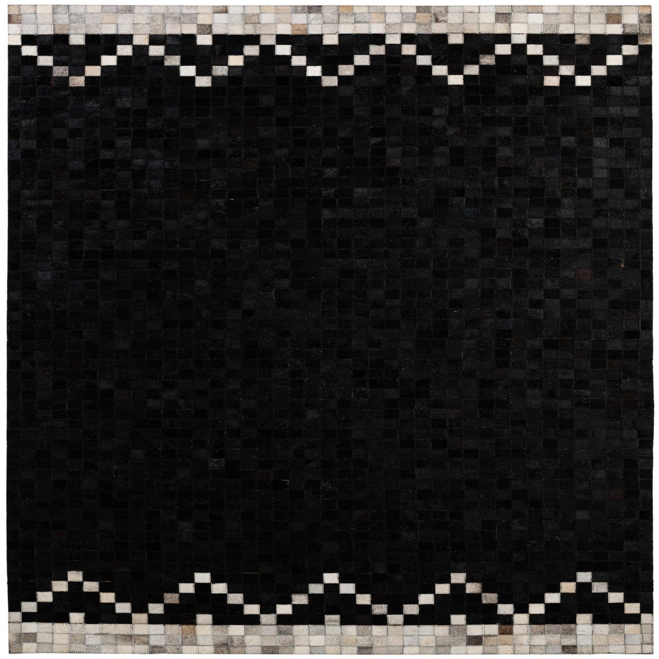 A 5x8 rectangular black cowhide rug with a modern patchwork design and a contrasting light gray and white geometric border.