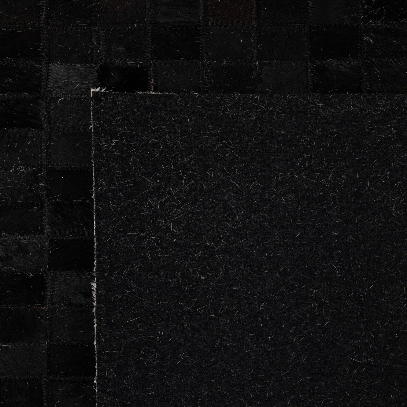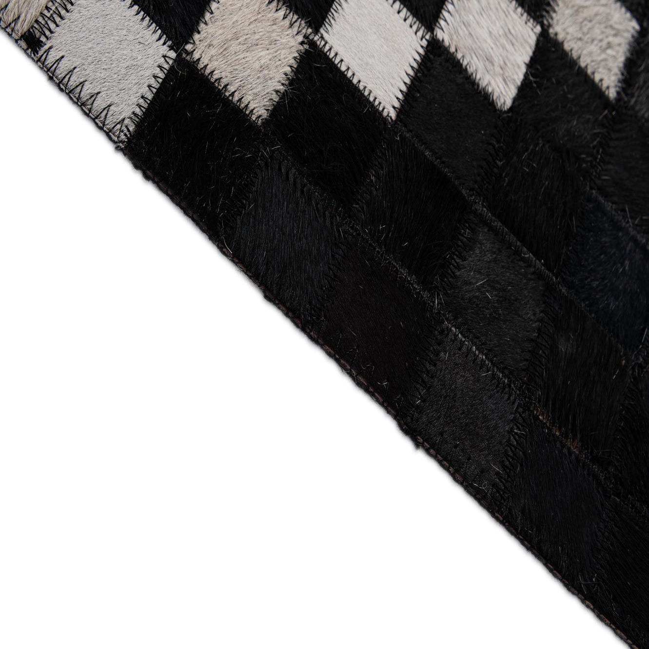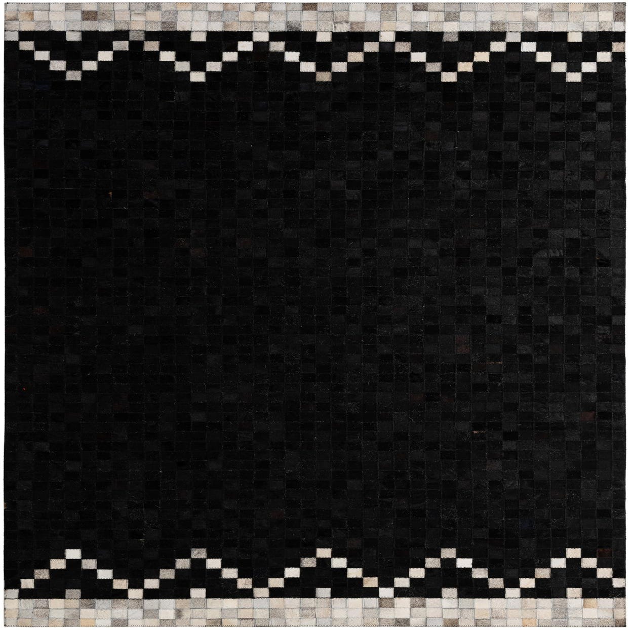 A 5x8 rectangular black cowhide rug with a modern patchwork design and a zigzag border of light and dark squares.