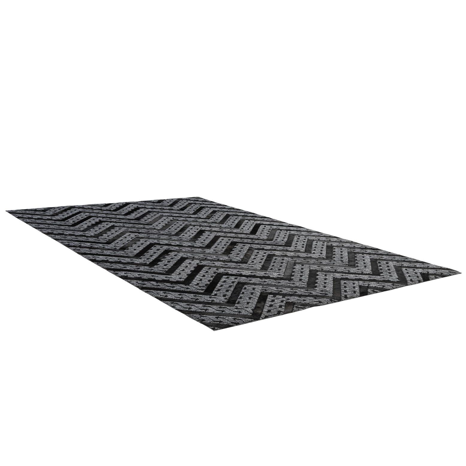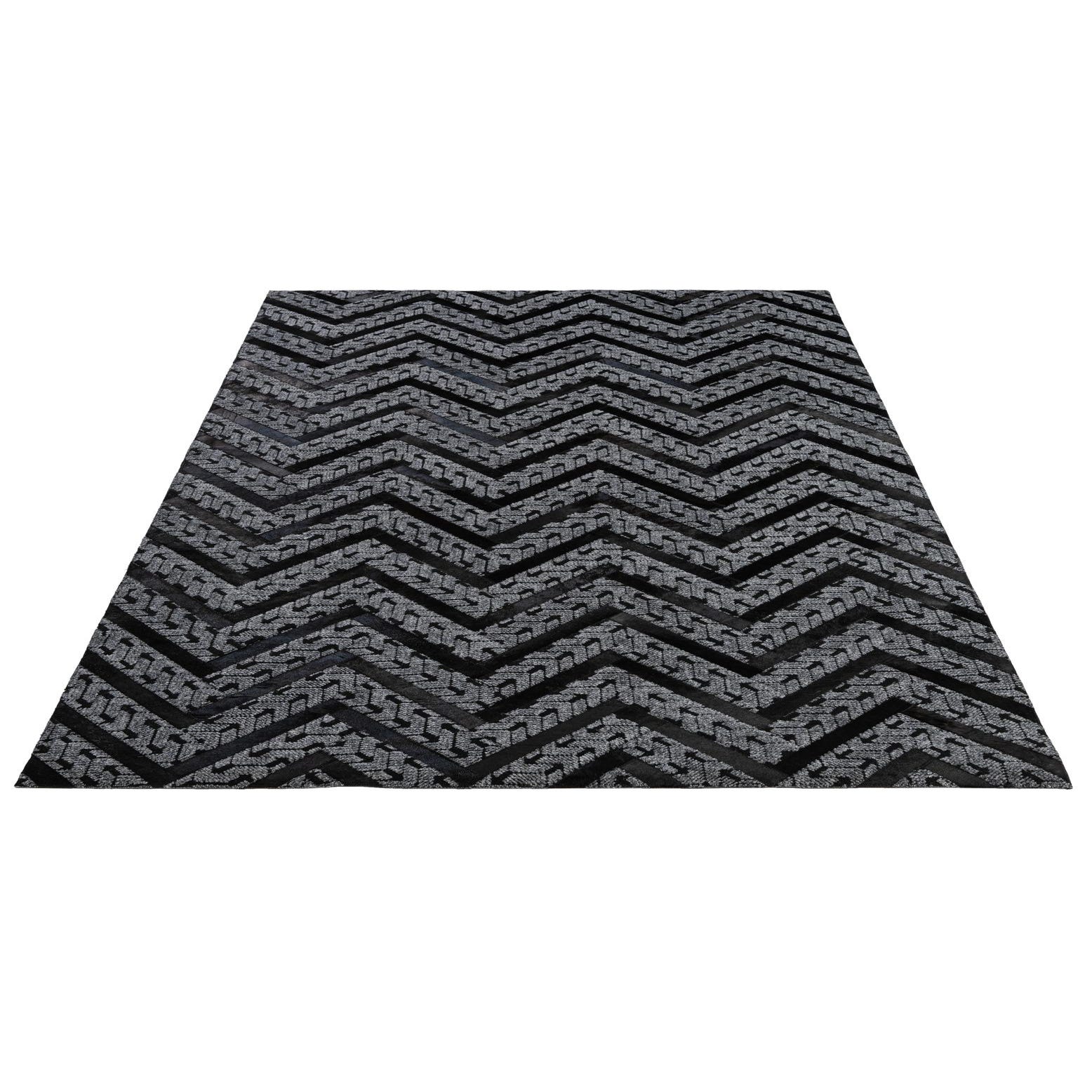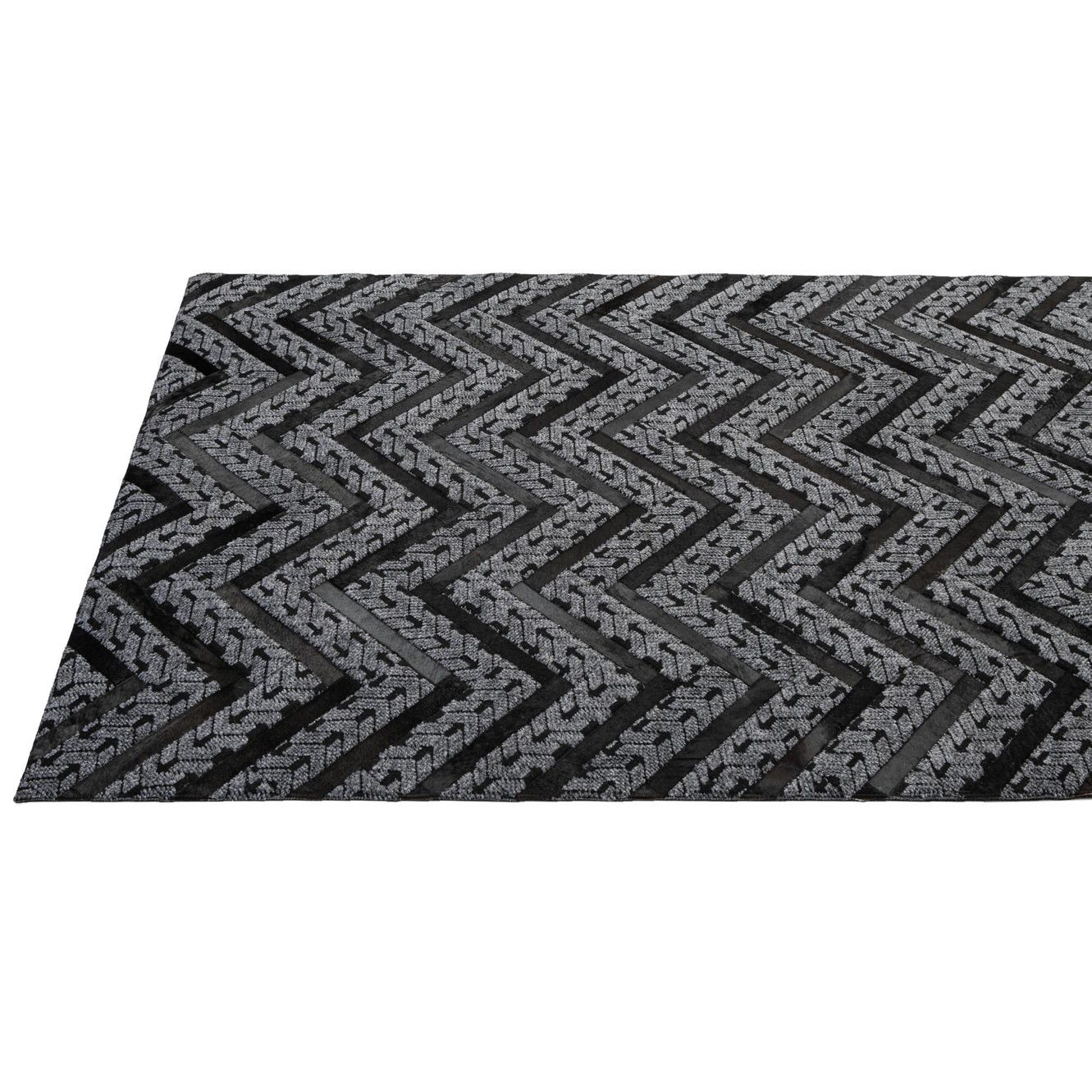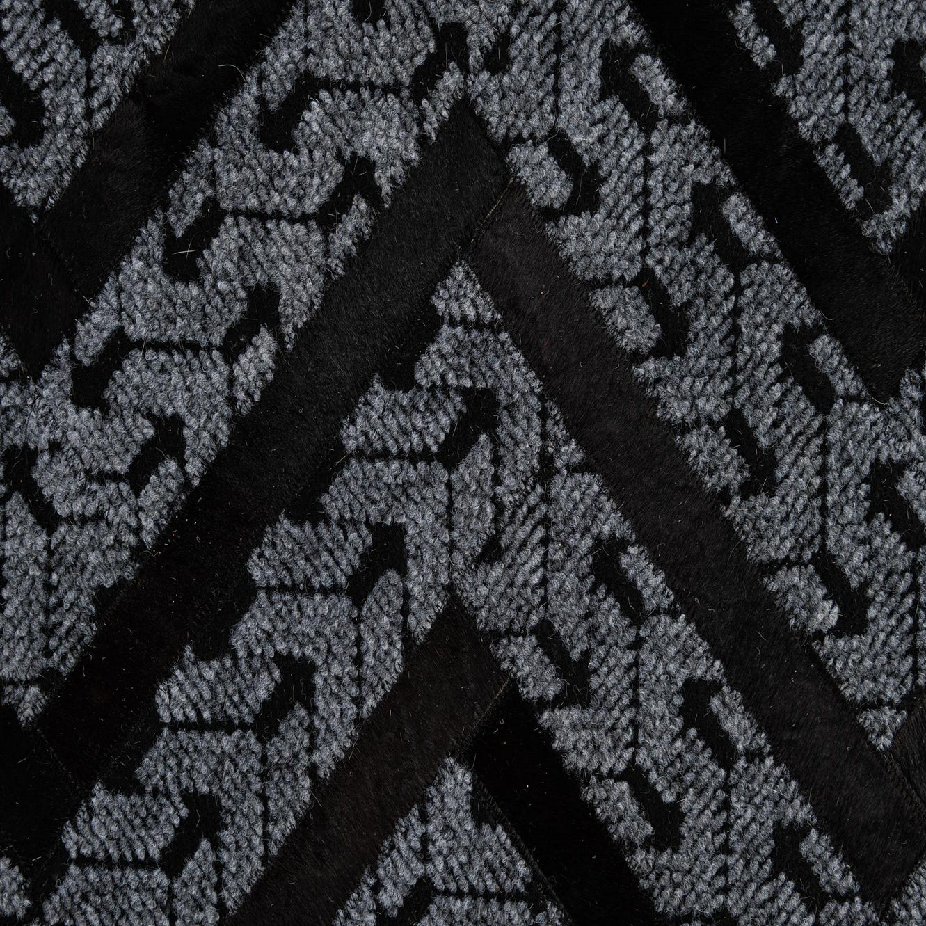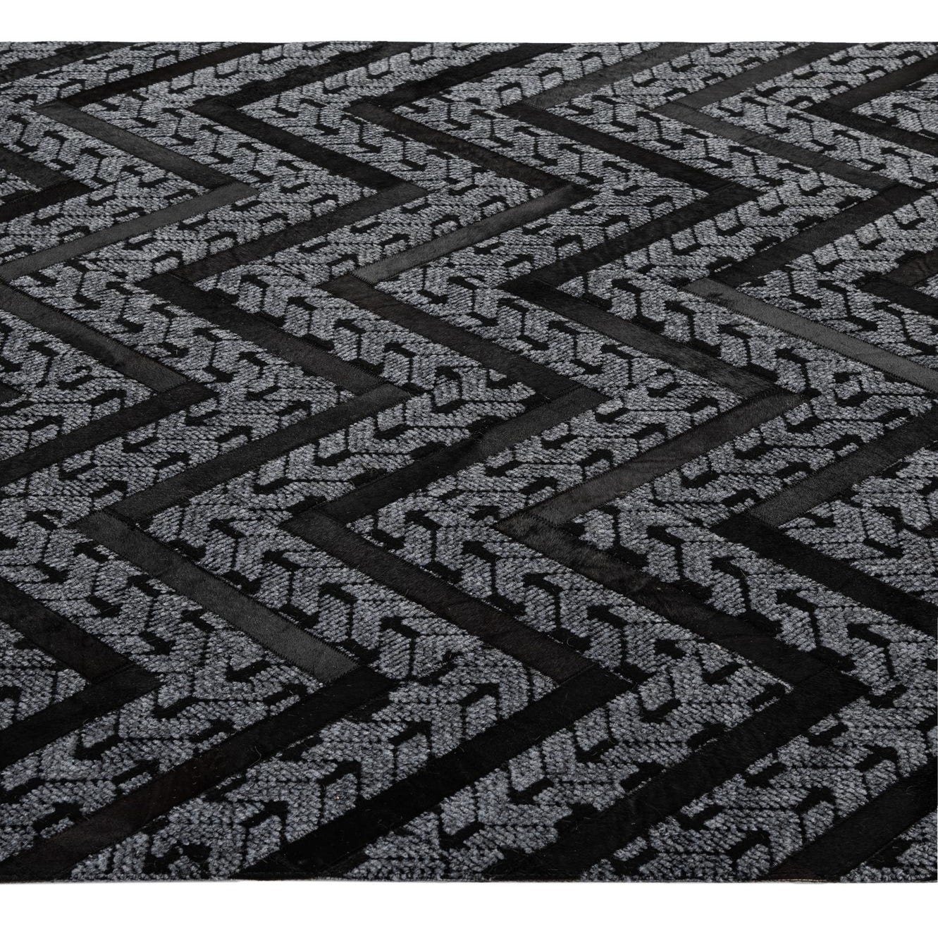 A bold chevron pattern cuts across a deep black background in contrasting gray, forming a rhythmic, geometric layout with an inner braided motif that adds visual interest. Hand made of cowhide and leather, the surface offers a tactile contrast: soft, hair-on hide sections alternate with smoother leather strips, creating subtle variations in sheen and pile that you can feel beneath your fingertips. The patchwork construction gives each chevron a slightly sculpted look, so the rug reads modern with a handcrafted presence.