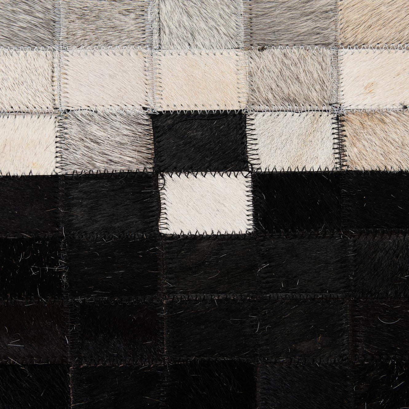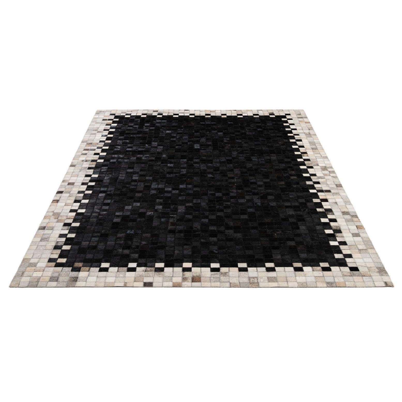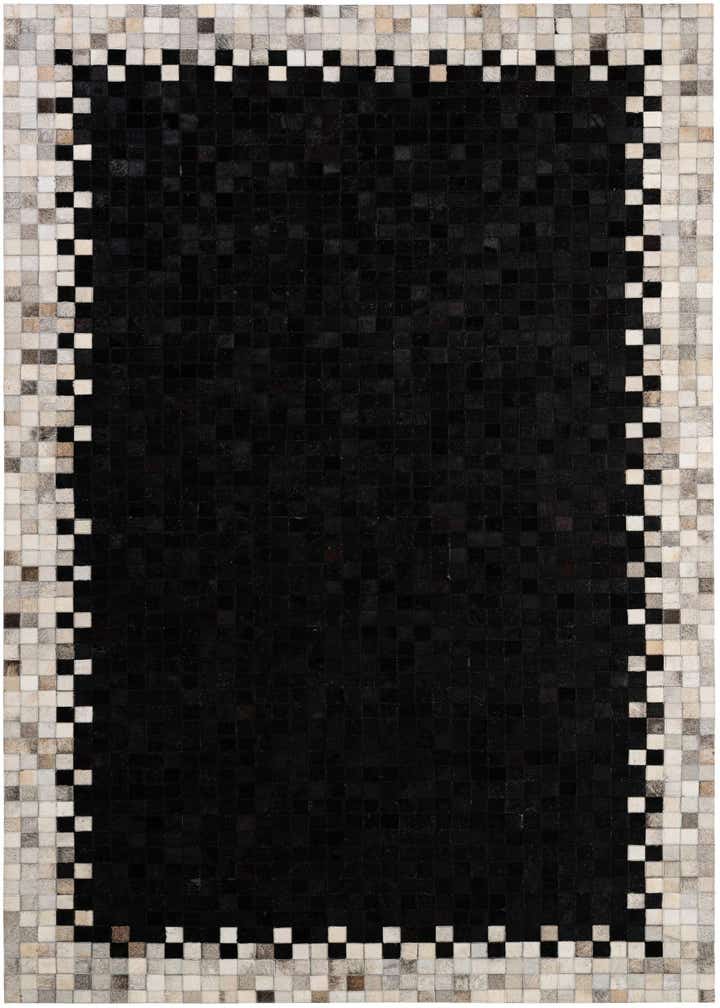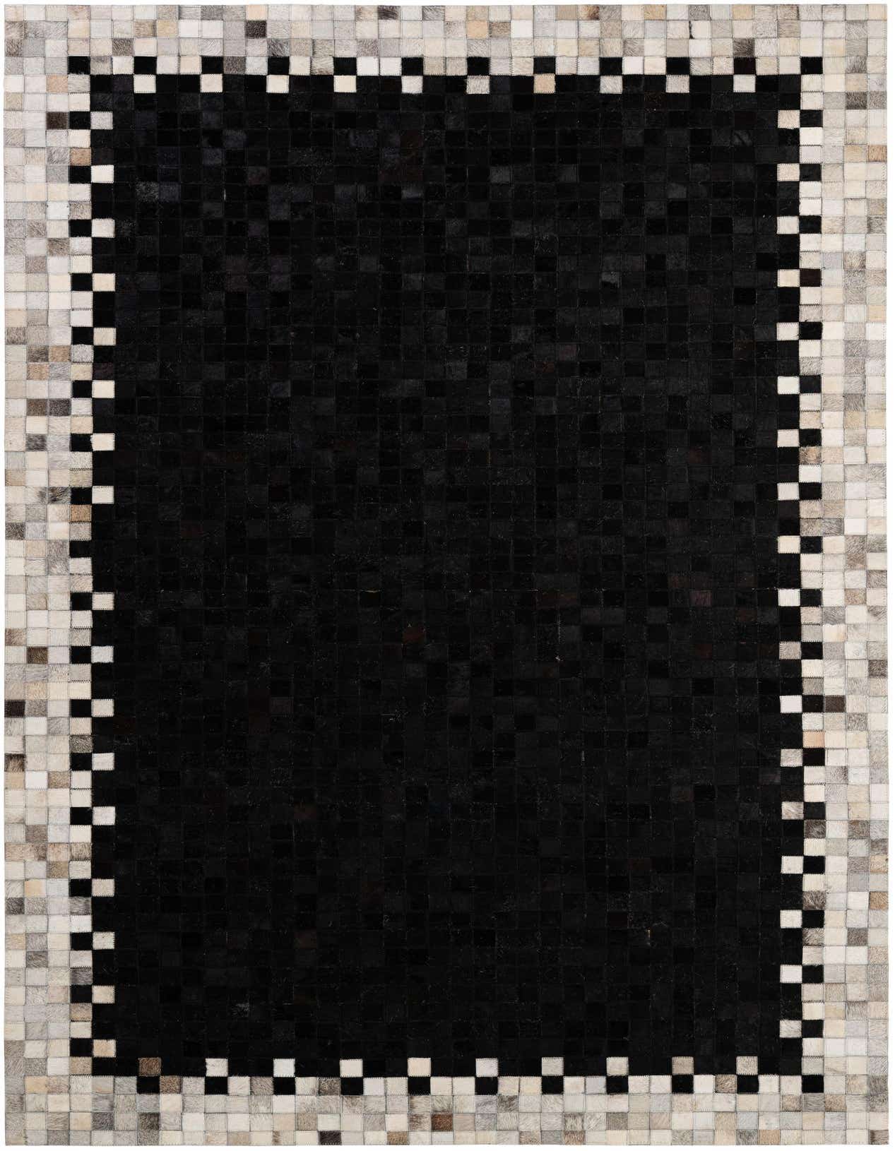 A 5x8 rectangular black modern cowhide rug with a checkered border of black, white, and gray squares.