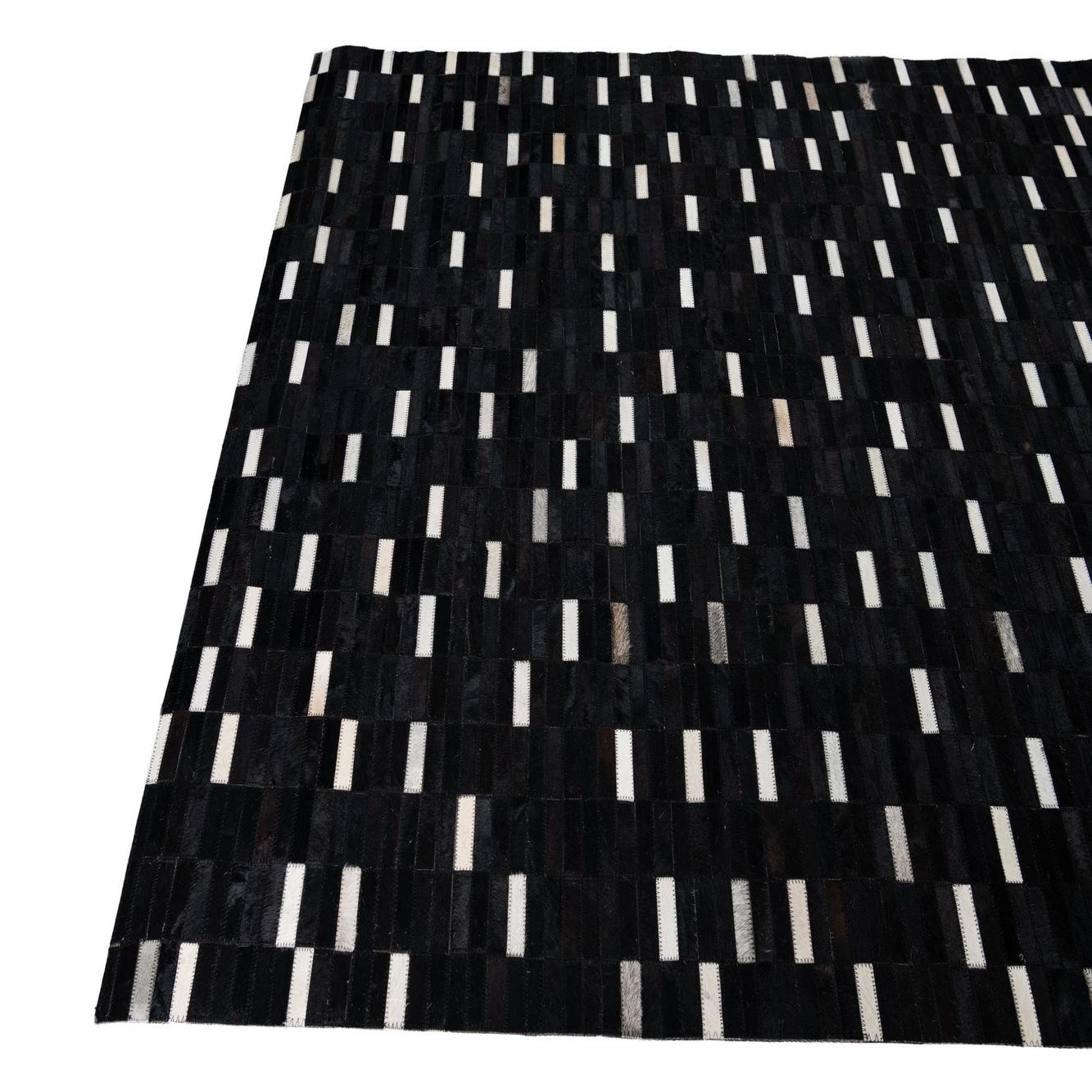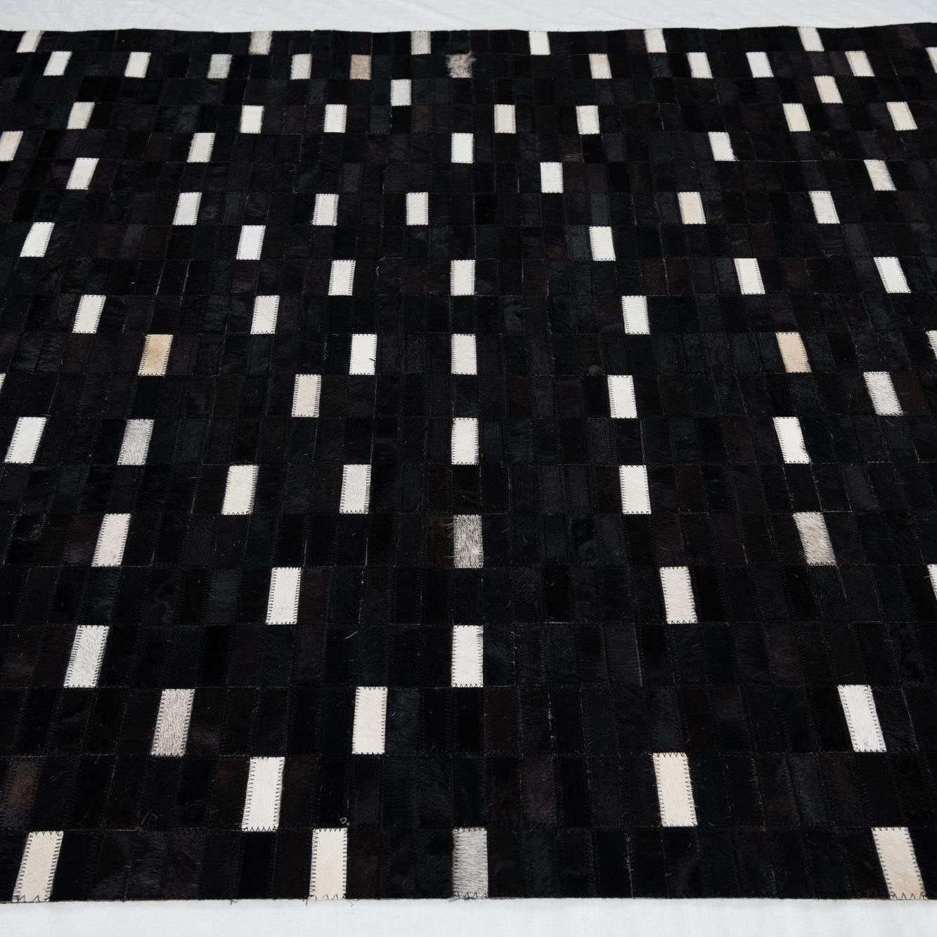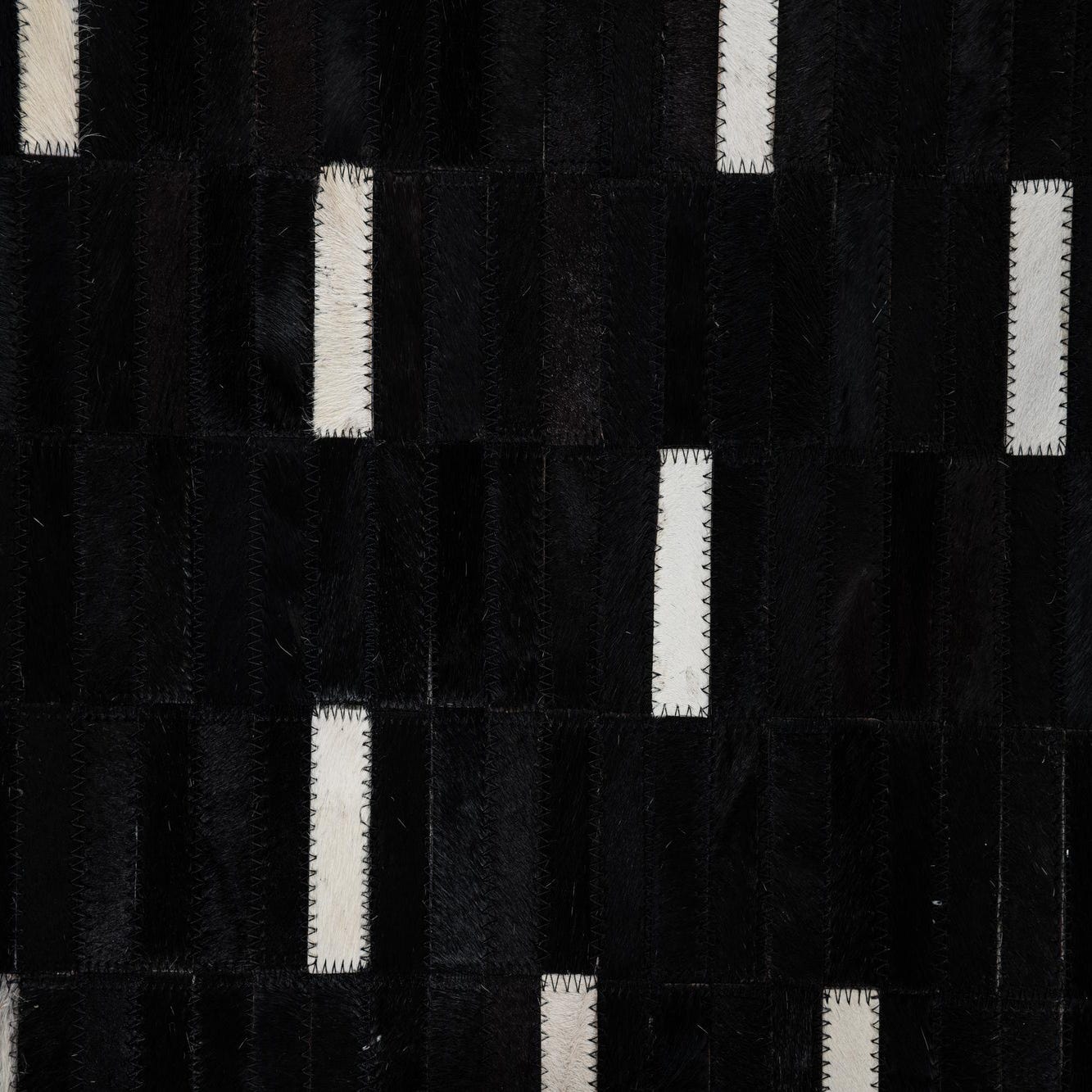 Hand made of cowhide and leather, this rug is crafted from a tight patchwork of rectangular hide panels set against a deep black ground. Short horizontal bars of ivory and gray are rhythmically scattered across the surface, creating a subtle, pixel-like geometric pattern. The hide has a low, velvety nap and a gentle sheen that catches light, while the visible stitching between panels adds a tactile, handcrafted detail you can feel underfoot.