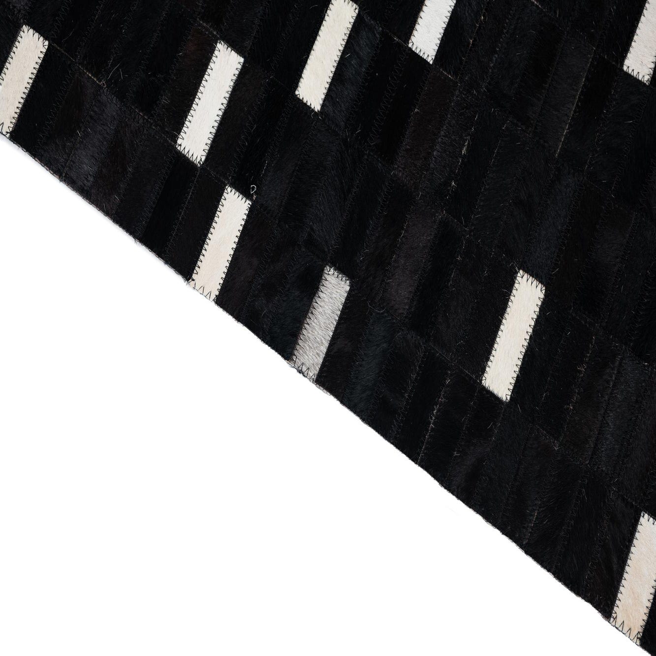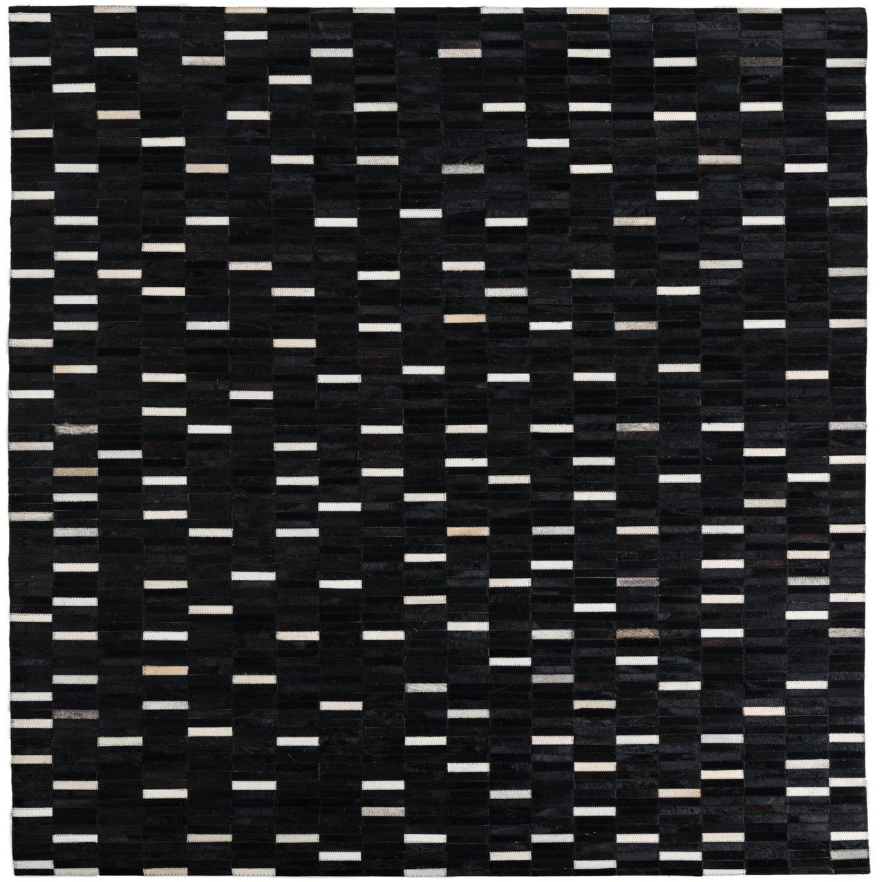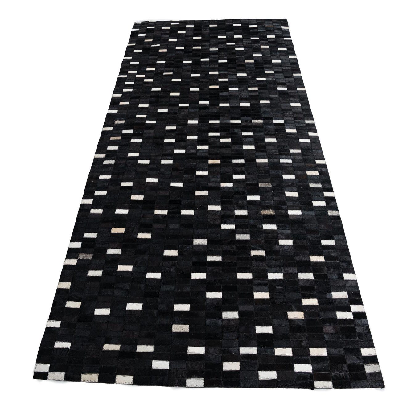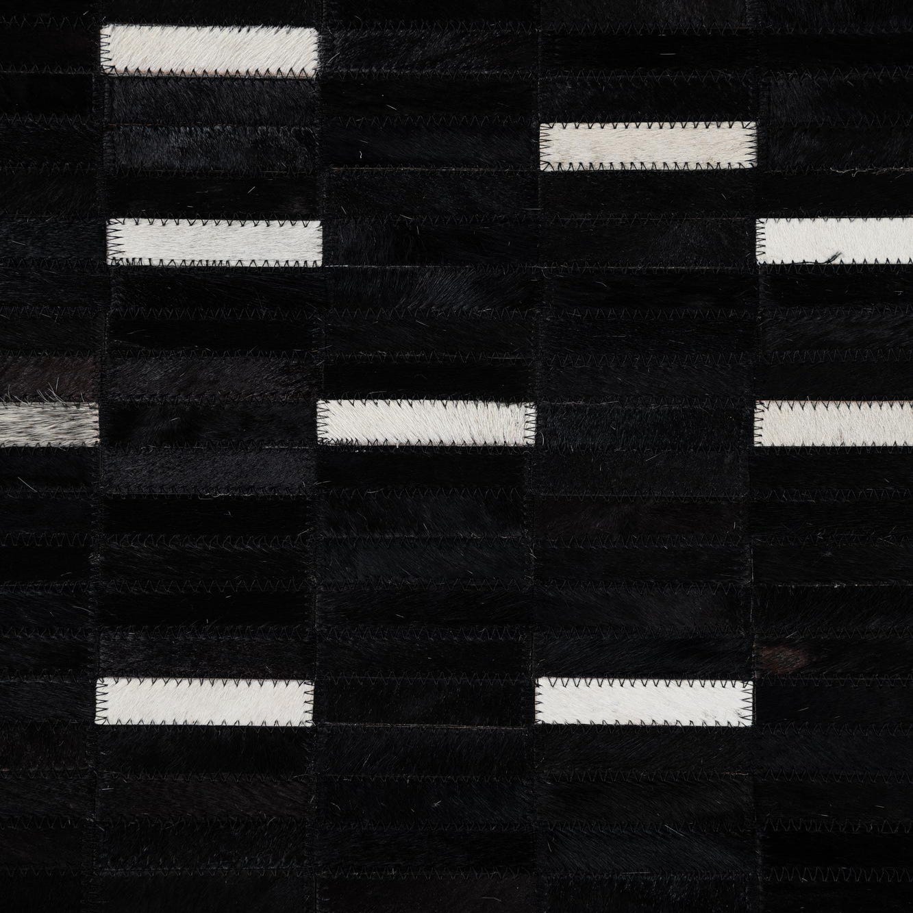 Hand made of cowhide and leather, this rug is crafted from a tight patchwork of rectangular hide panels set against a deep black ground. Short horizontal bars of ivory and gray are rhythmically scattered across the surface, creating a subtle, pixel-like geometric pattern. The hide has a low, velvety nap and a gentle sheen that catches light, while the visible stitching between panels adds a tactile, handcrafted detail you can feel underfoot.