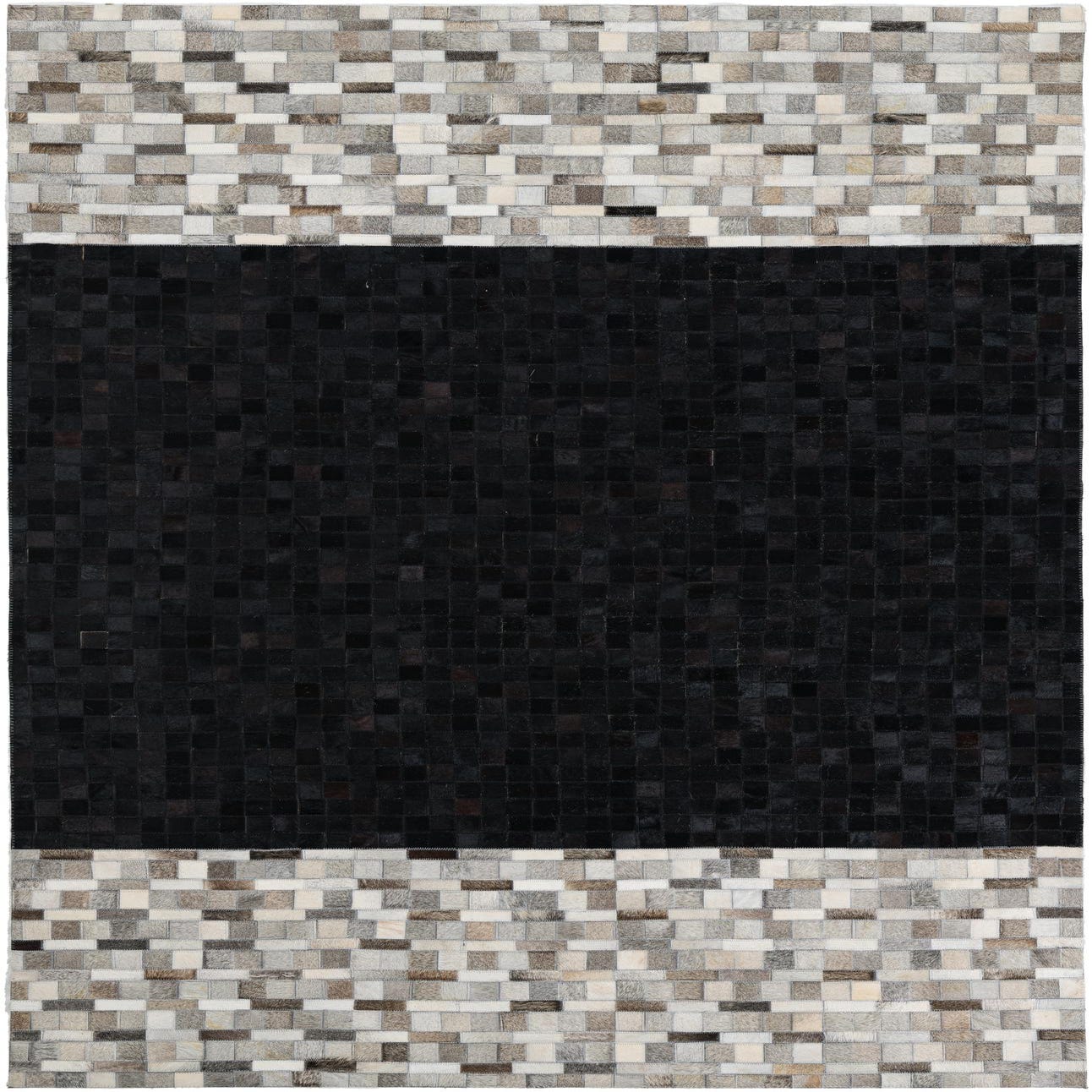 A 5x8 rectangular Cowhide Leather rug featuring a large central black panel flanked by grey and white patchwork borders.