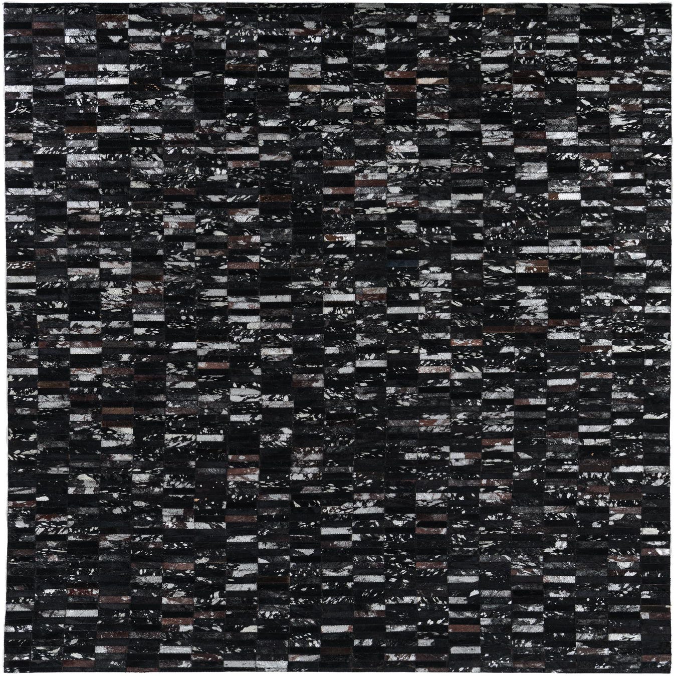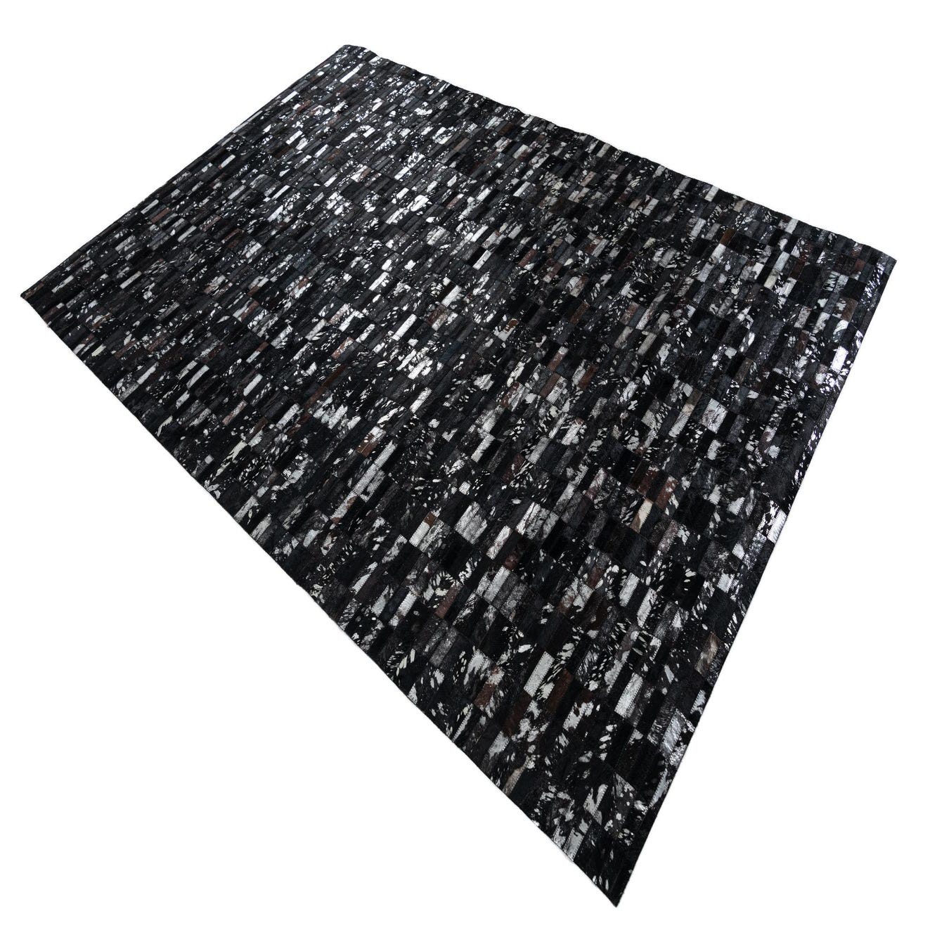 A rectangular 5x8 Cowhide Leather rug featuring a modern striped pattern in various shades of black, white, and brown.