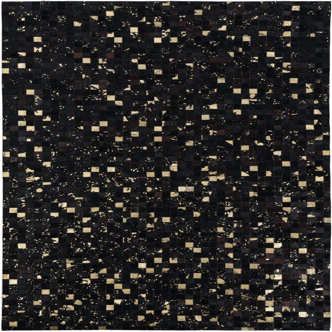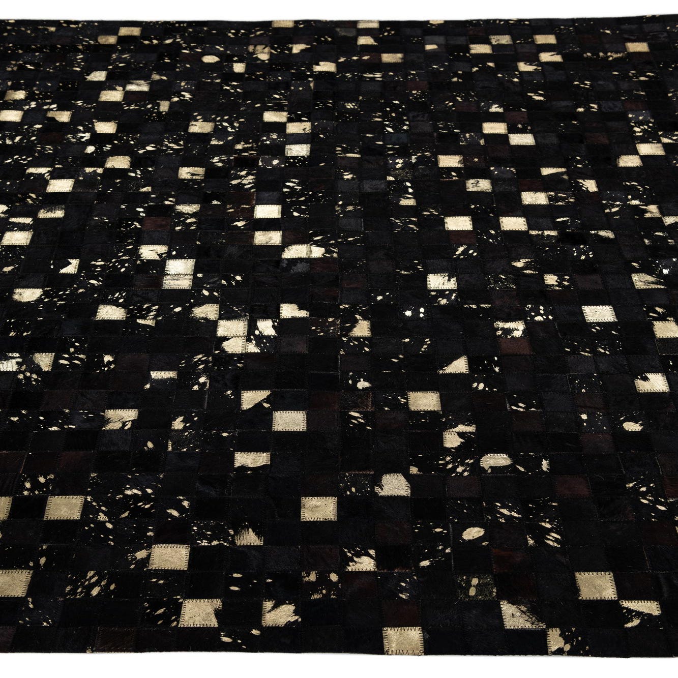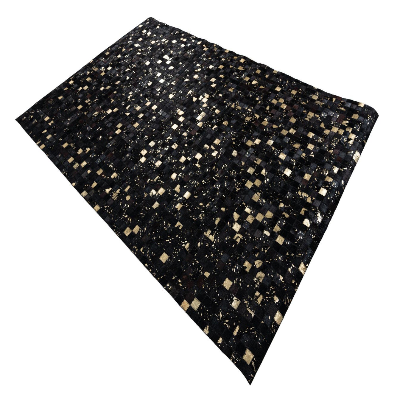 A 5x8 rectangular black cowhide and leather rug with a modern, abstract pattern of gold metallic squares and splatters.