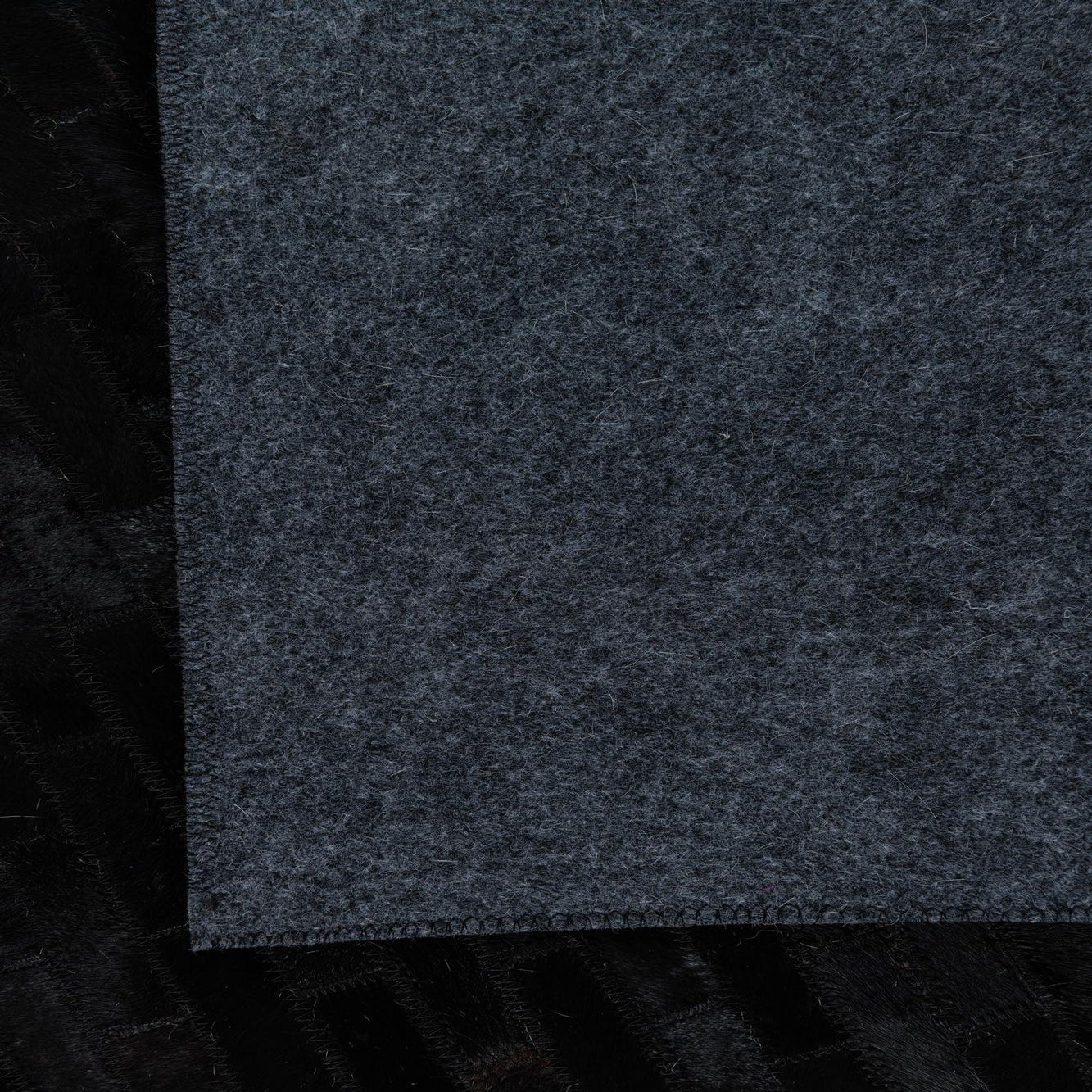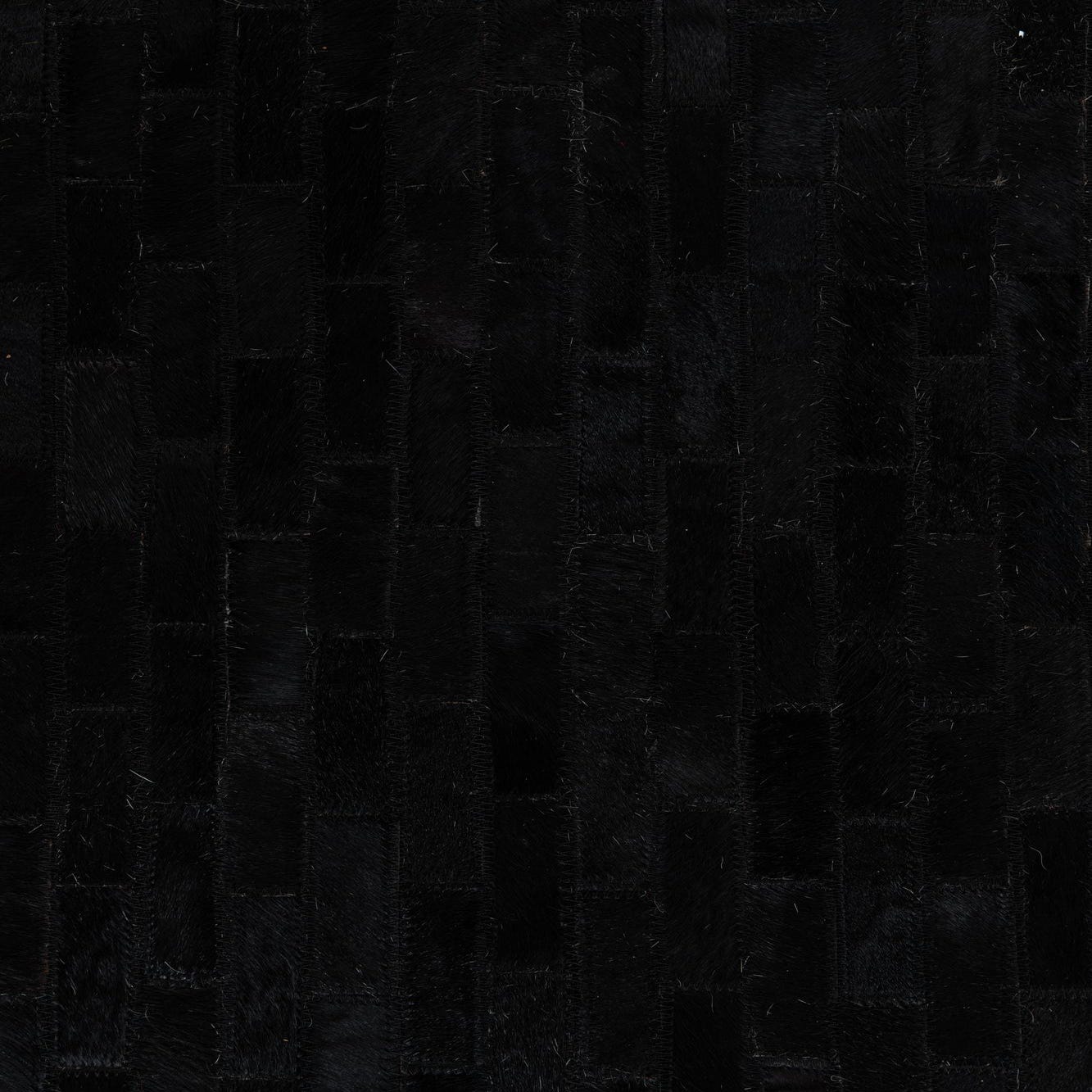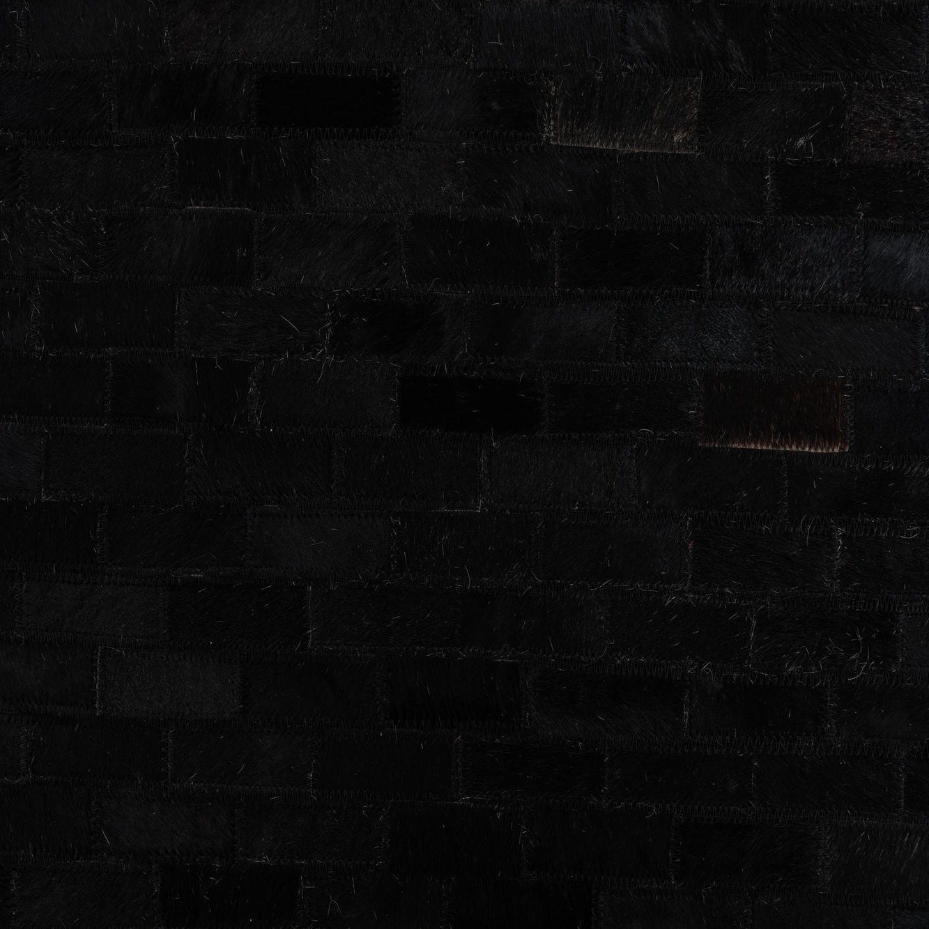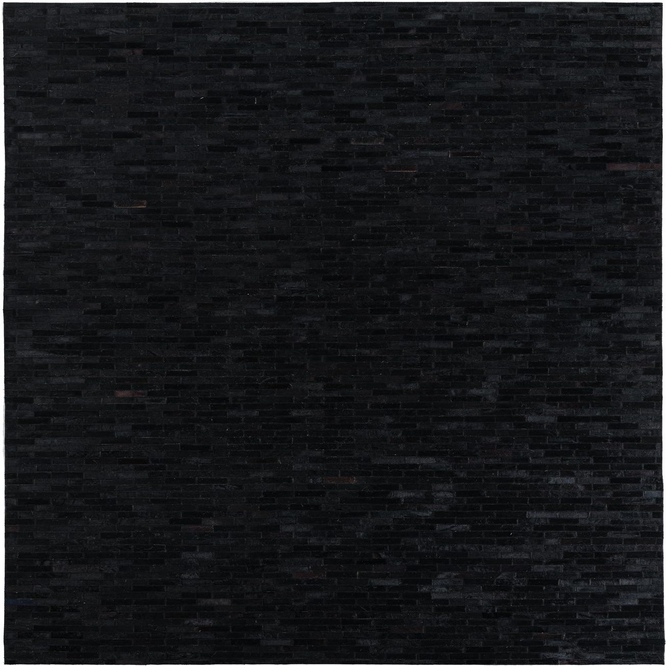 A 5x8 rectangular black cowhide leather rug with a subtle striped modern pattern, suitable for a living room.