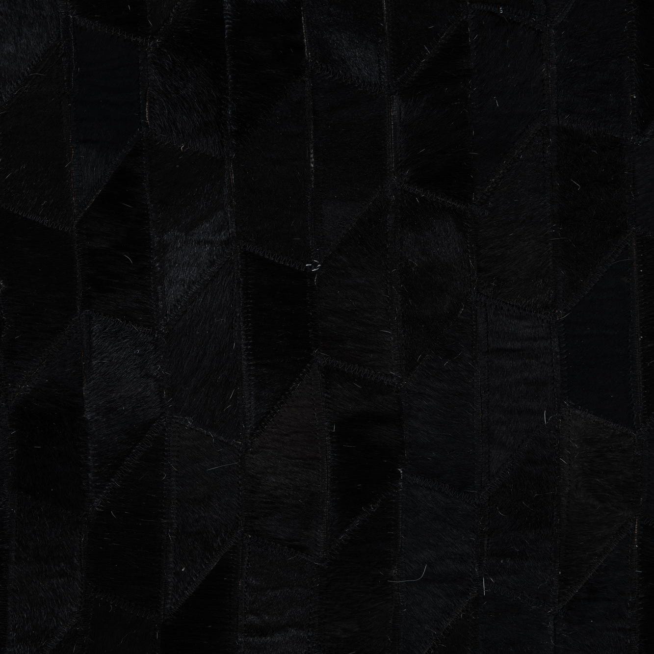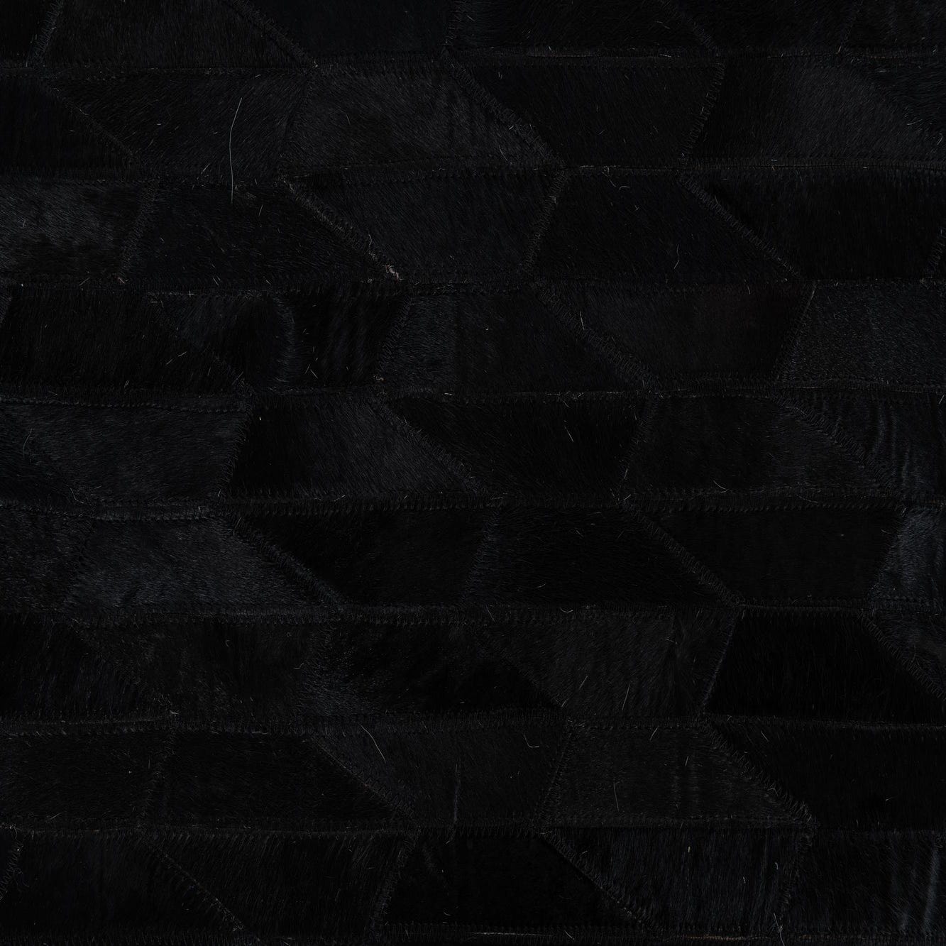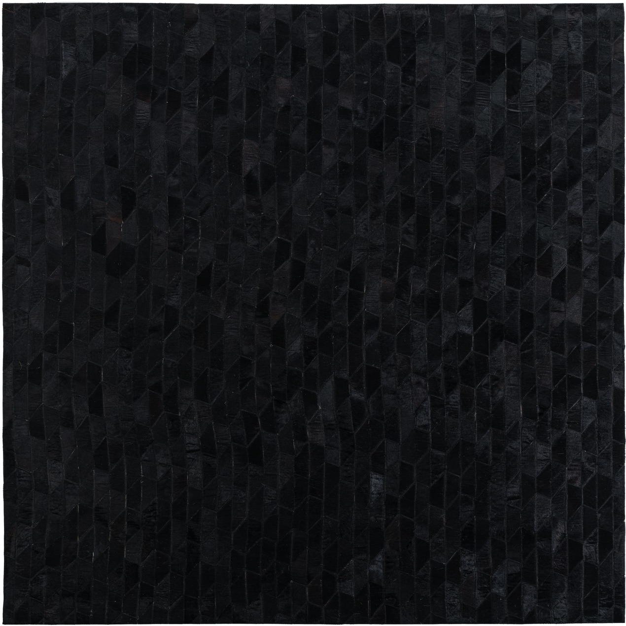A 5x8 rectangular black cowhide leather rug with a modern striped pattern, ideal for a living room.