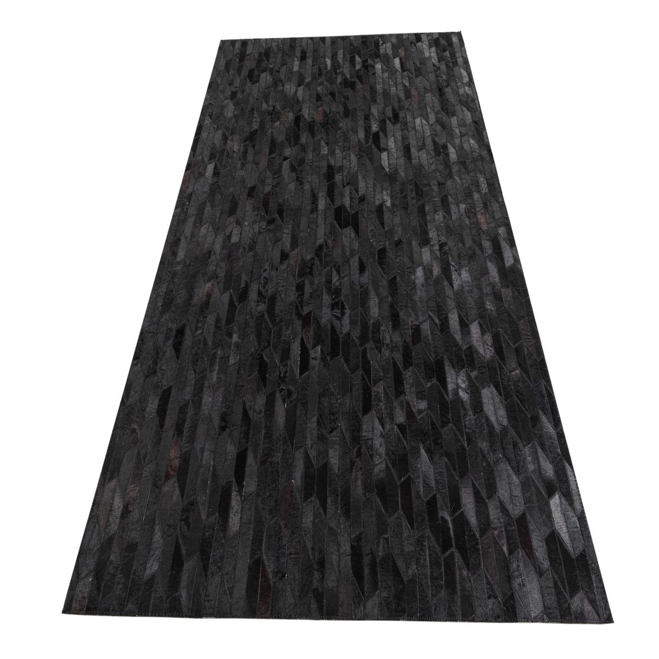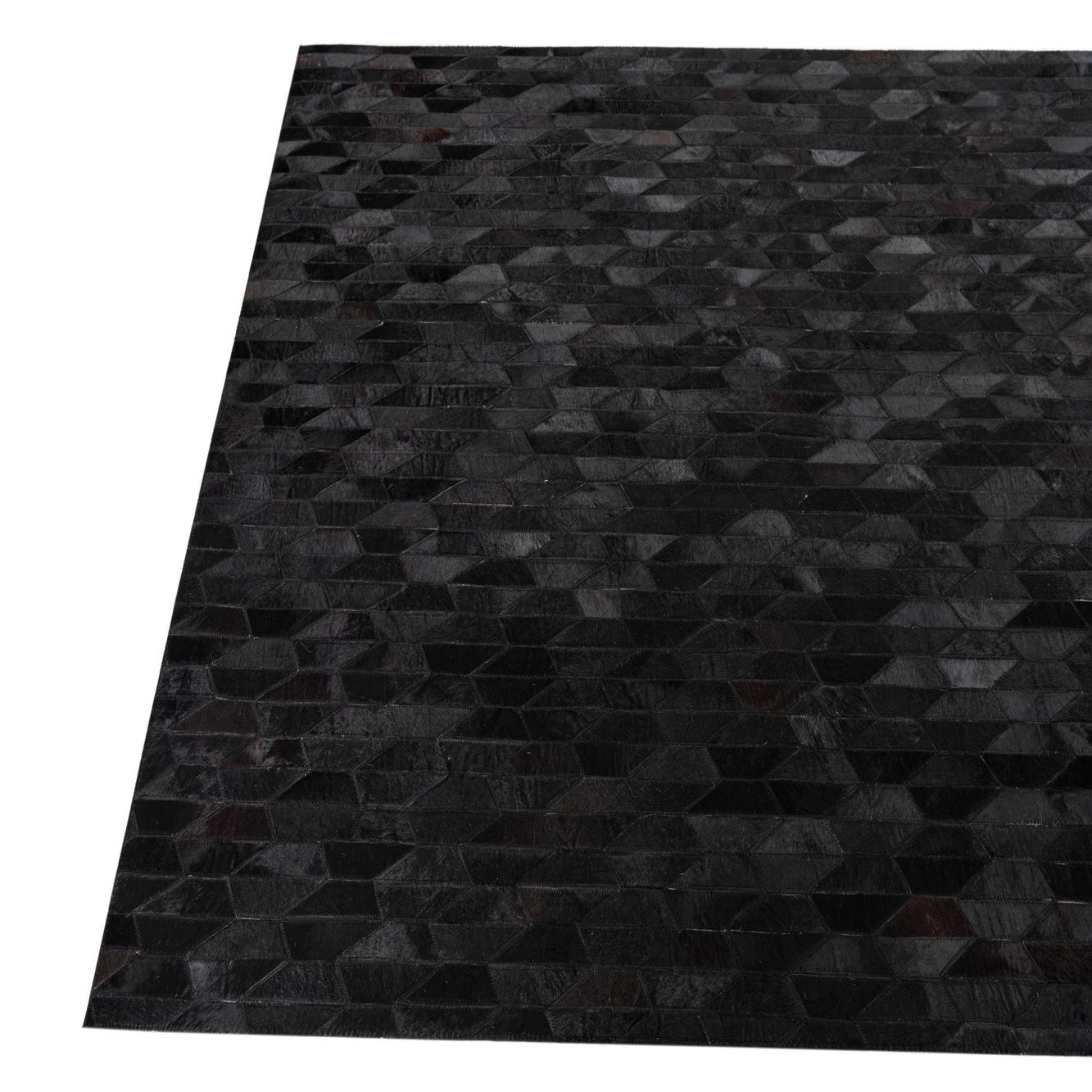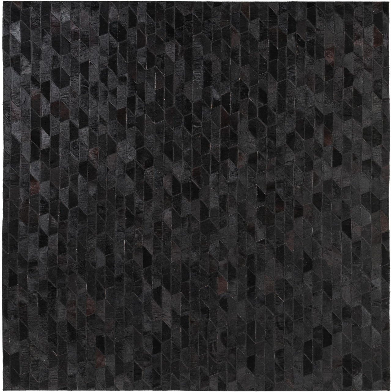 A 5x8 rectangular black cowhide leather rug with a modern abstract geometric pattern of varying dark shades.