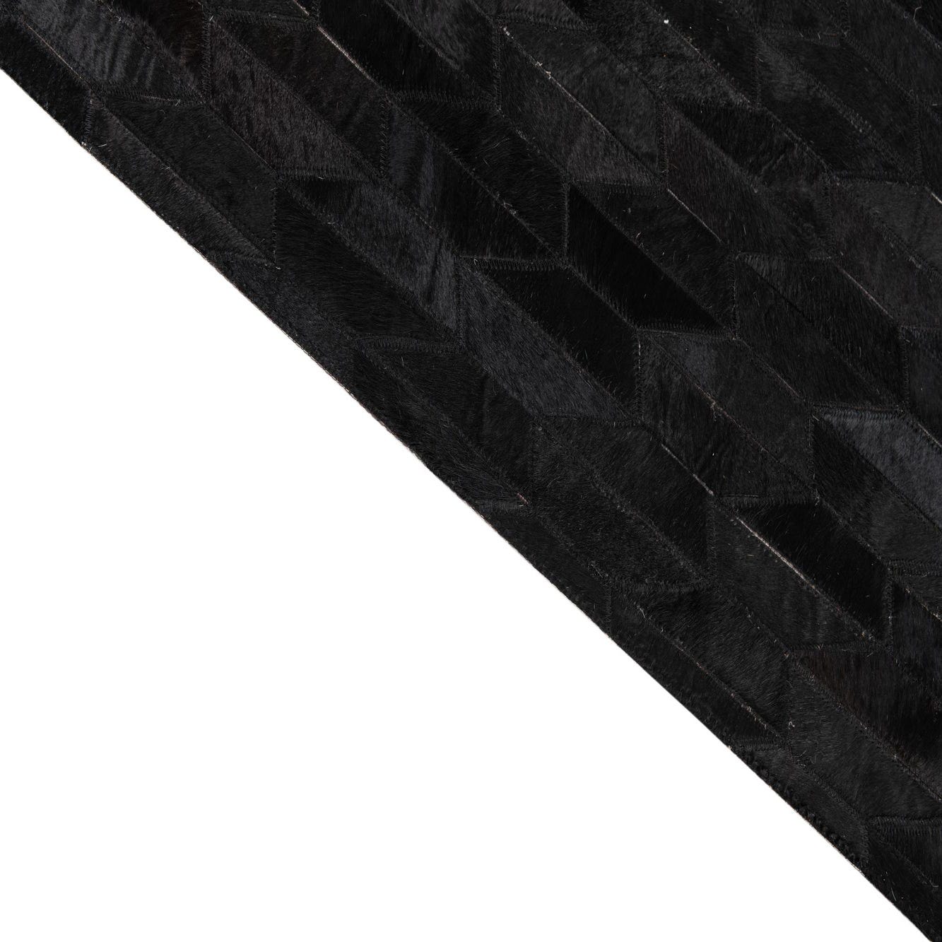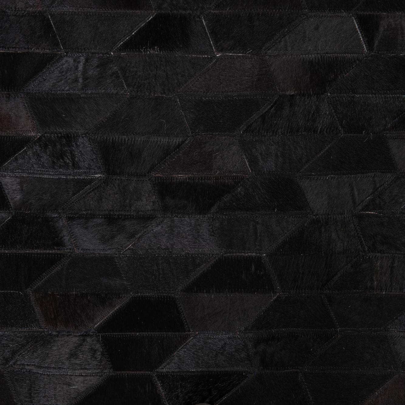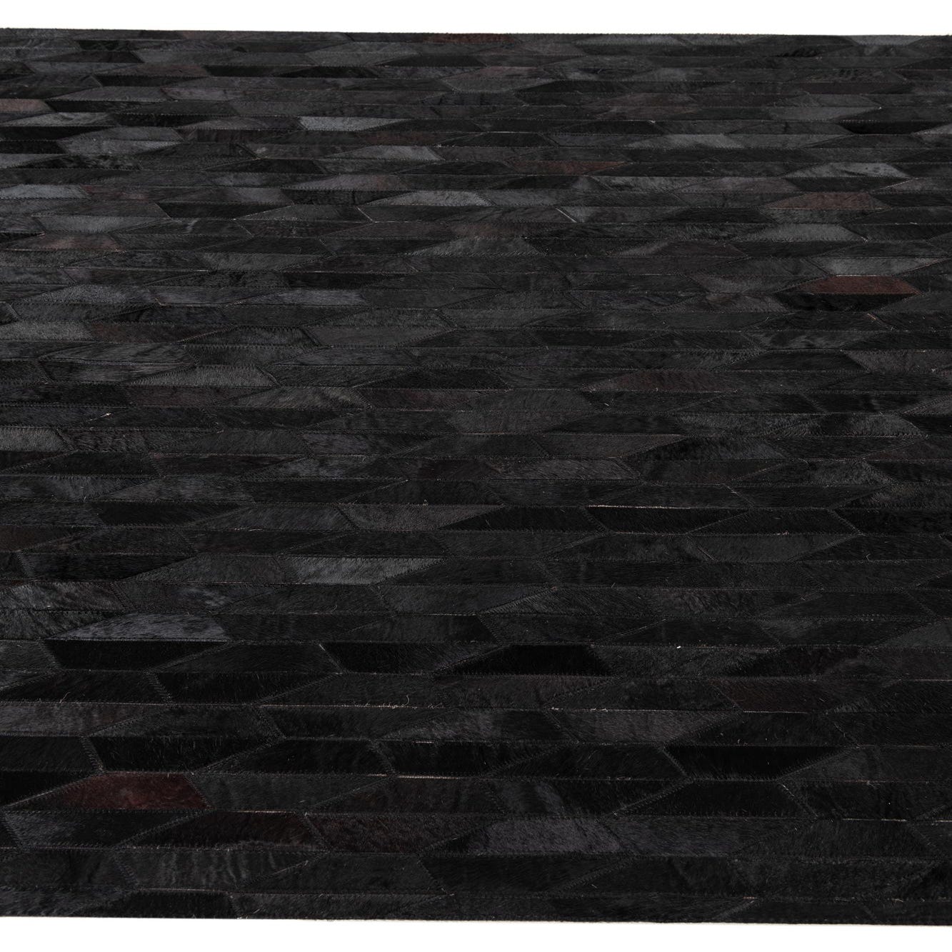 A 5x8 rectangular black cowhide leather rug with a modern abstract geometric pattern of varying dark shades.
