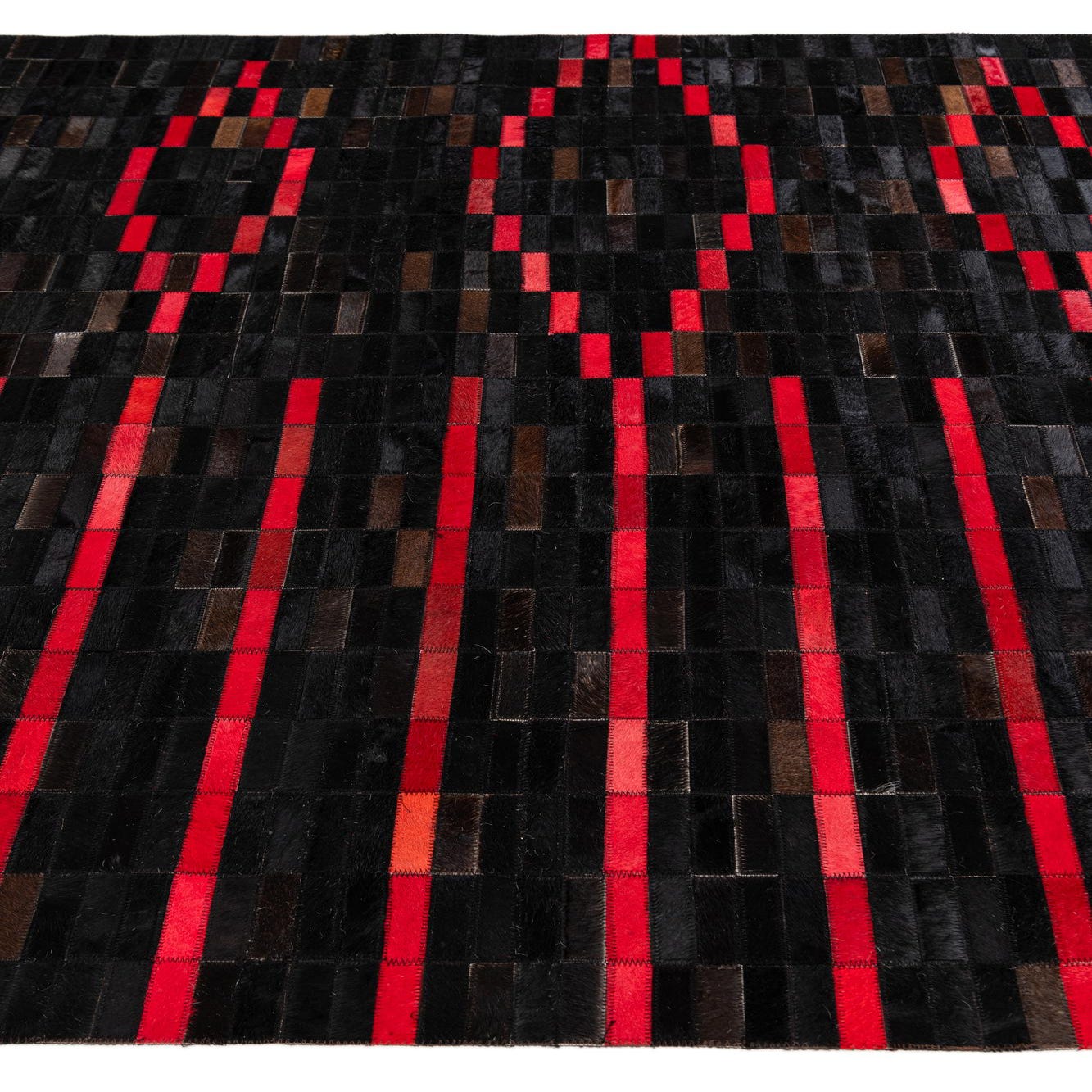 A 5x8 rectangular Cowhide Stocks rug by Rugs.com. The modern design features a patchwork of black cowhide squares with horizontal red and brown leather strips, creating a dynamic, abstract pattern.