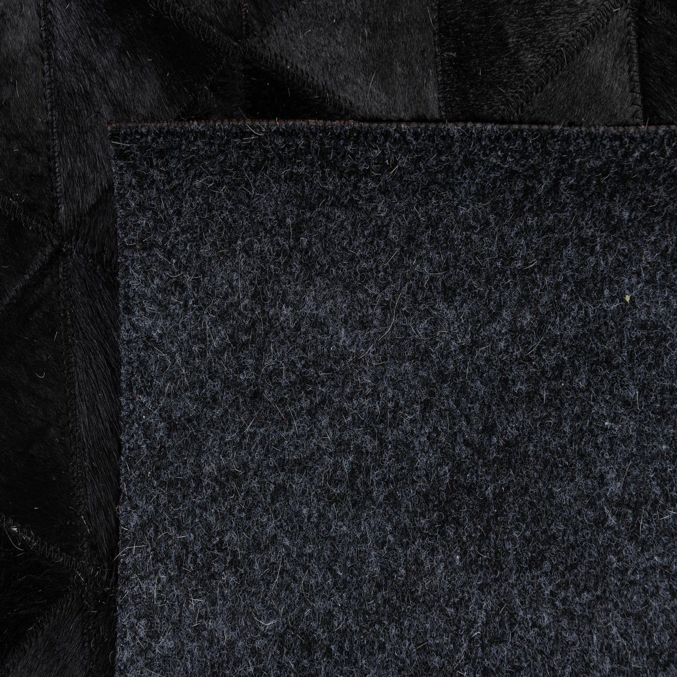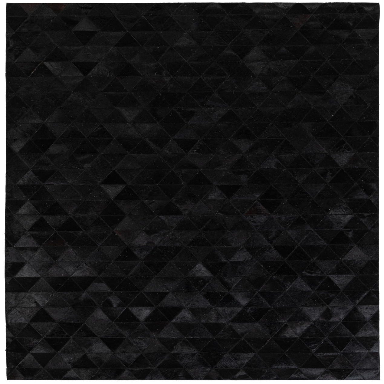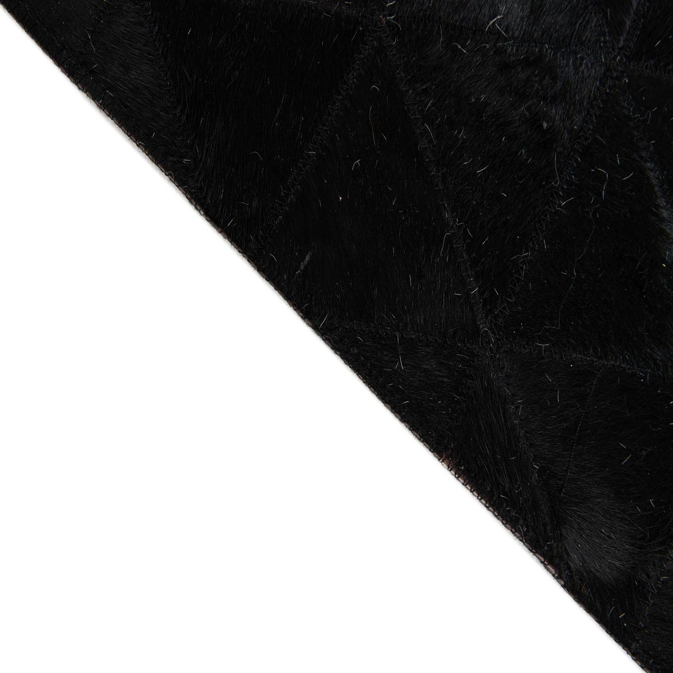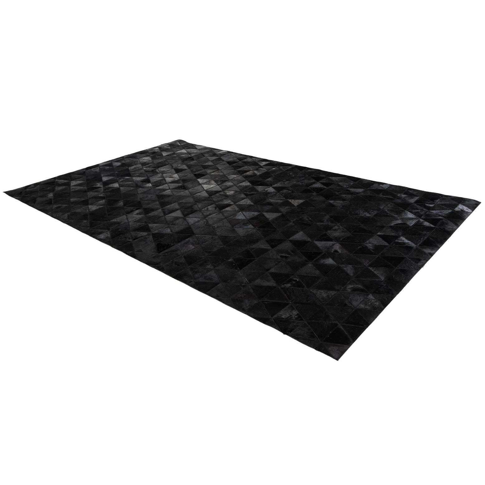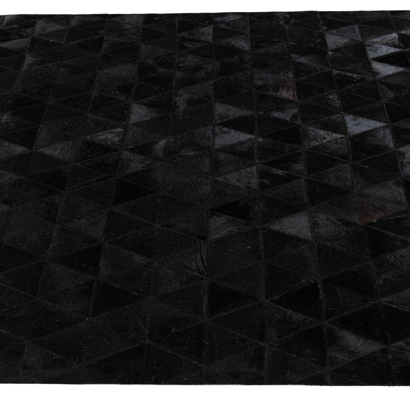 A 5x8 rectangular black modern cowhide rug with a geometric triangular pattern, suitable for a living room.