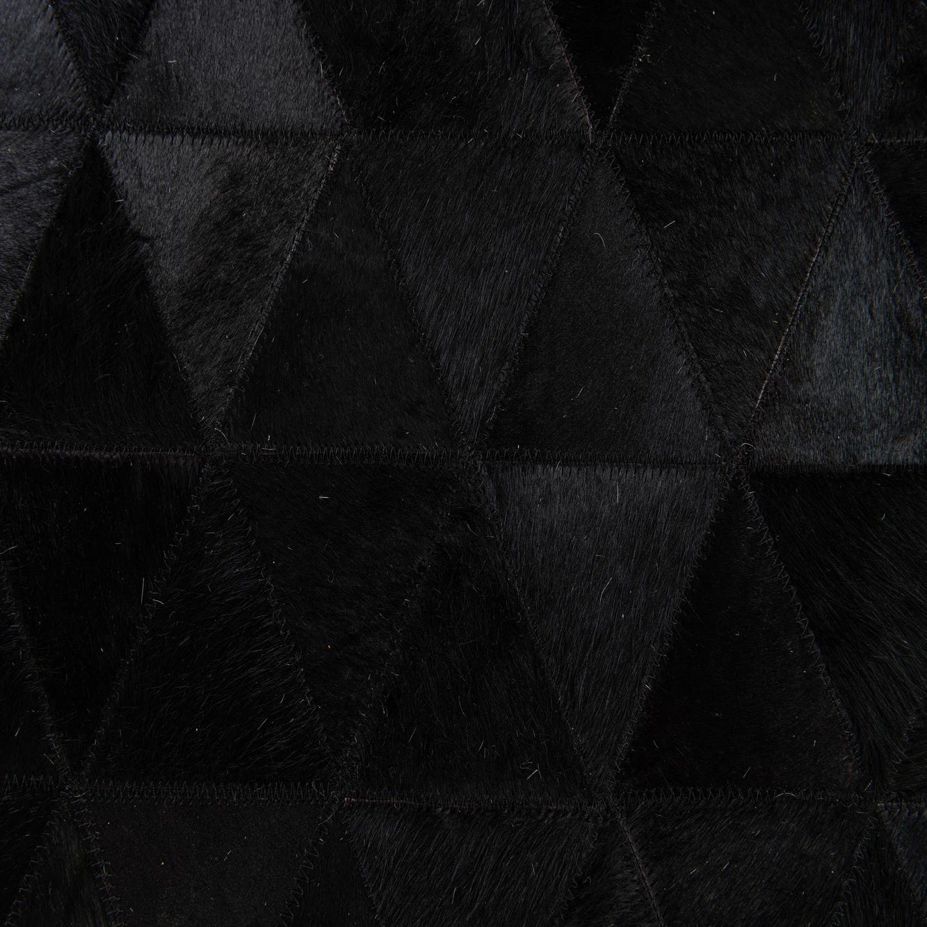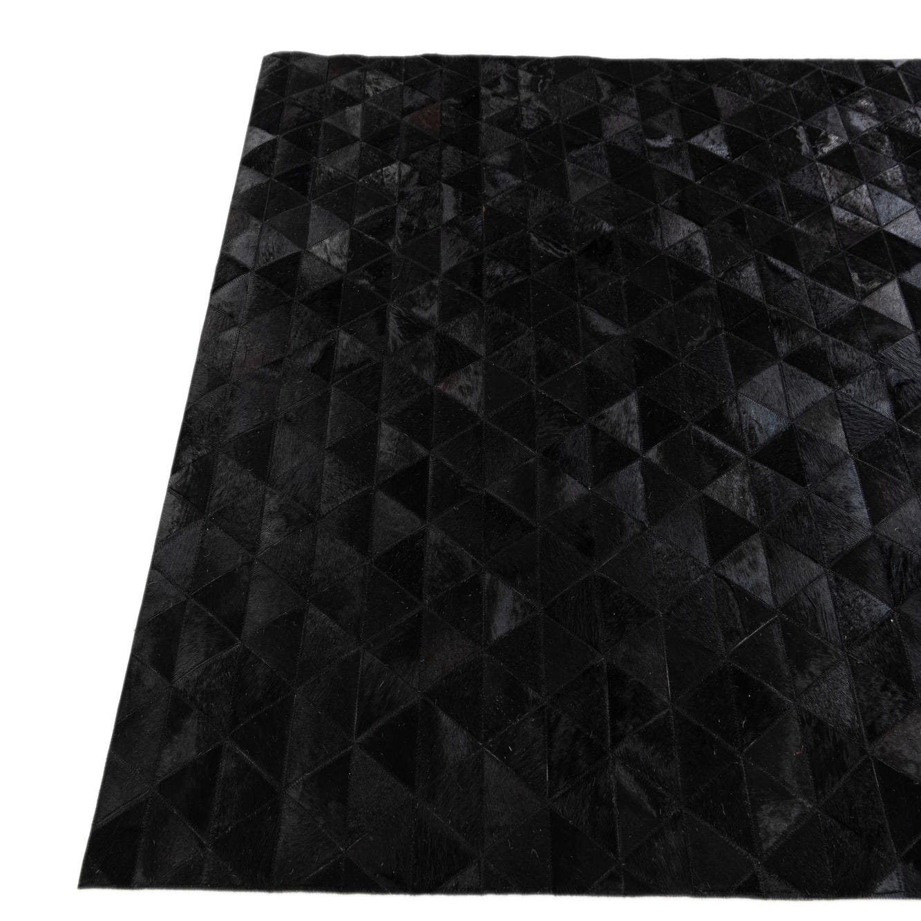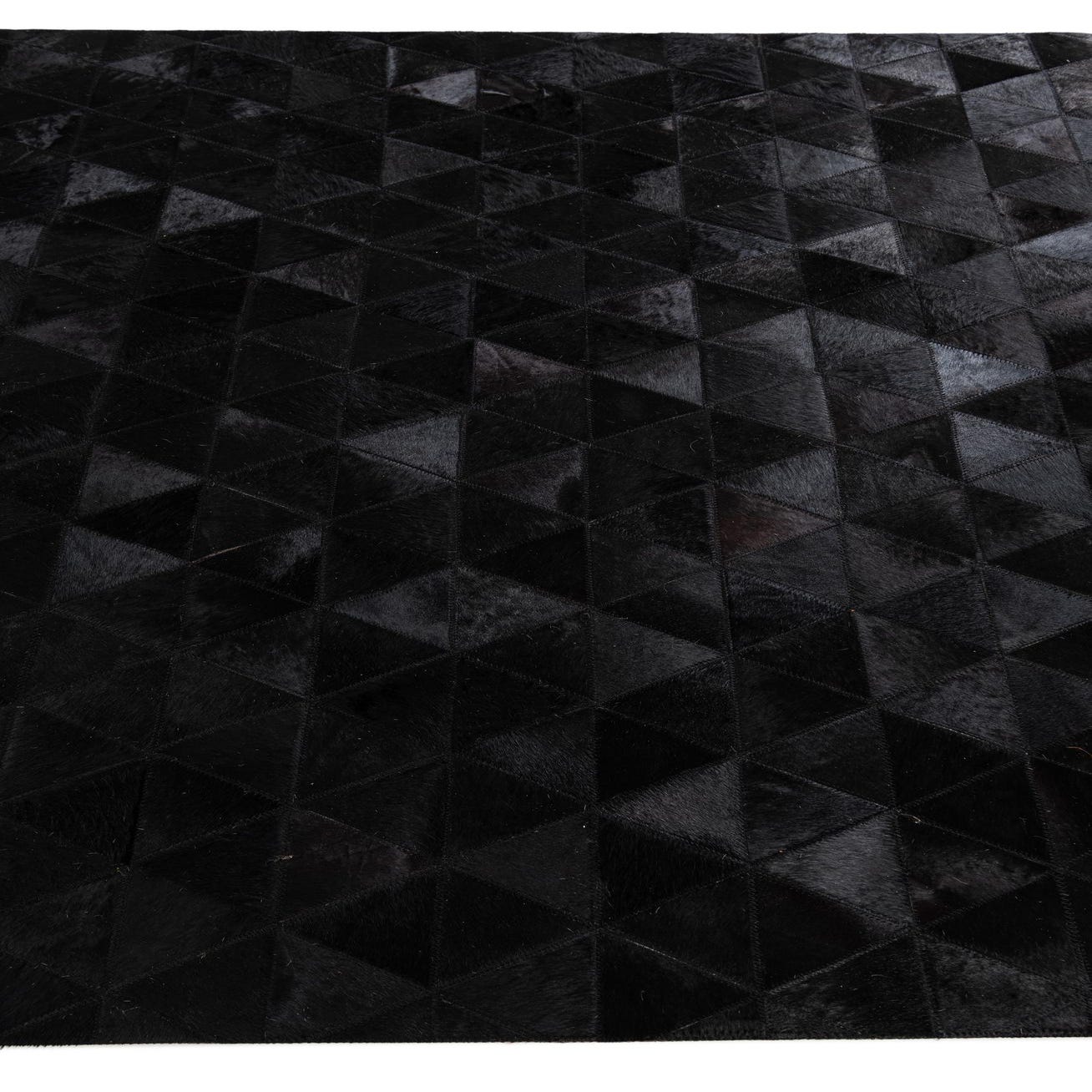 A 5x8 rectangular black modern cowhide rug featuring a geometric triangular pattern, ideal for a living room.