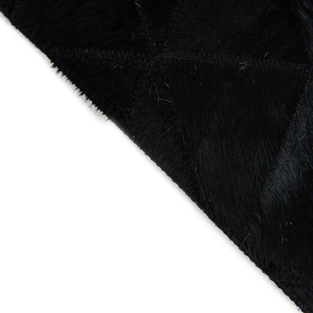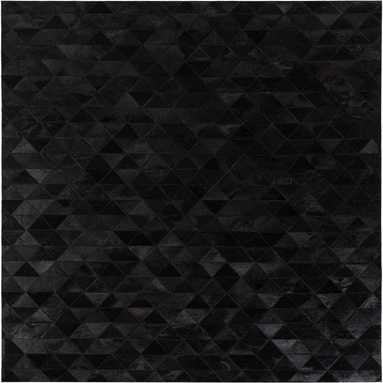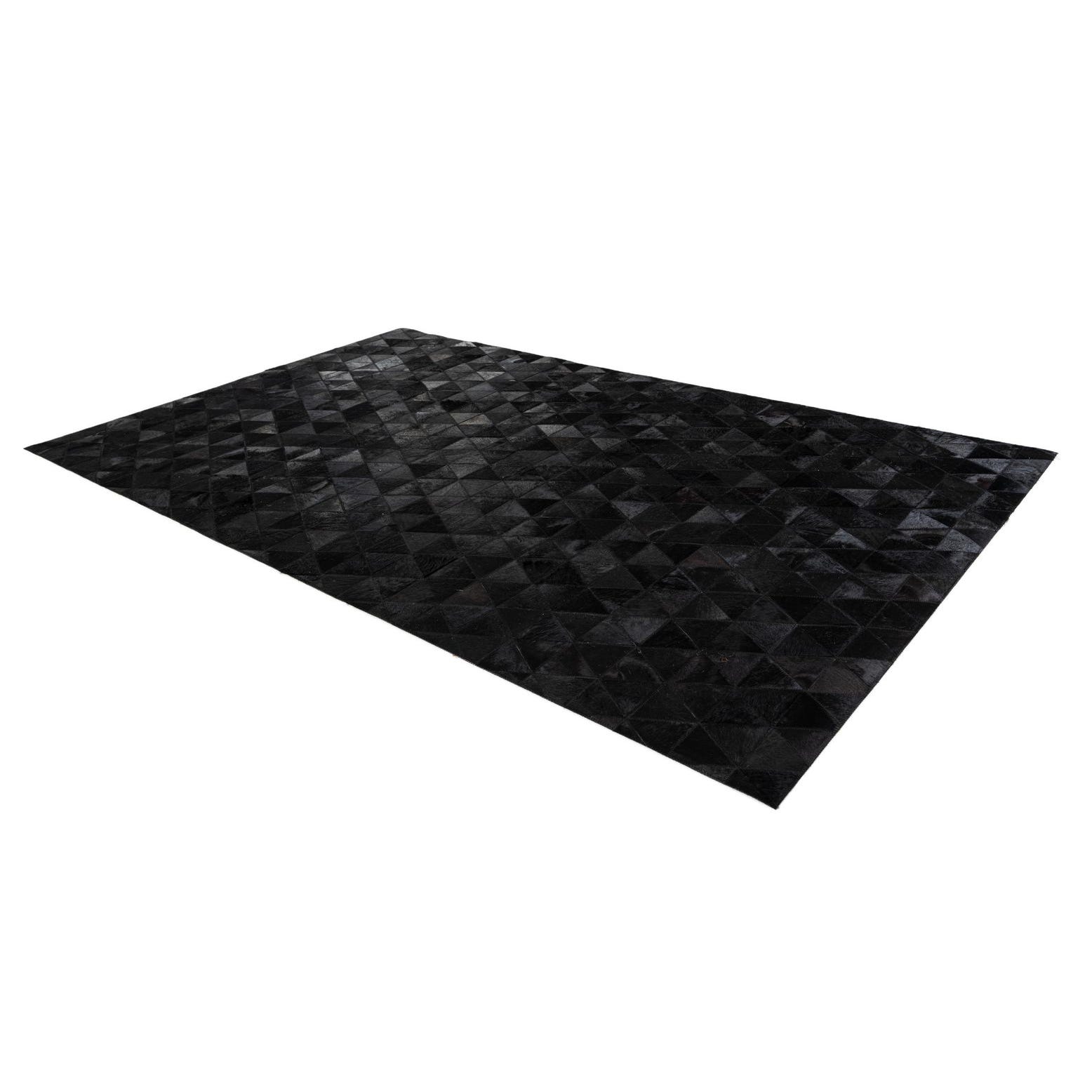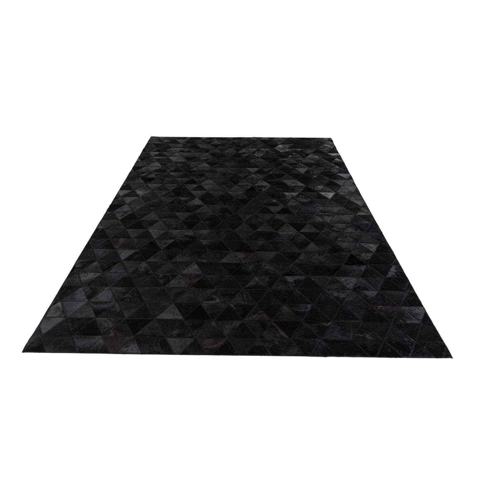 A 5x8 rectangular black modern cowhide rug featuring a geometric triangular pattern, ideal for a living room.