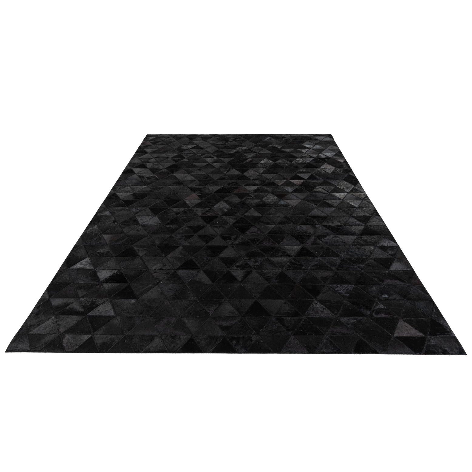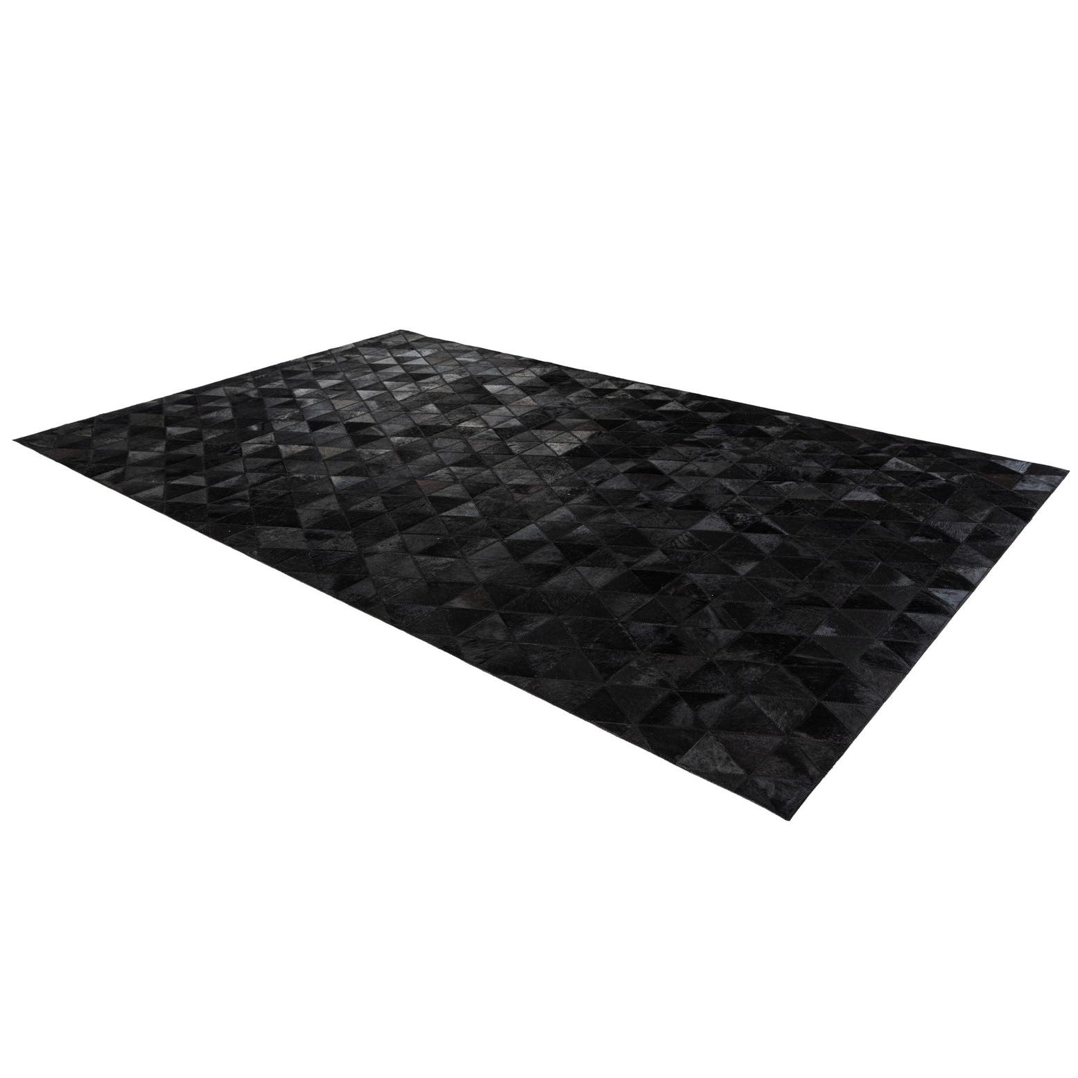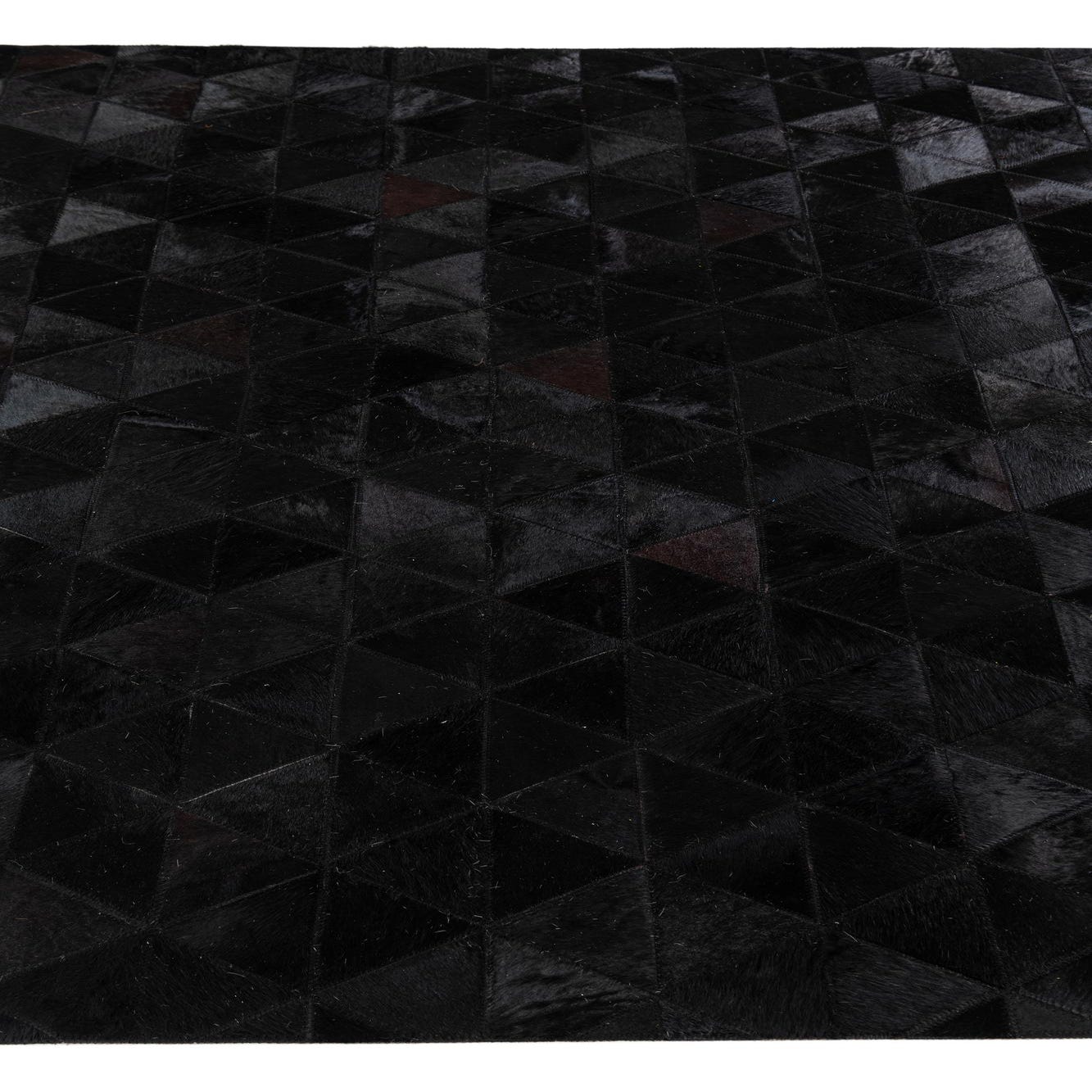 A 5x8 rectangular black modern cowhide rug featuring a geometric triangular pattern, suitable for a living room.