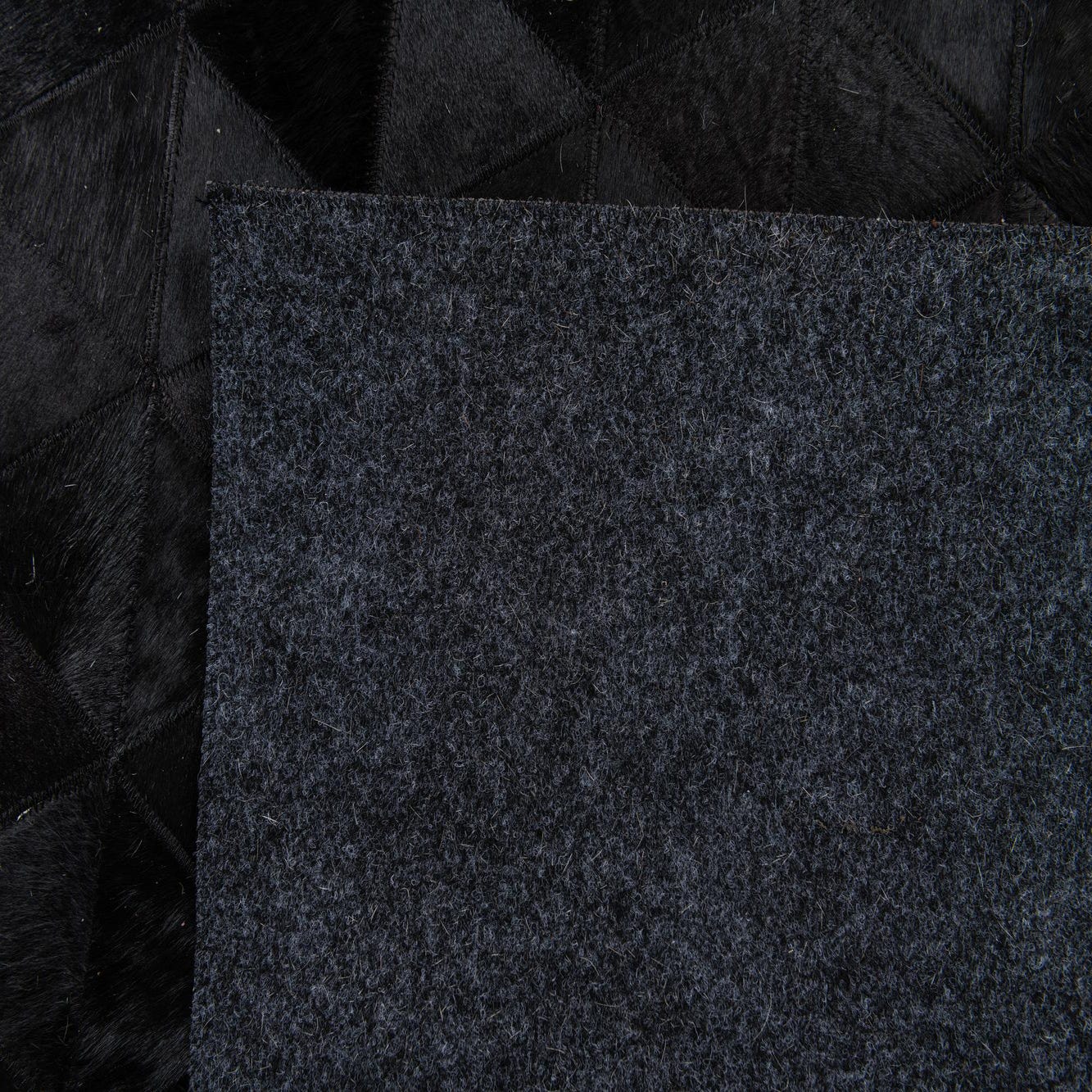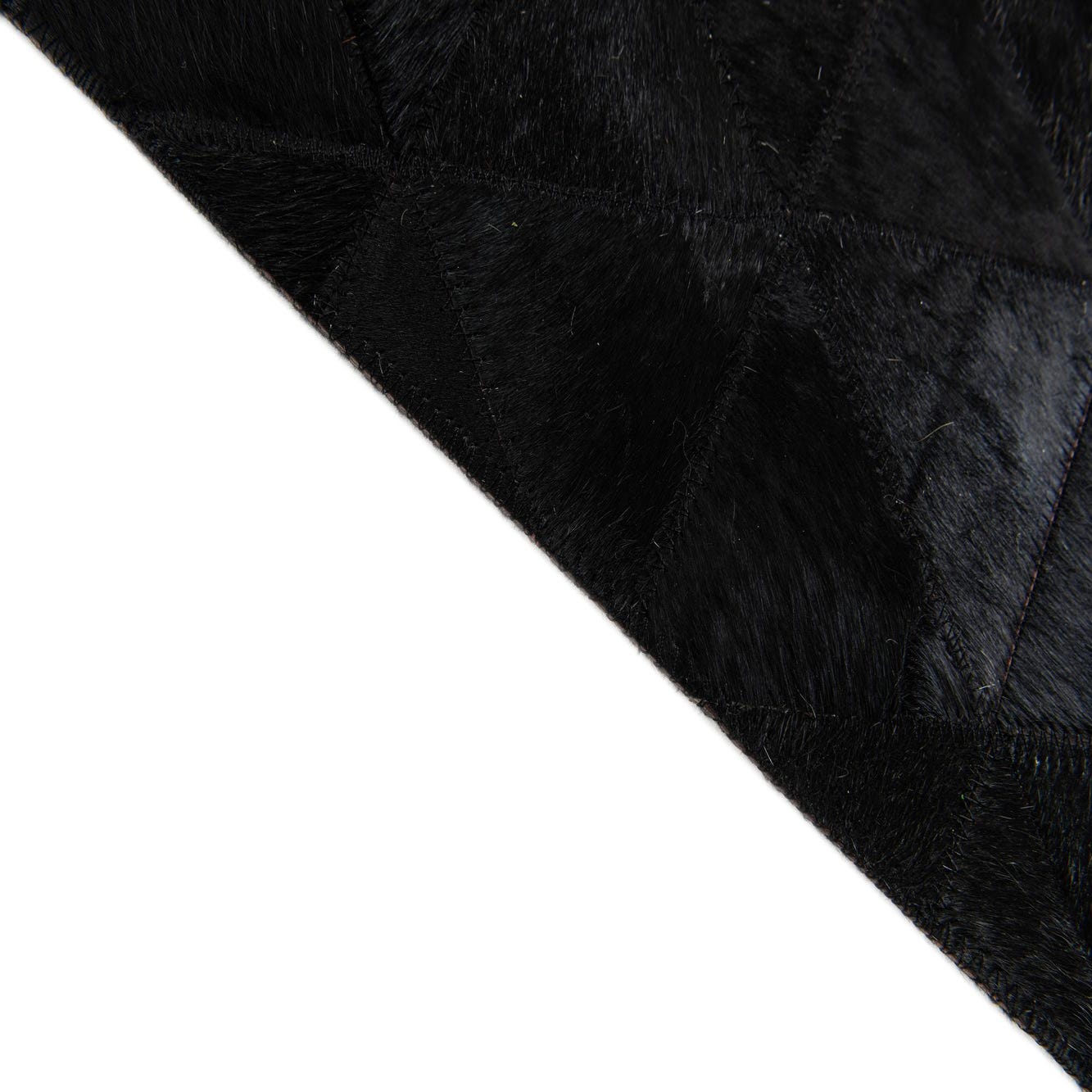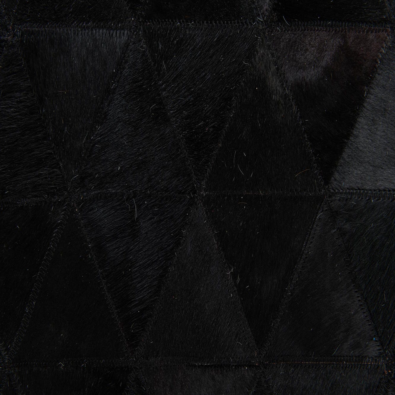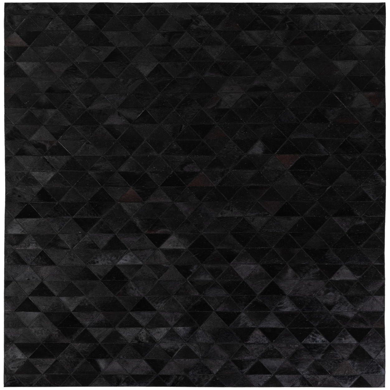 A 5x8 rectangular black modern cowhide rug featuring a geometric triangular pattern, suitable for a living room.
