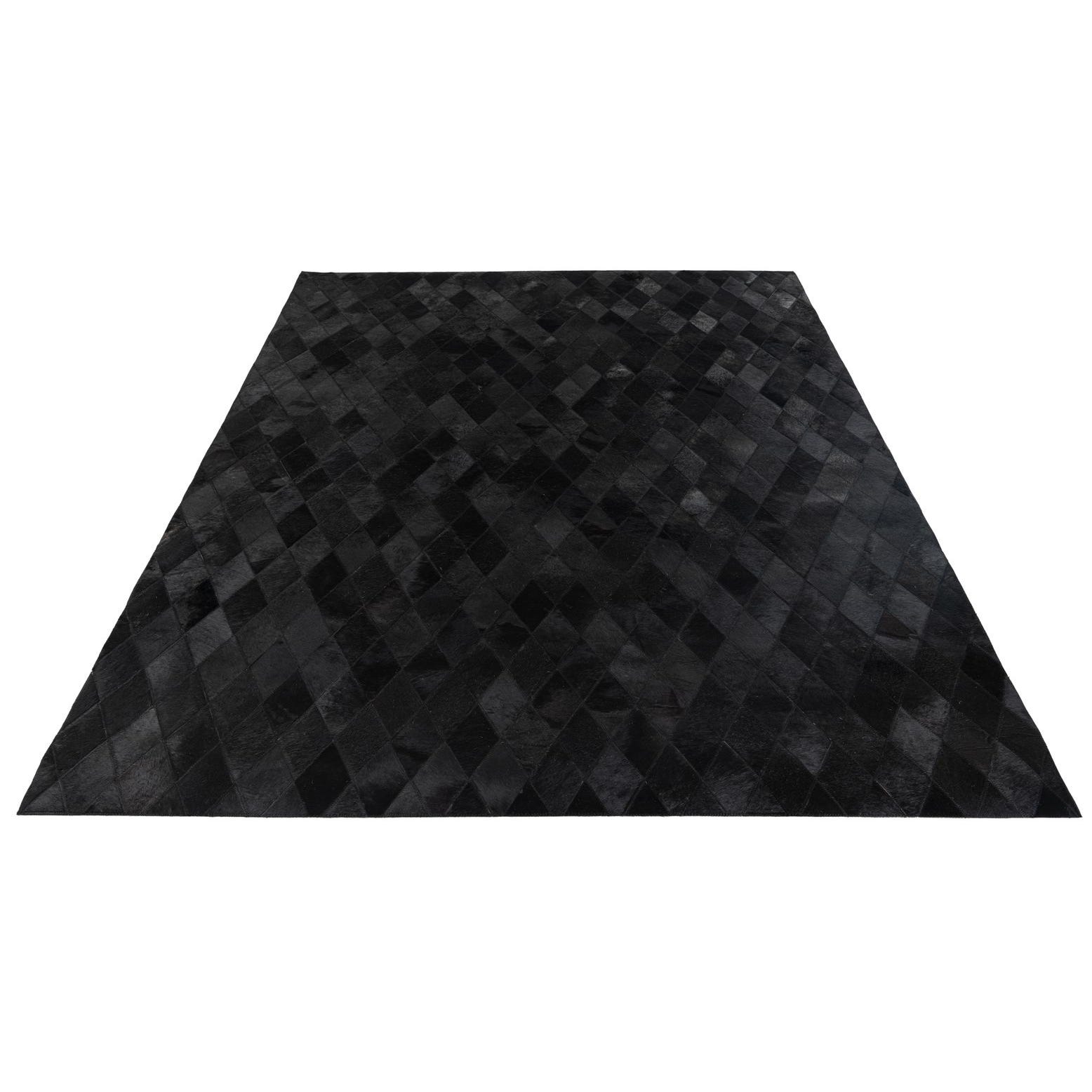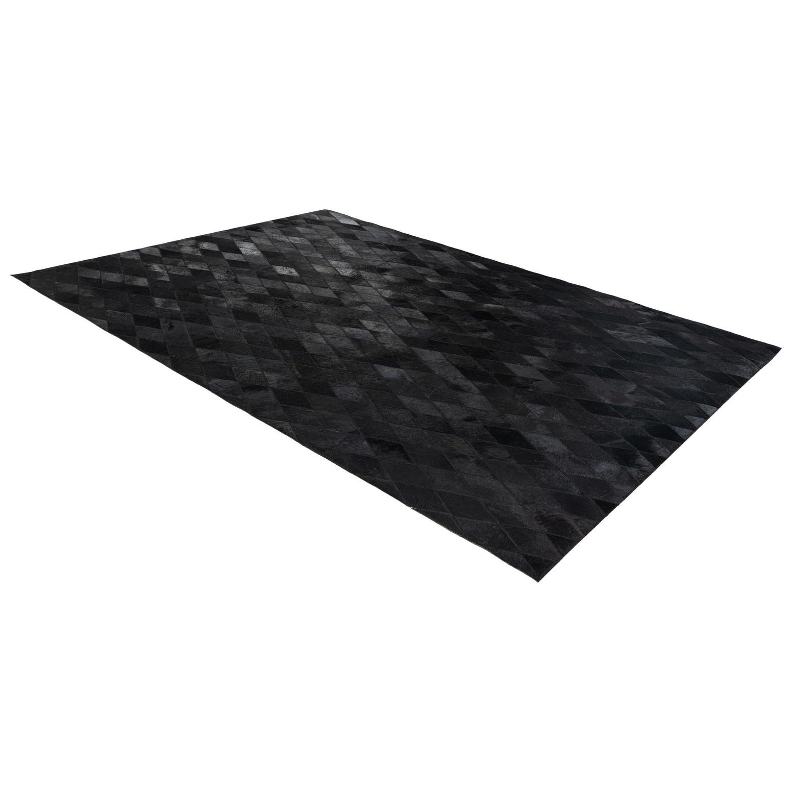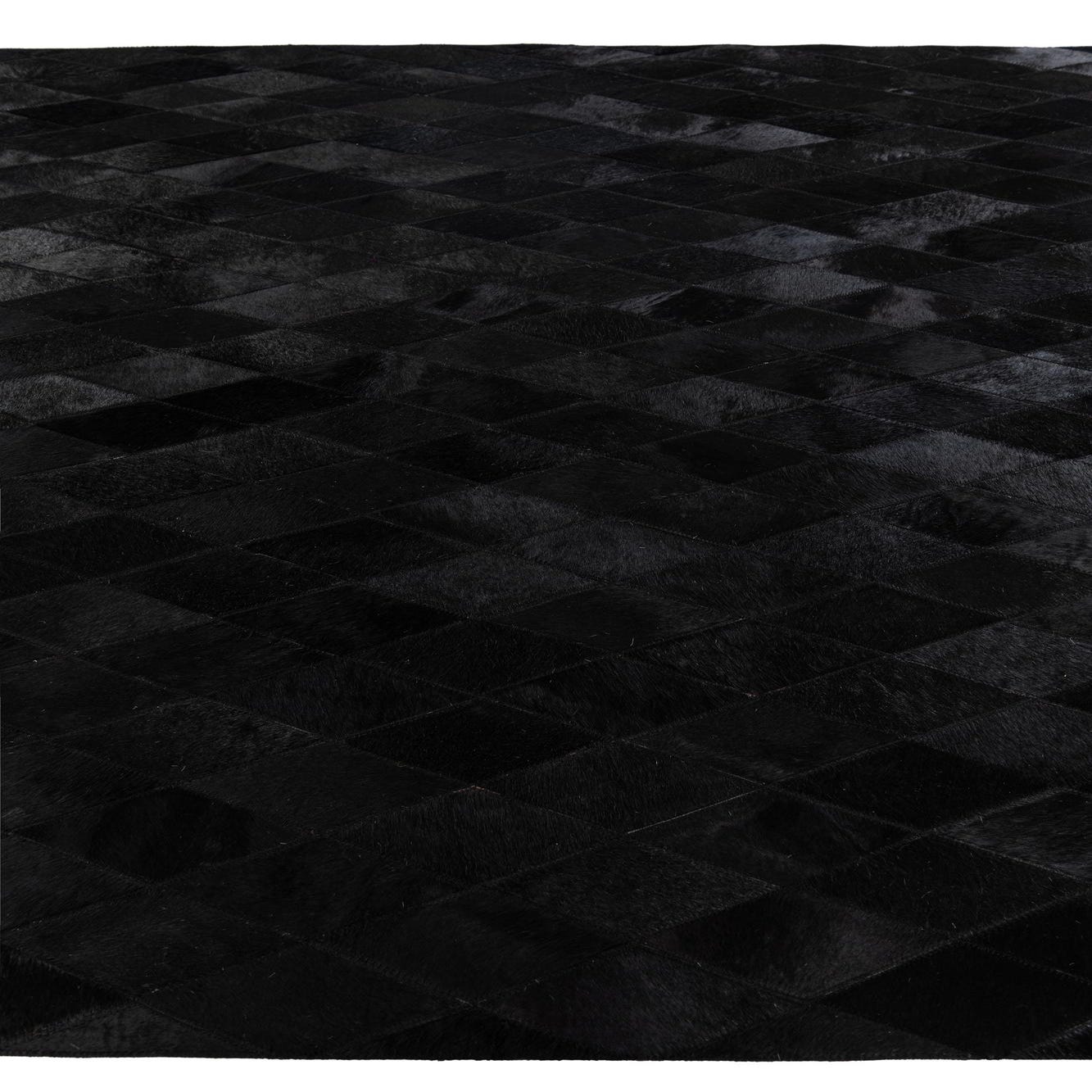 A 5x8 rectangular black modern cowhide rug with a subtle diamond pattern, suitable for a living room or bedroom.