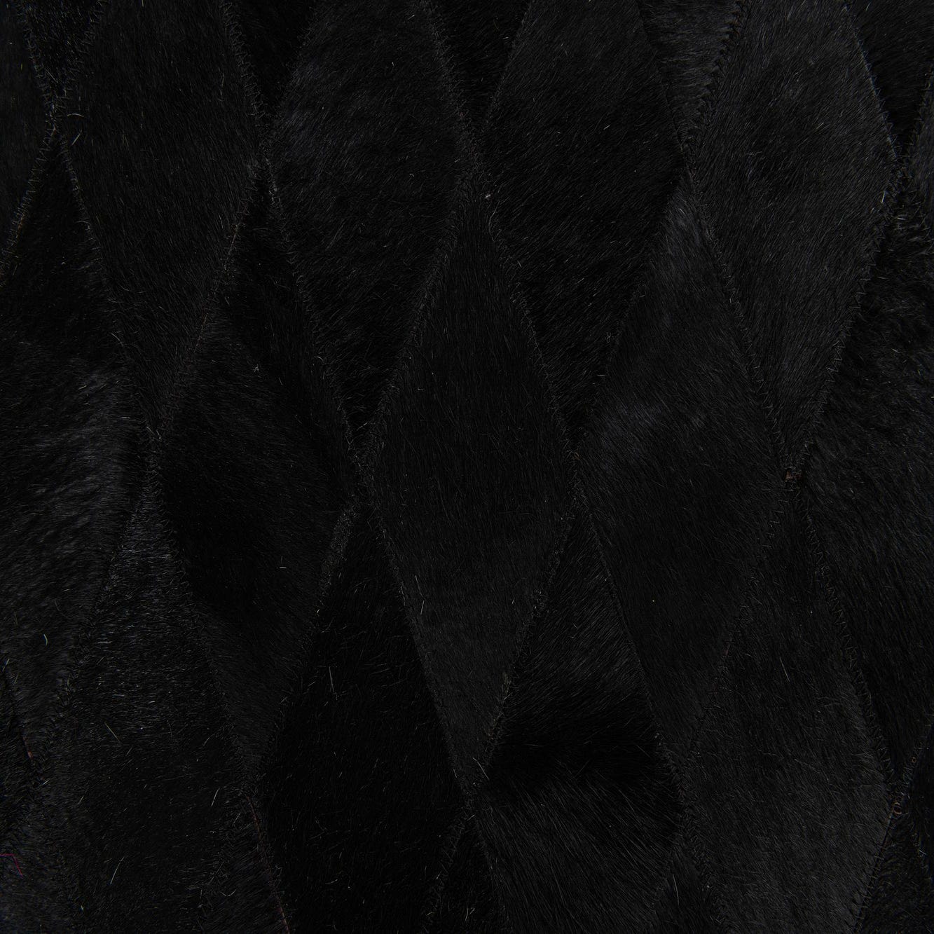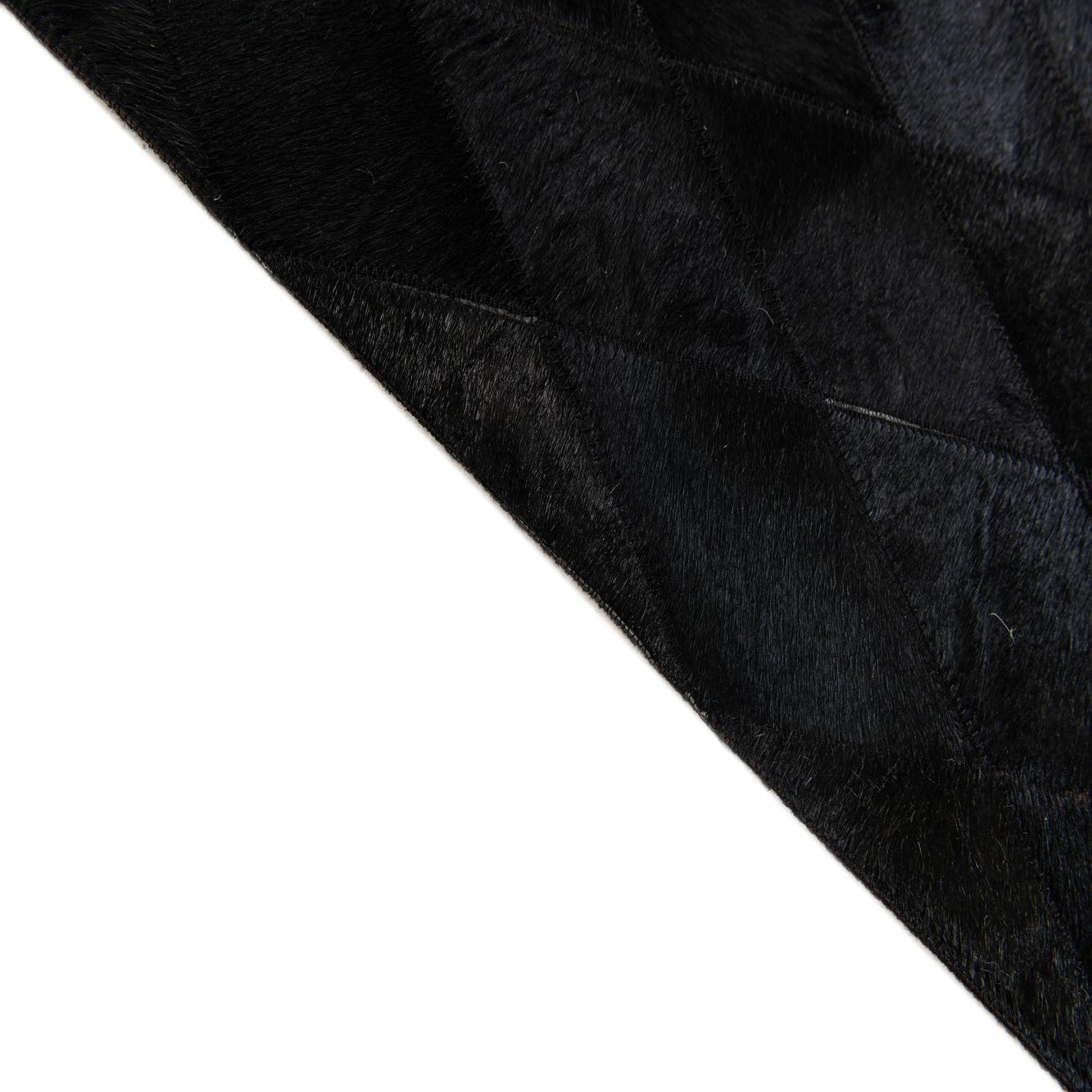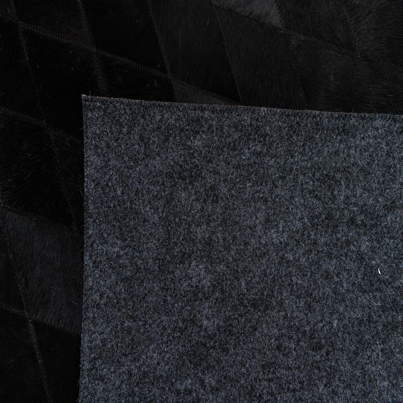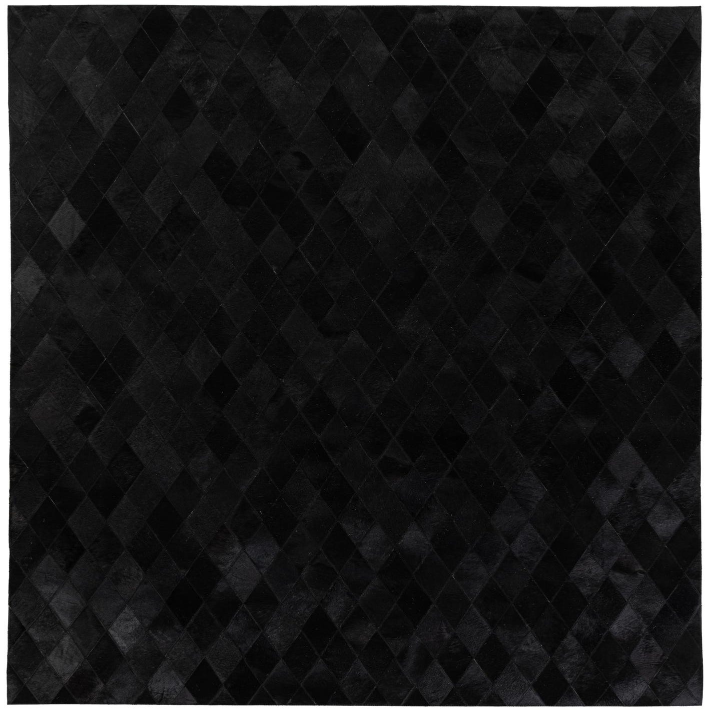 A 5x8 rectangular black modern cowhide rug with a subtle diamond pattern, suitable for a living room or bedroom.
