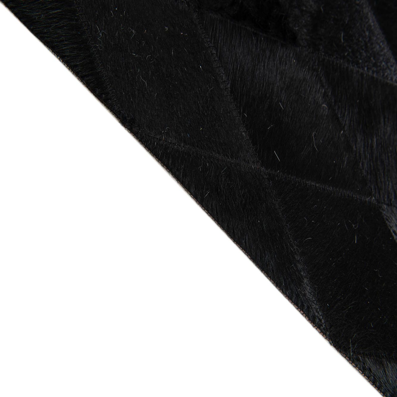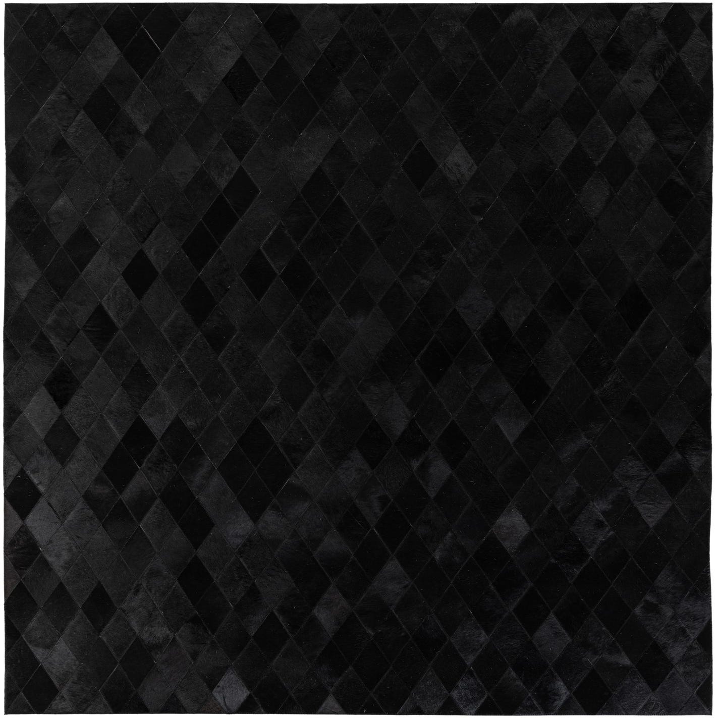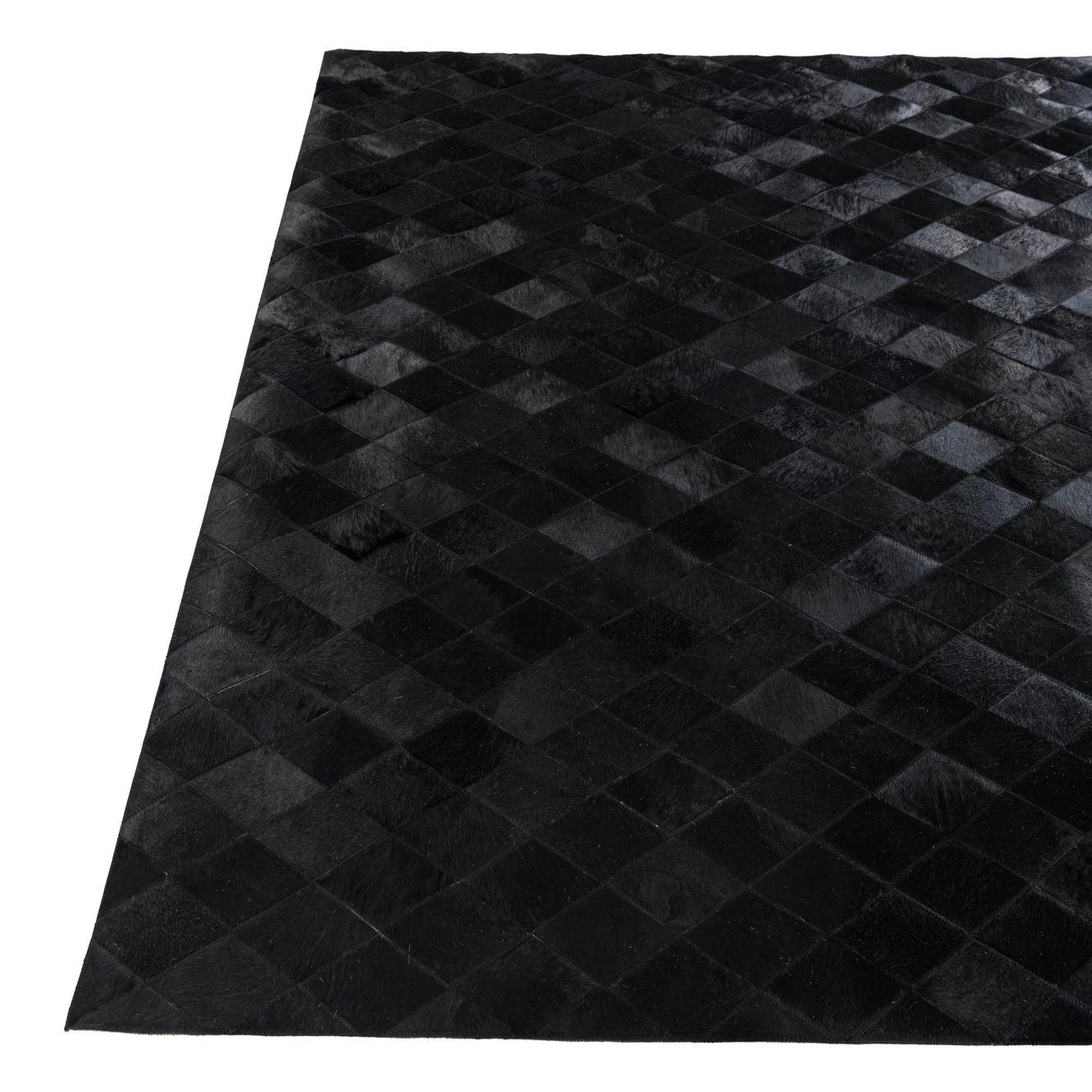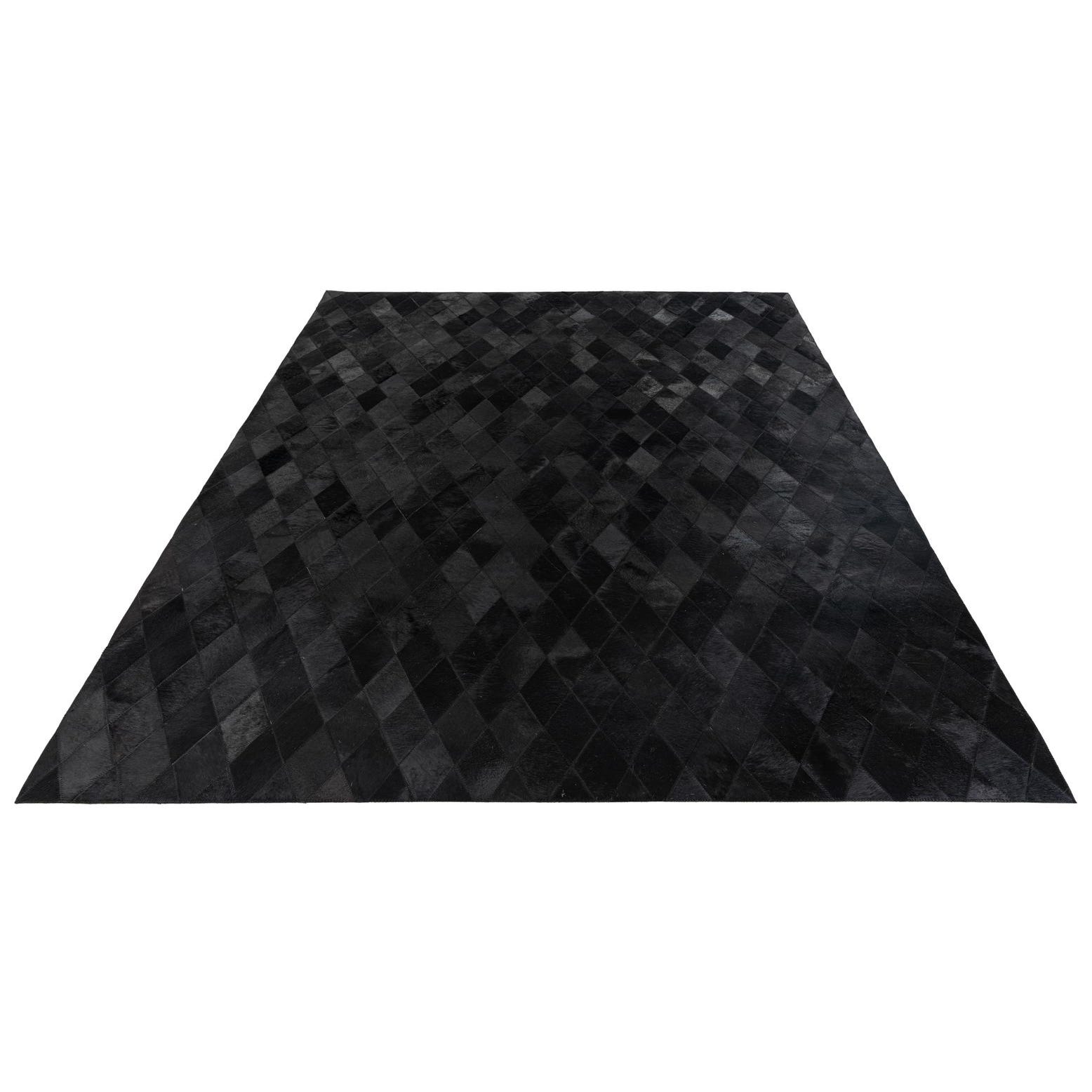 A 5x8 rectangular black modern rug made of cowhide and leather, featuring a subtle geometric diamond pattern.