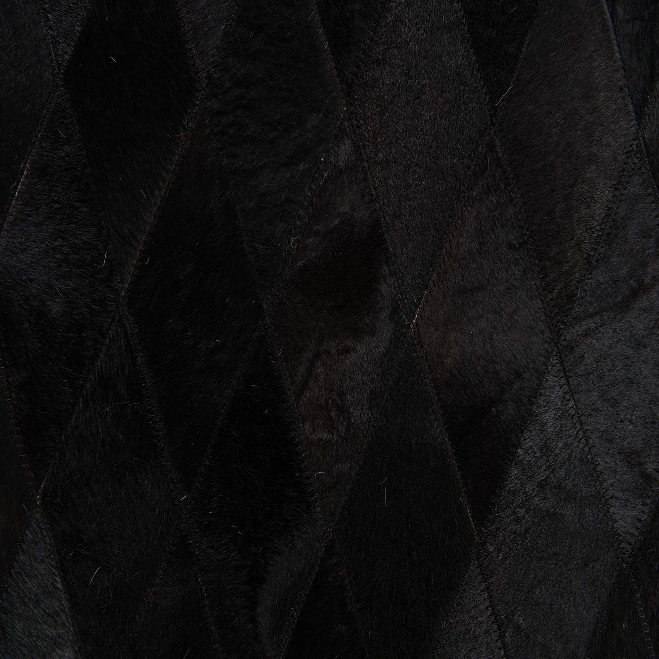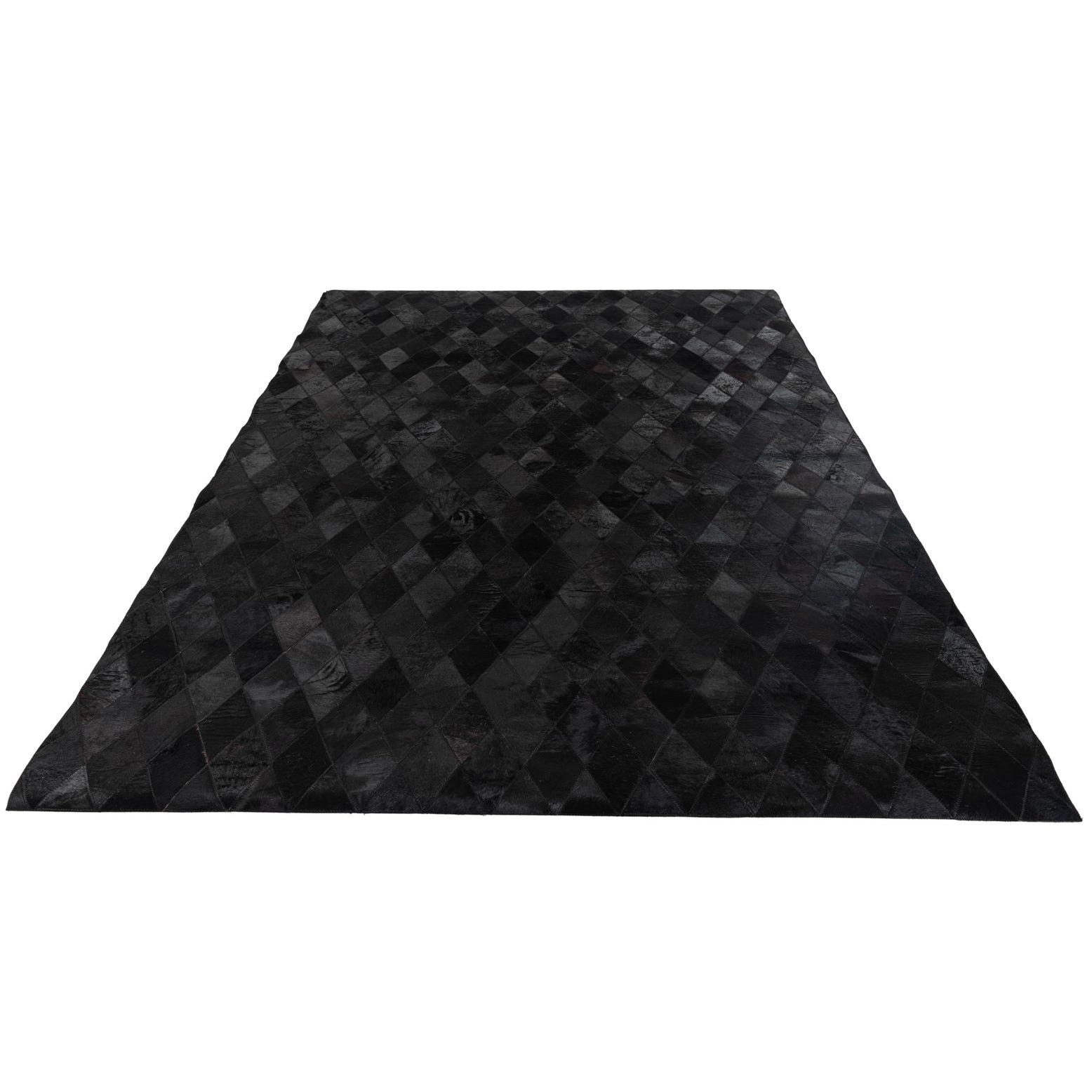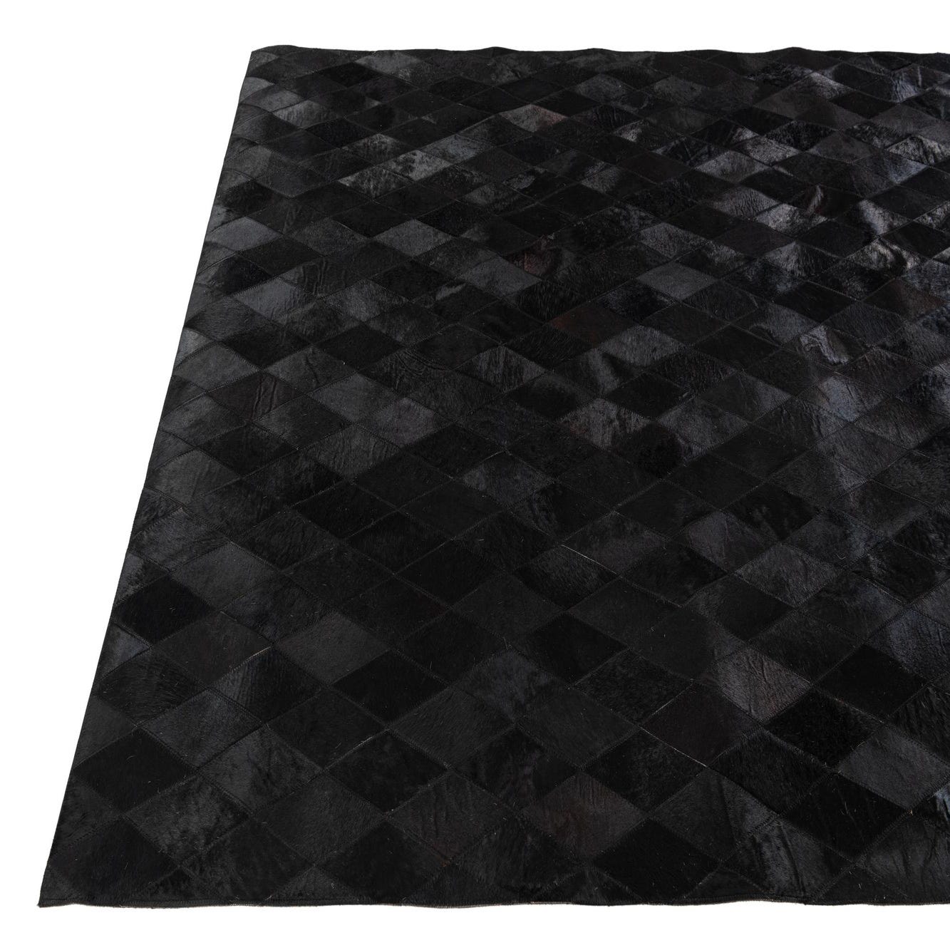 A 5x8 rectangular black modern cowhide rug with a subtle diamond patchwork pattern, suitable for various indoor rooms.