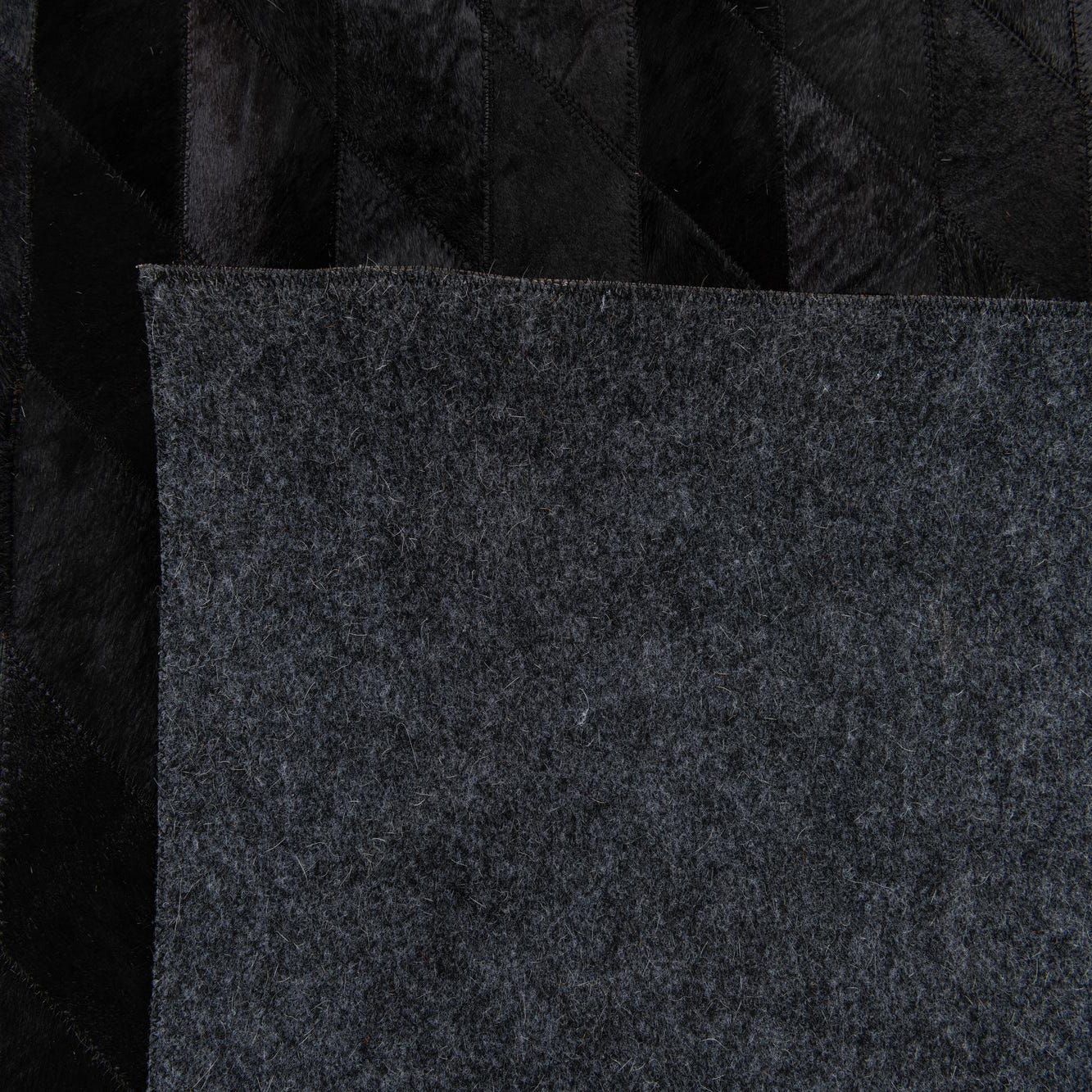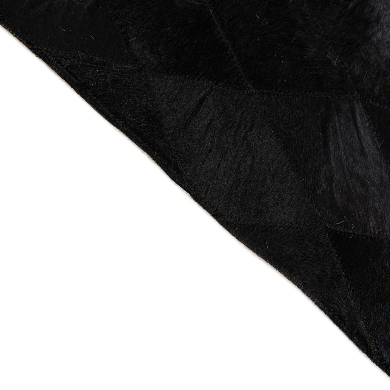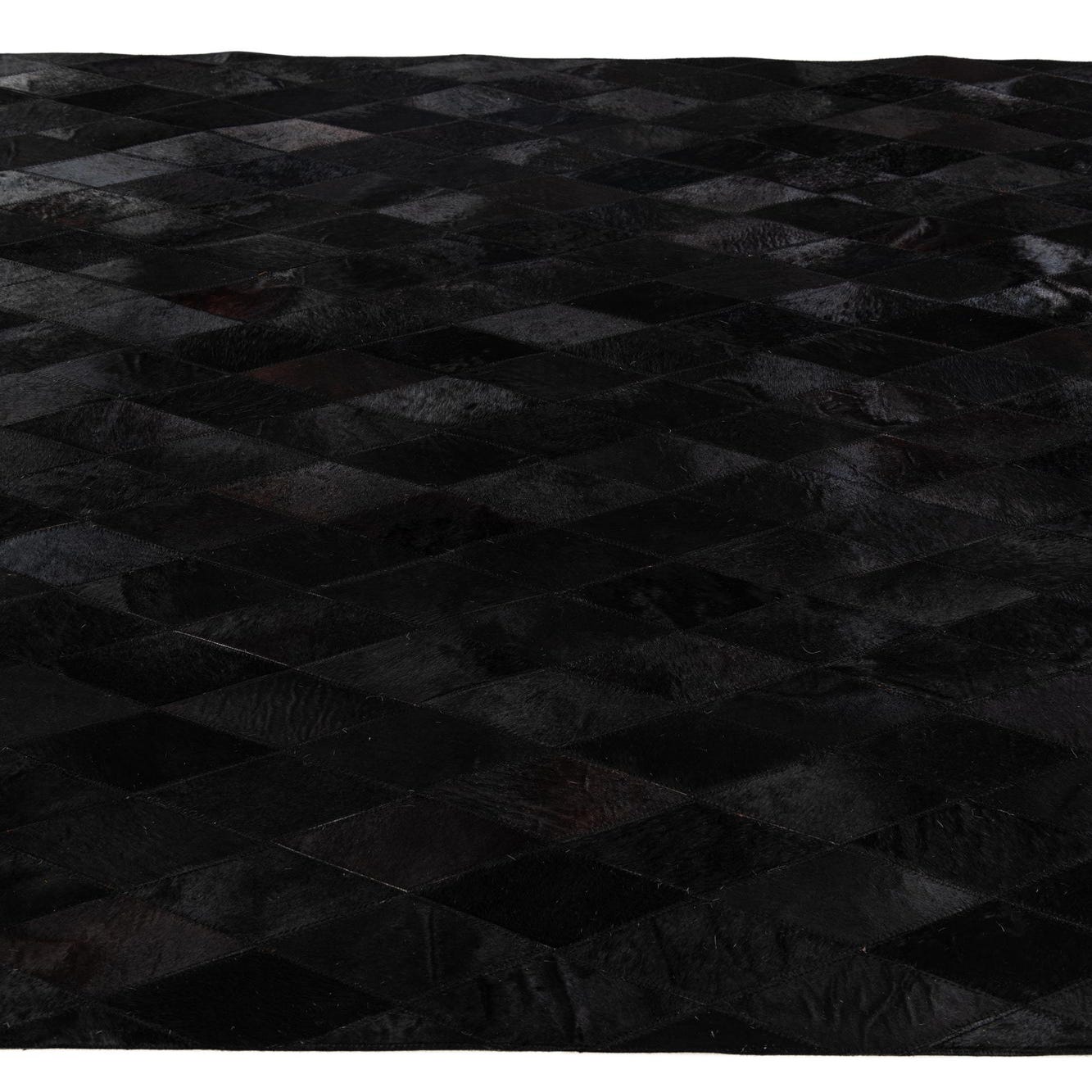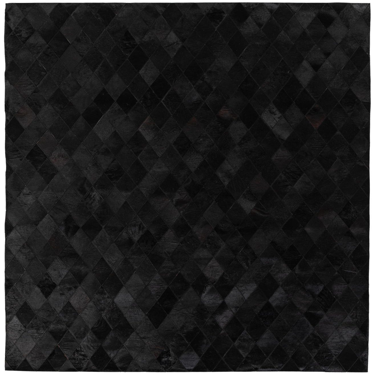 A 5x8 rectangular black modern cowhide rug with a subtle diamond patchwork pattern, suitable for various indoor rooms.