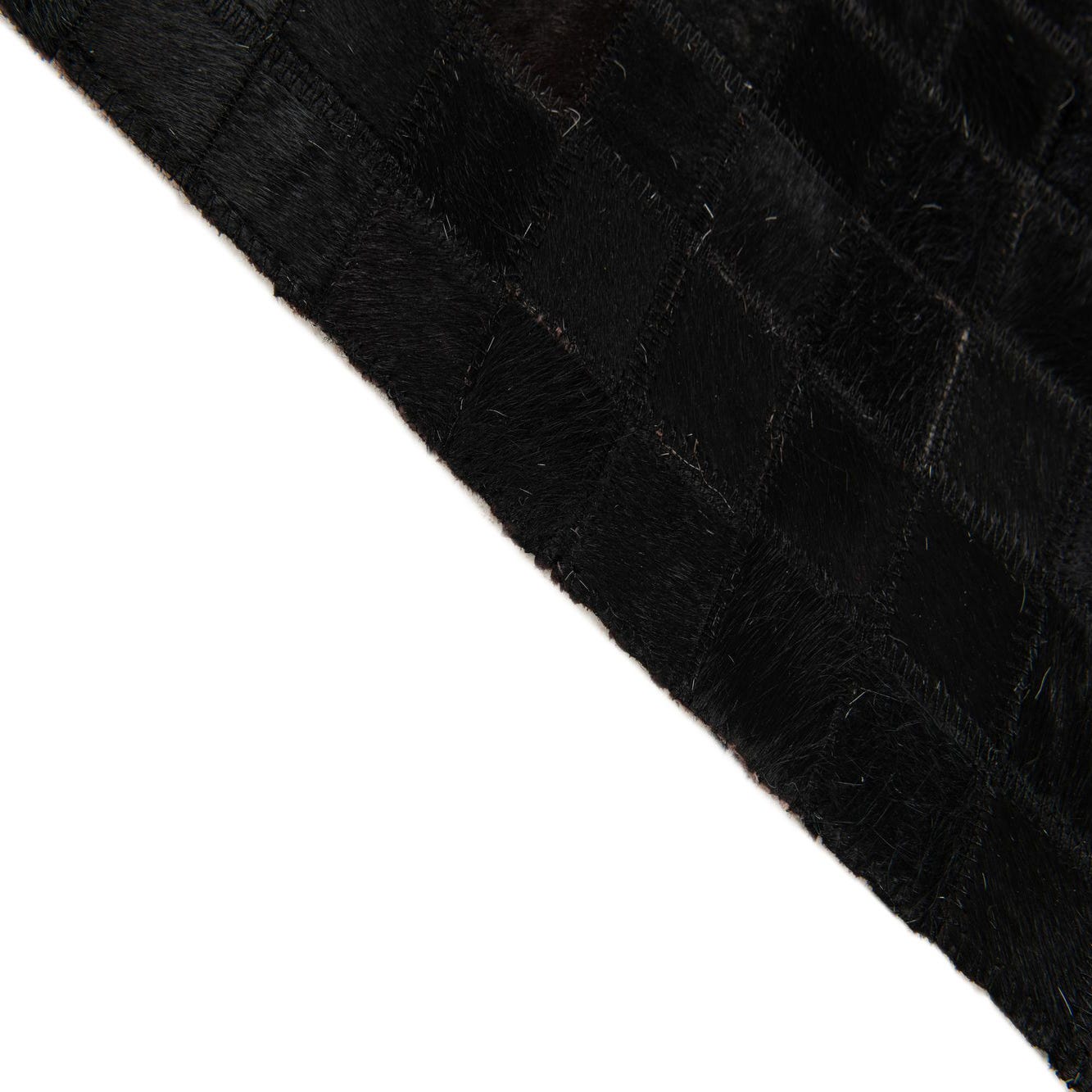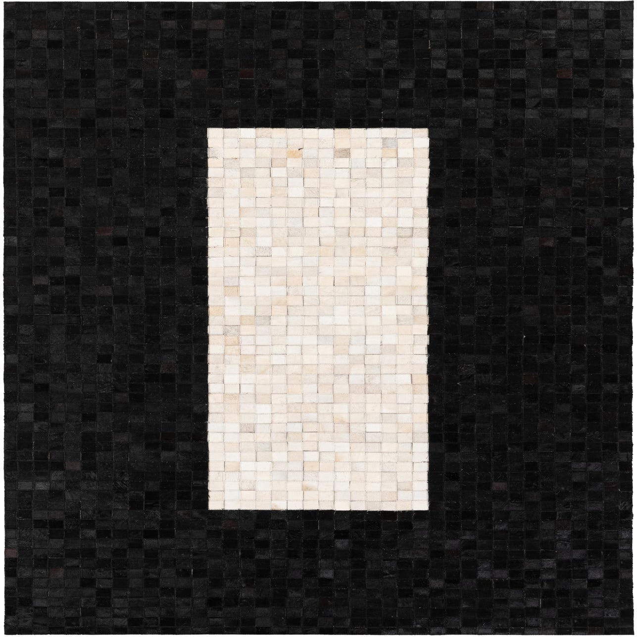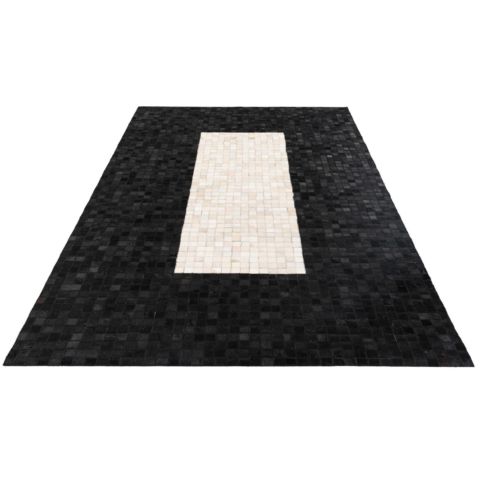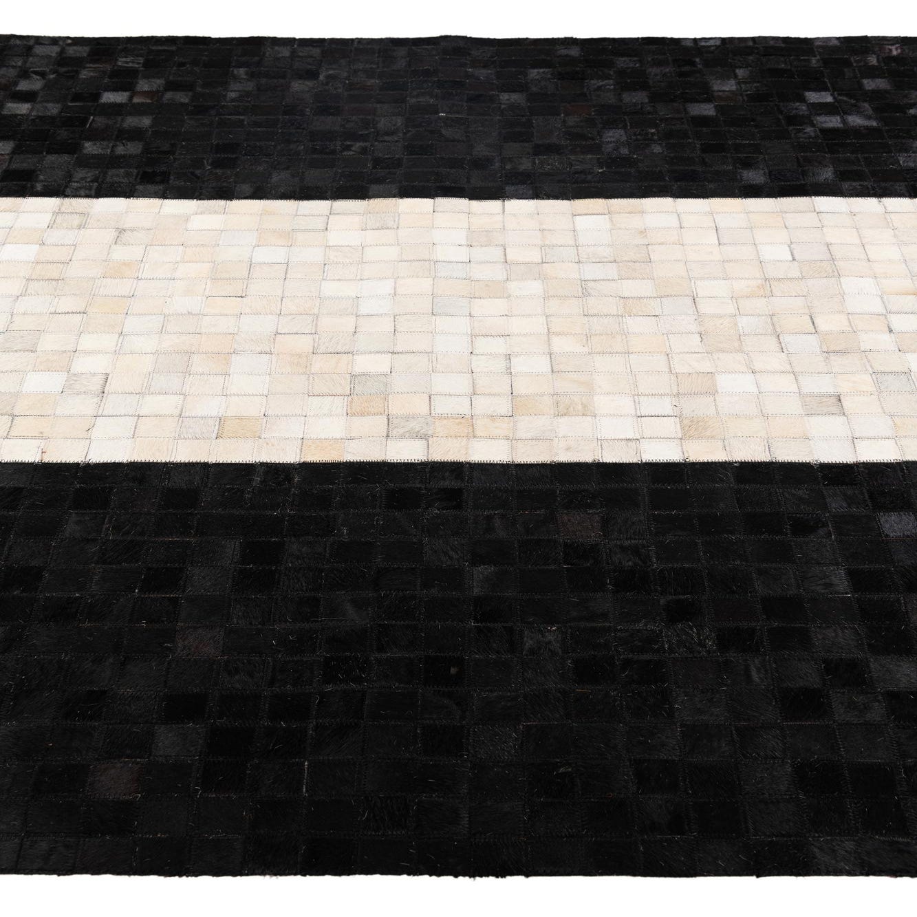 A modern 5x8 rectangular rug with a black cowhide background and a central white rectangular block pattern.