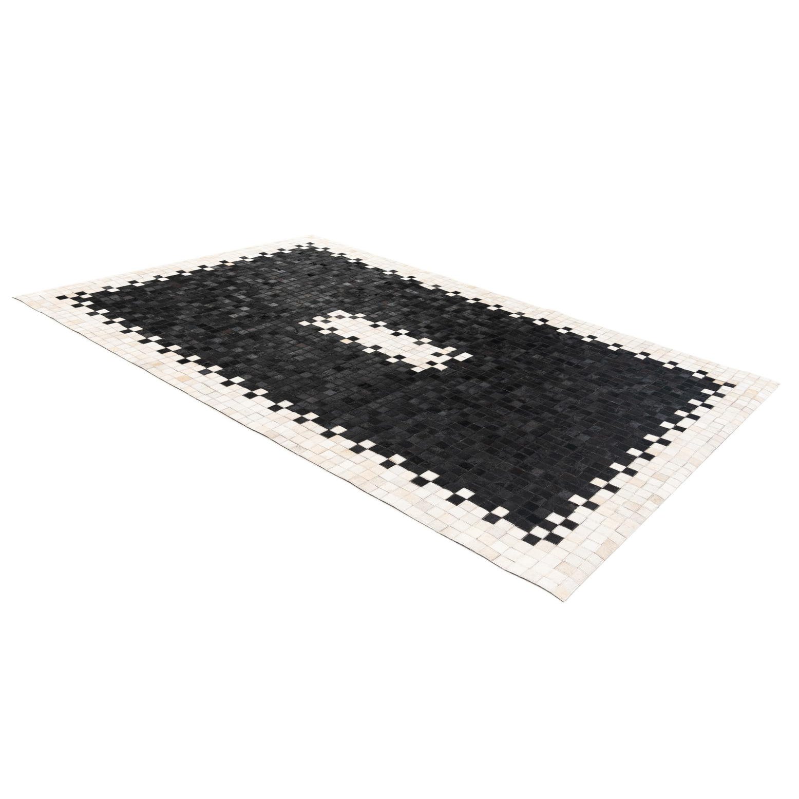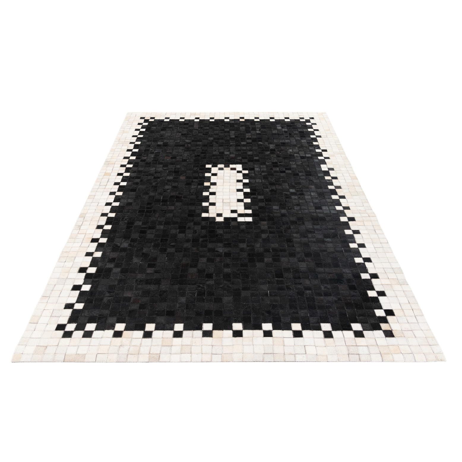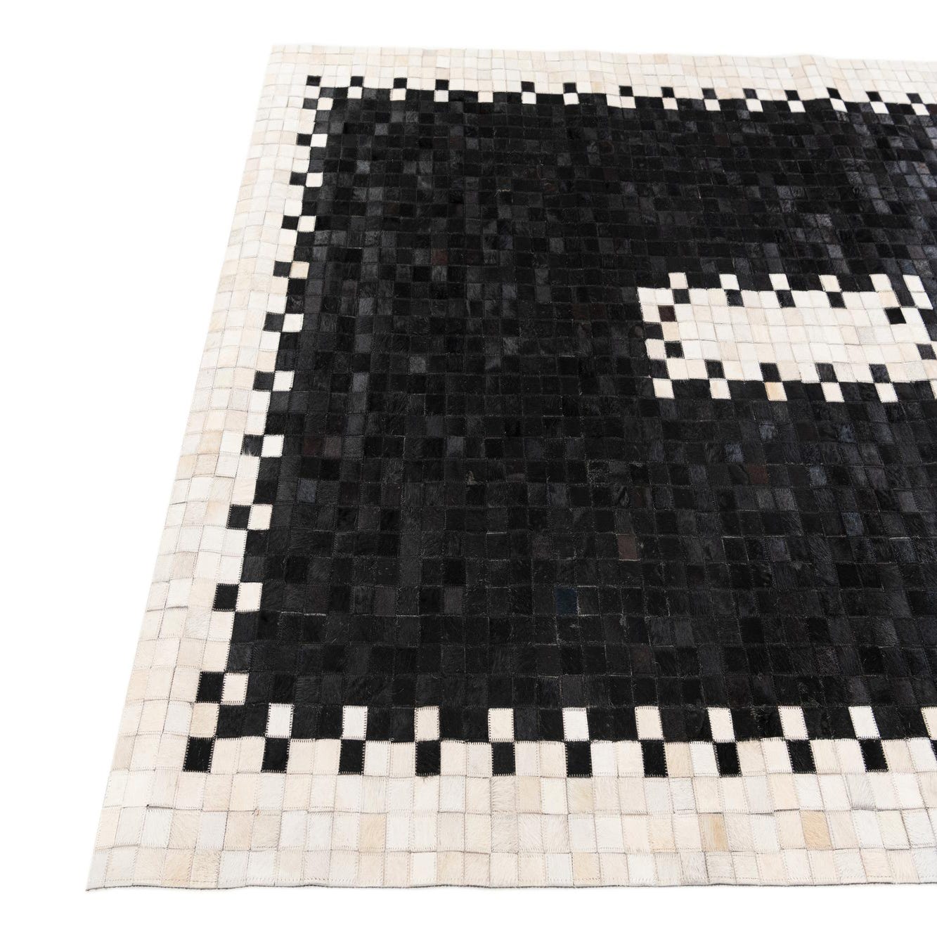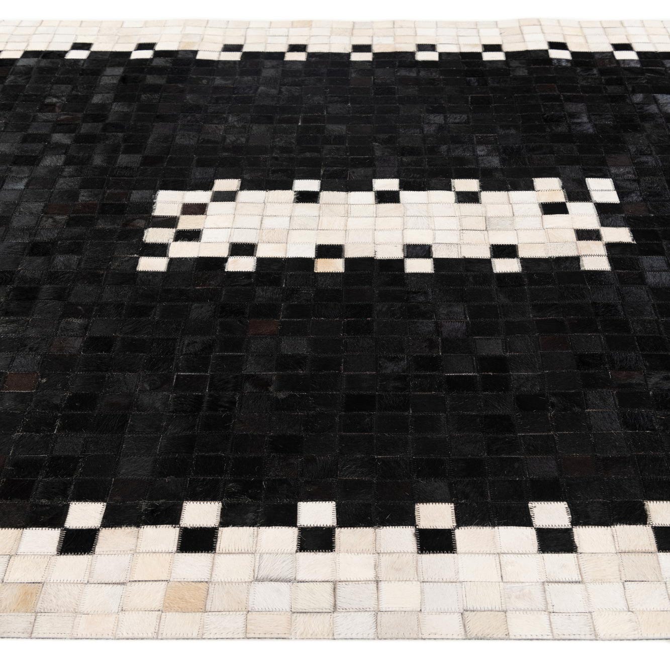 A 5x8 rectangular black modern cowhide rug with a white border and a central white rectangular design, made from small square patches.