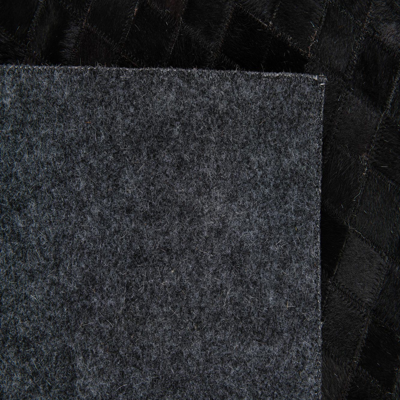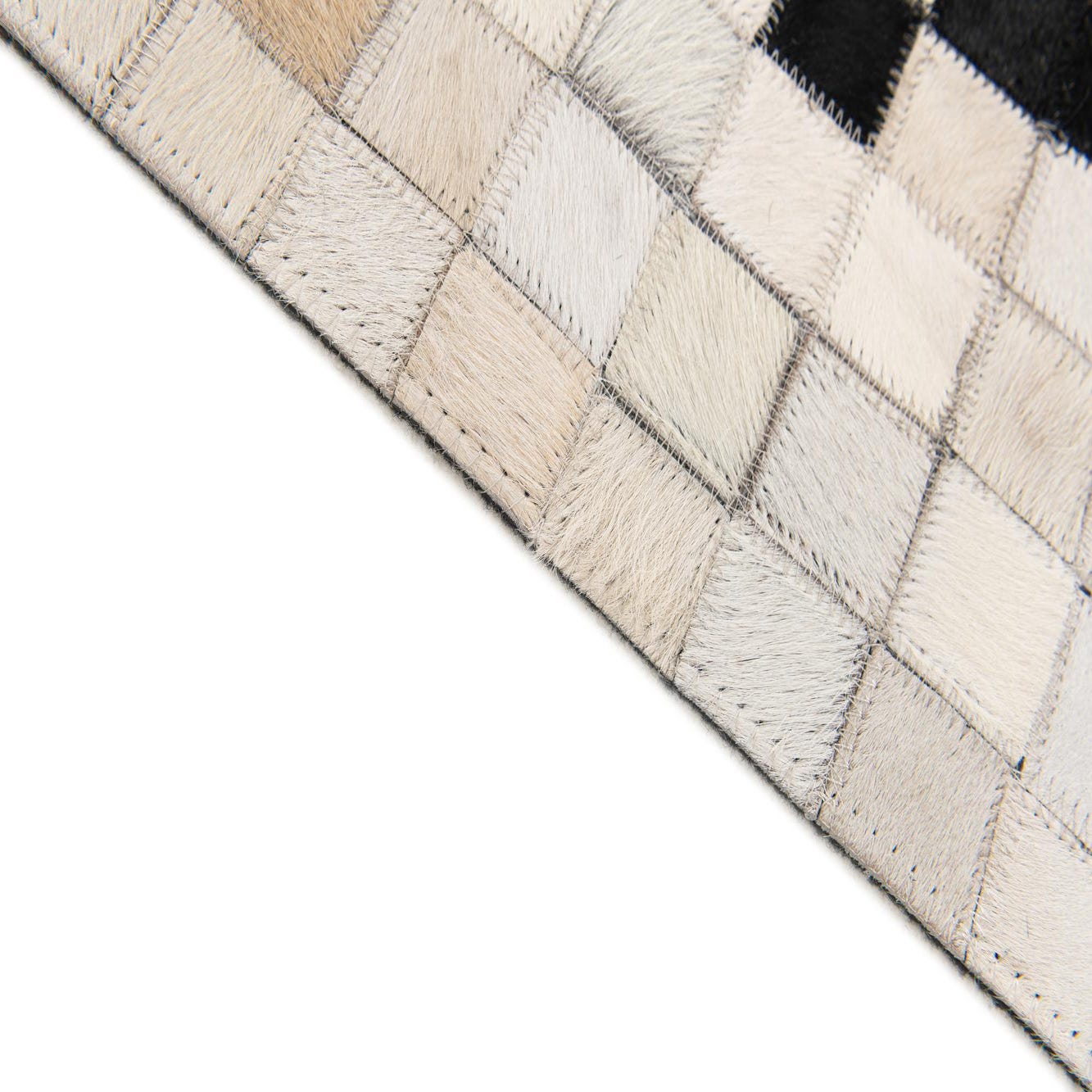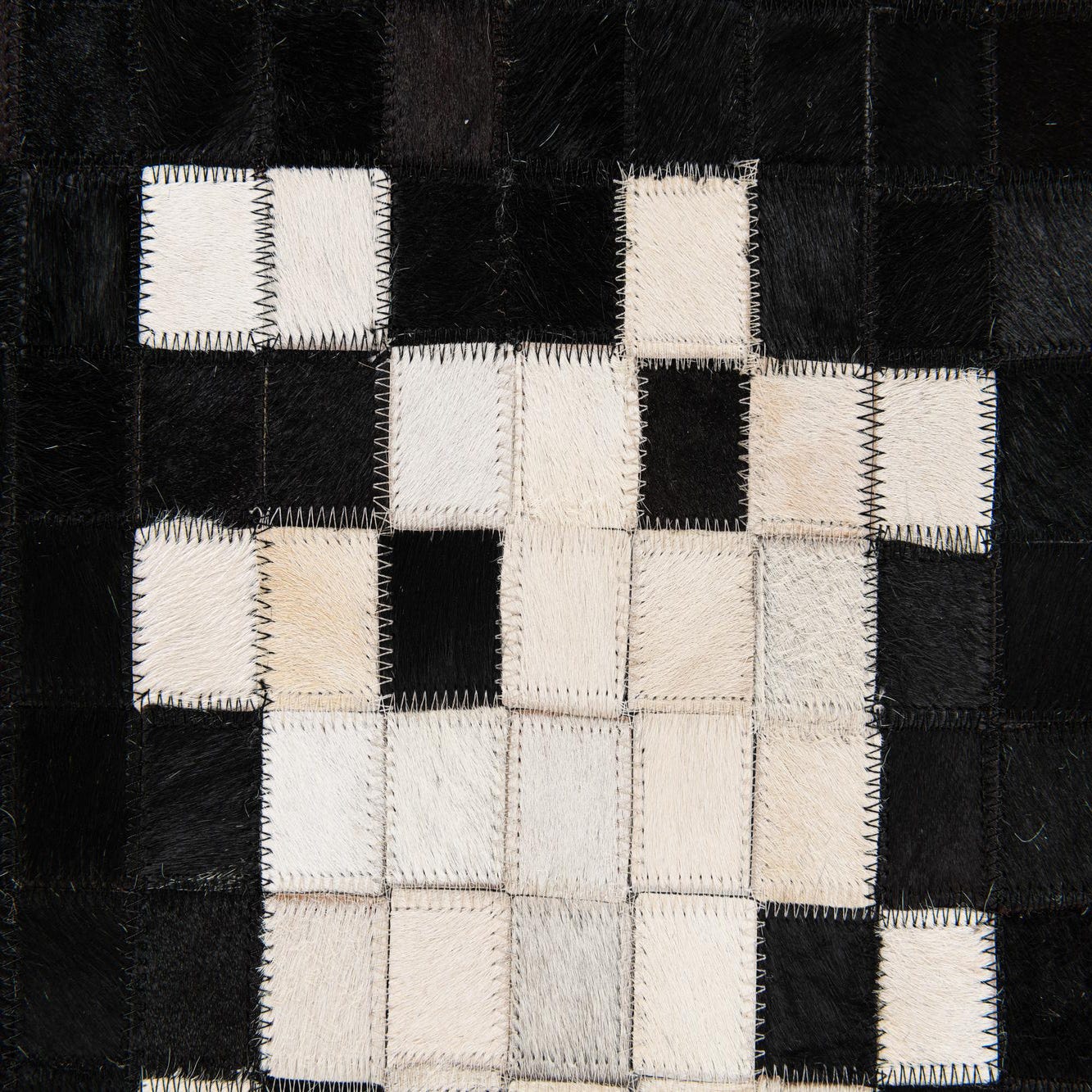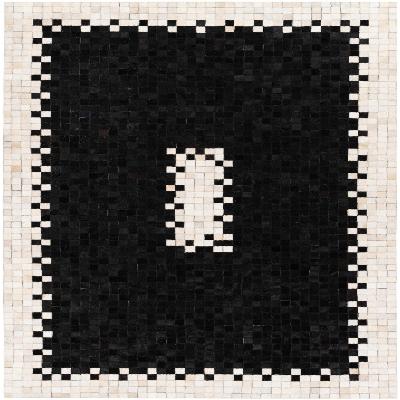 A 5x8 rectangular black modern cowhide rug with a white border and a central white rectangular design, made from small square patches.