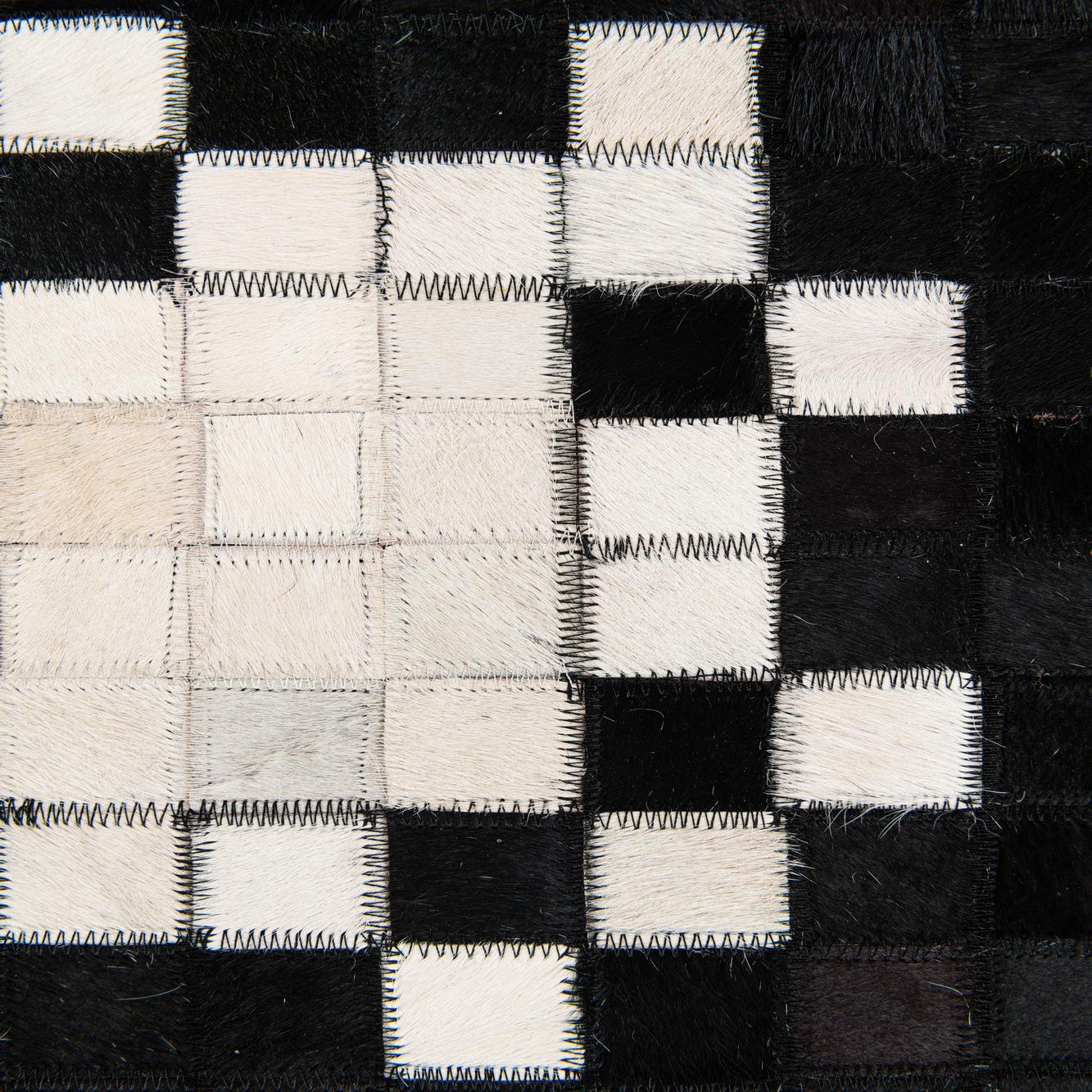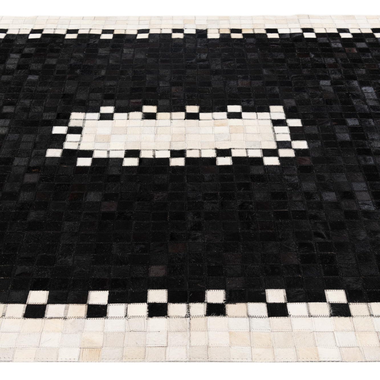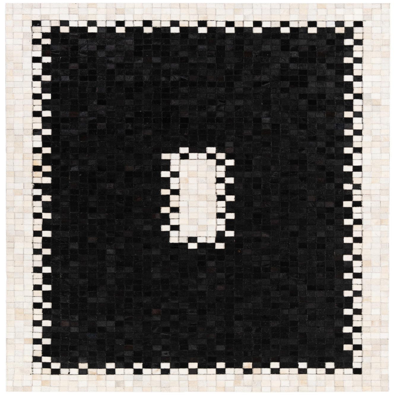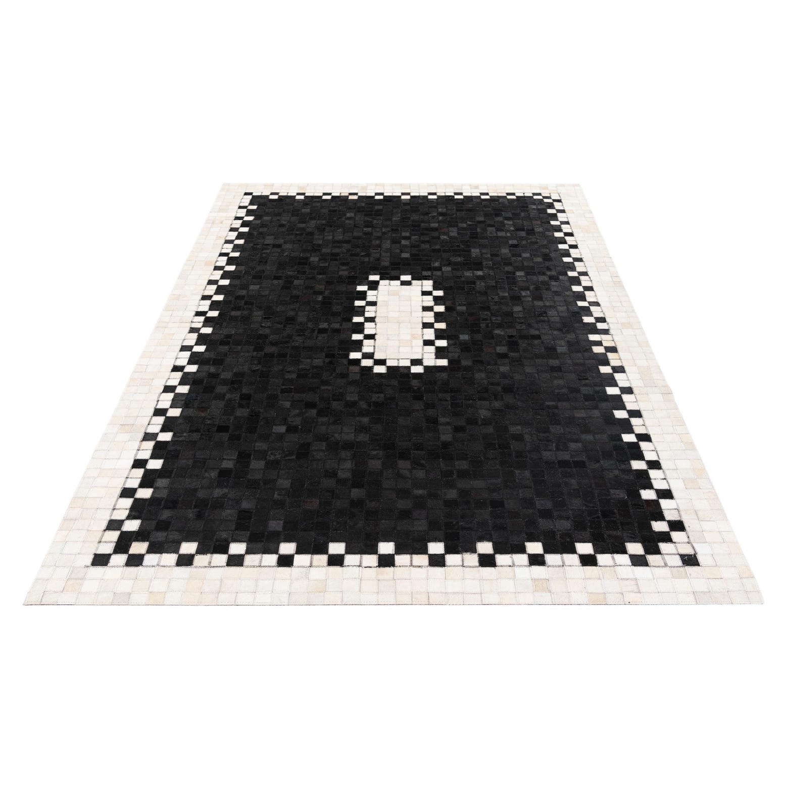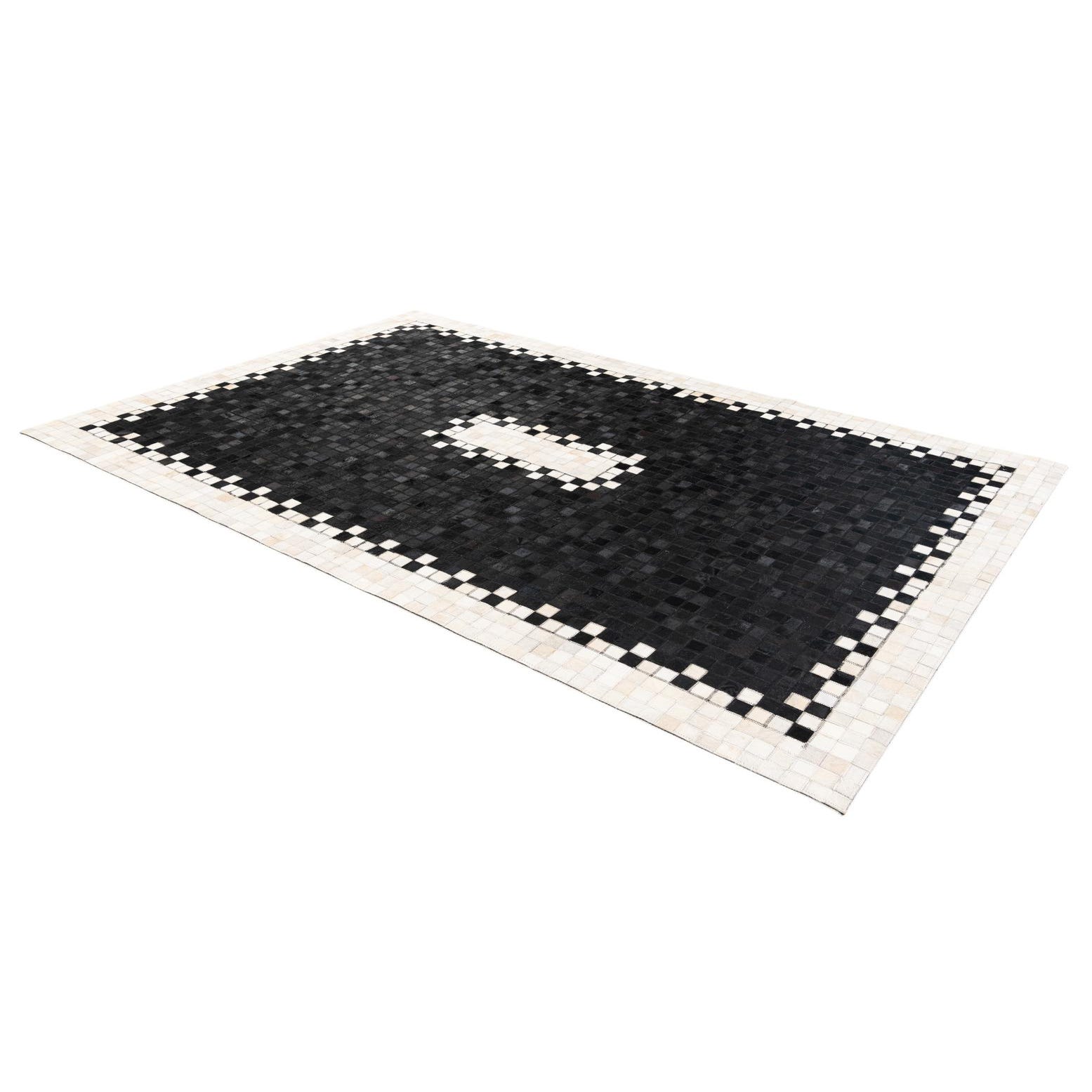 A 5x8 rectangular black modern cowhide rug with a white and black checkerboard border and a central white rectangular accent.