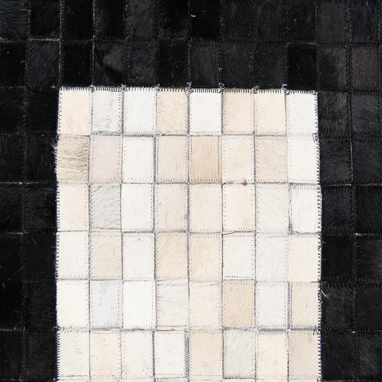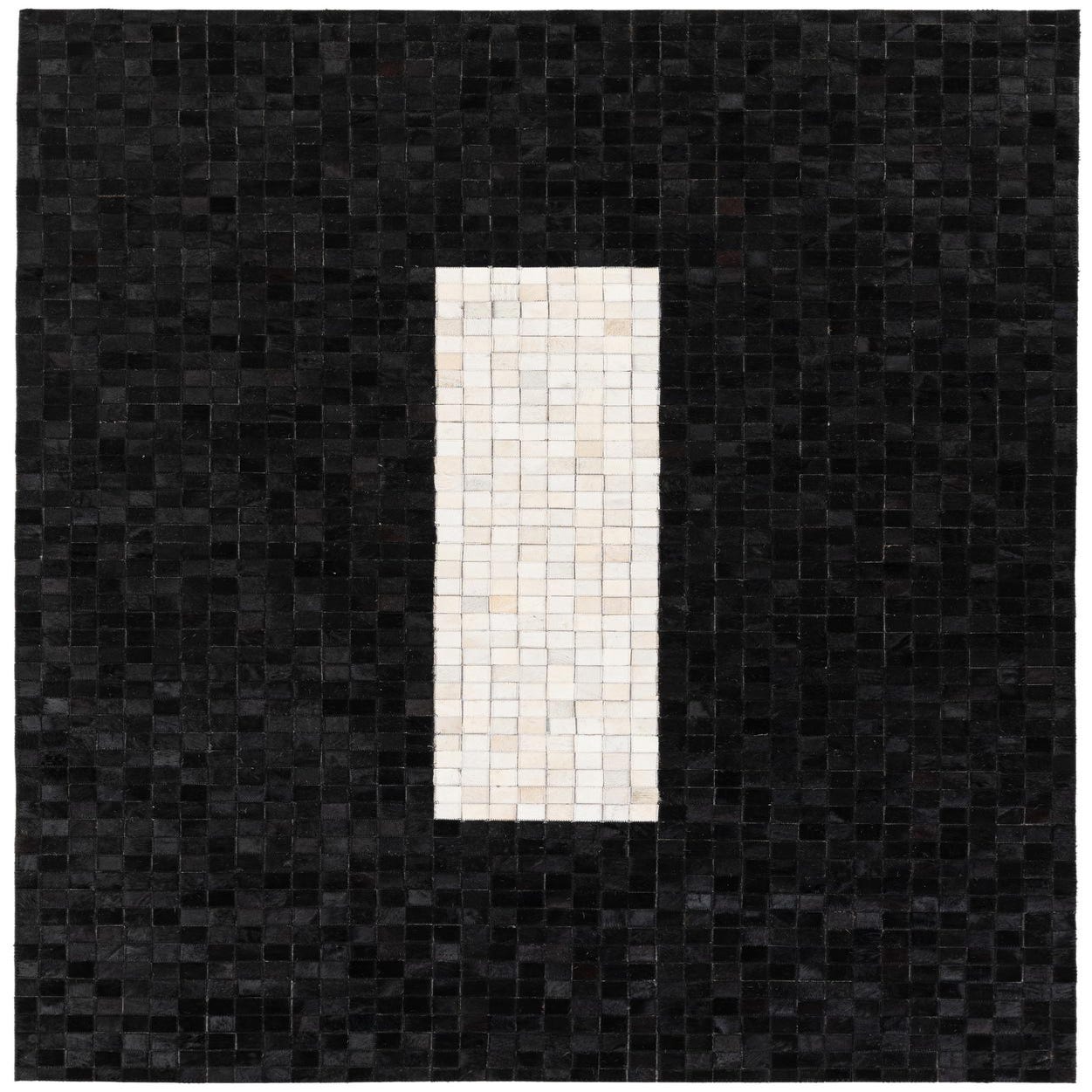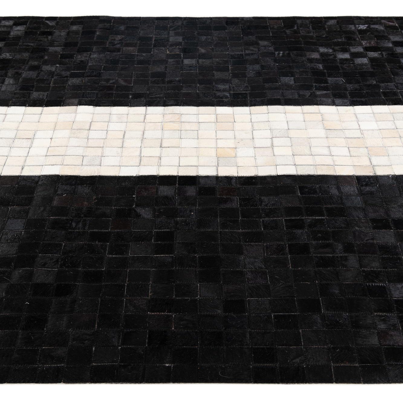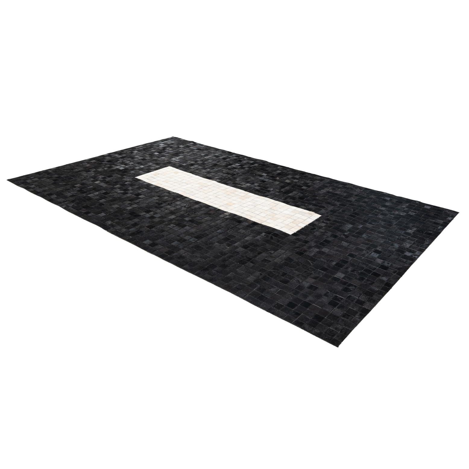 A modern 5x8 rectangular rug with a black cowhide background and a central vertical white stripe.