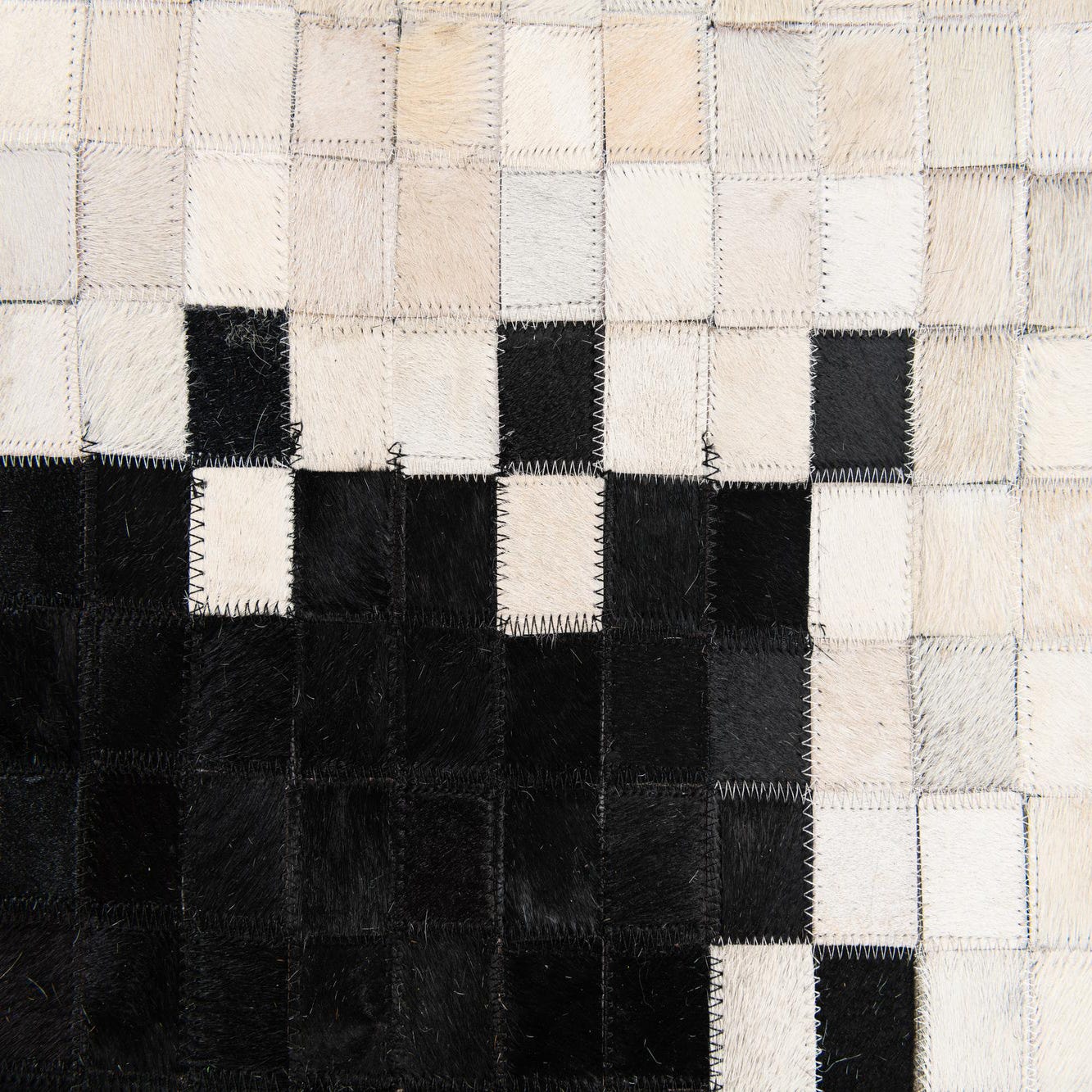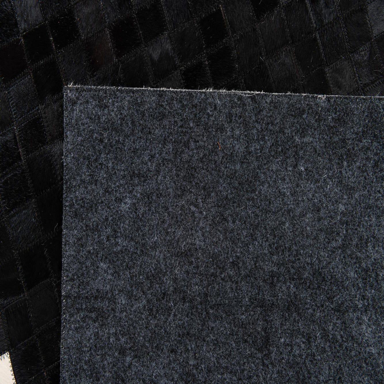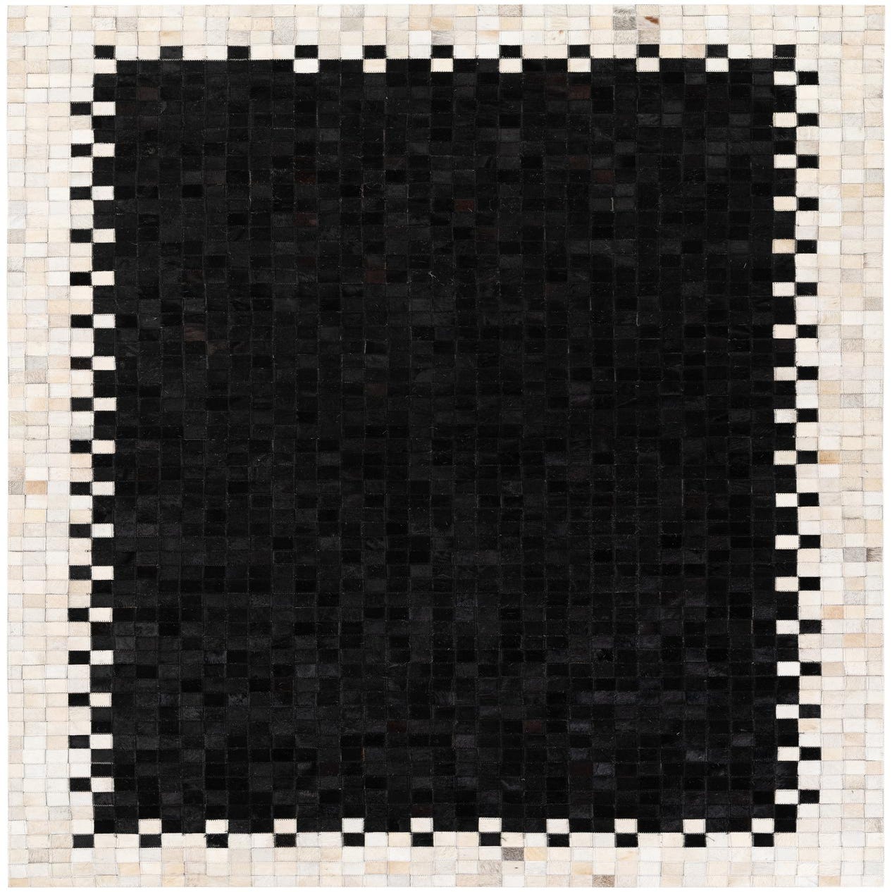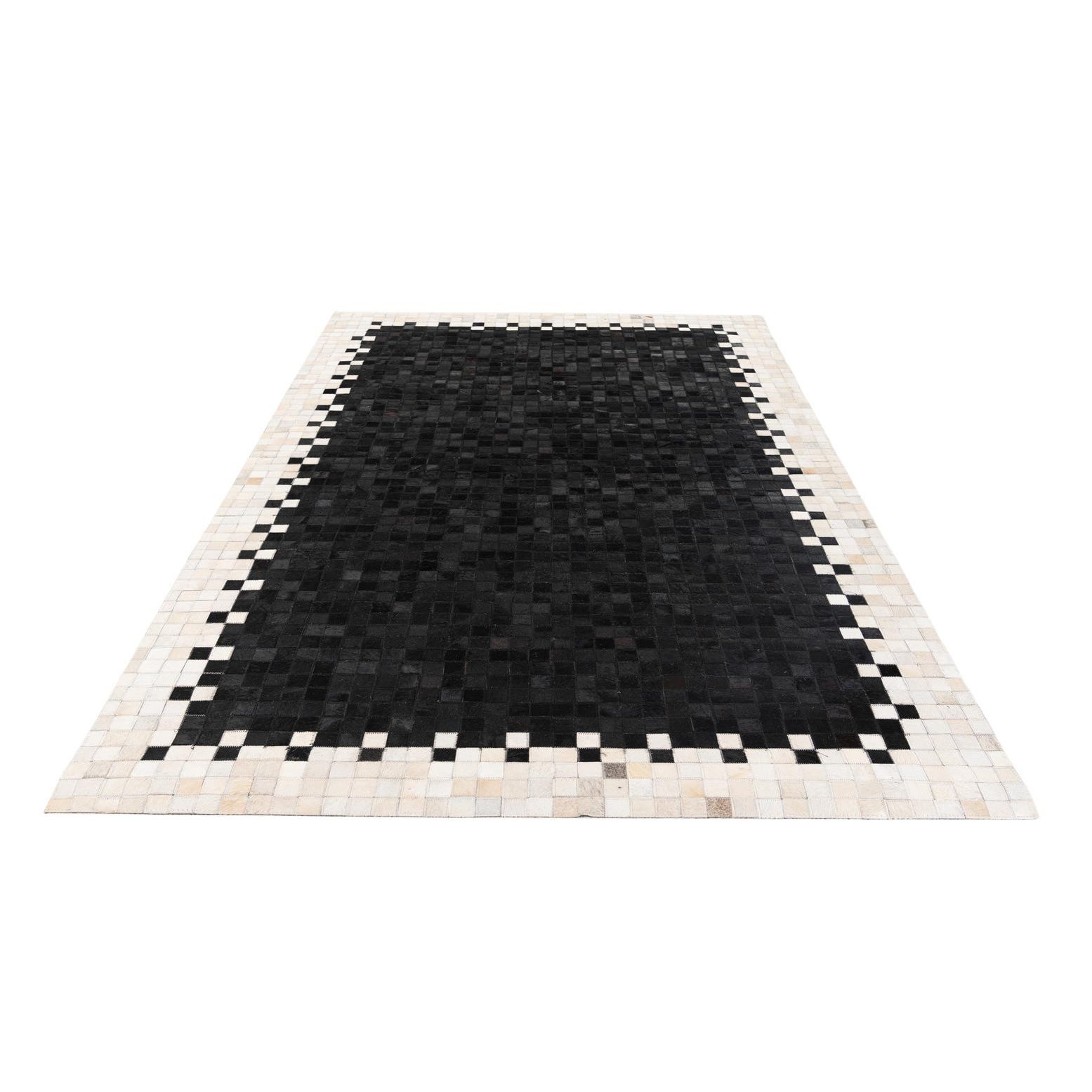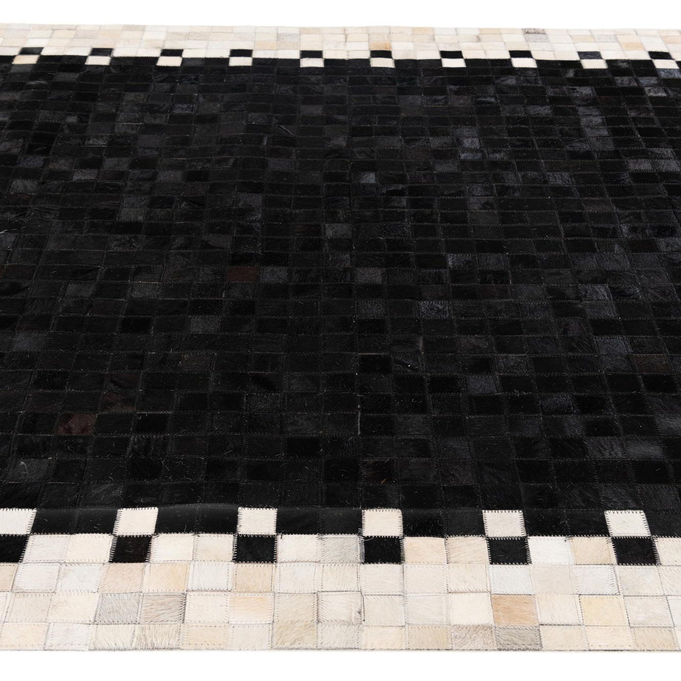A 5x8 rectangular black modern cowhide rug with a white and black checkered border, suitable for a living room.