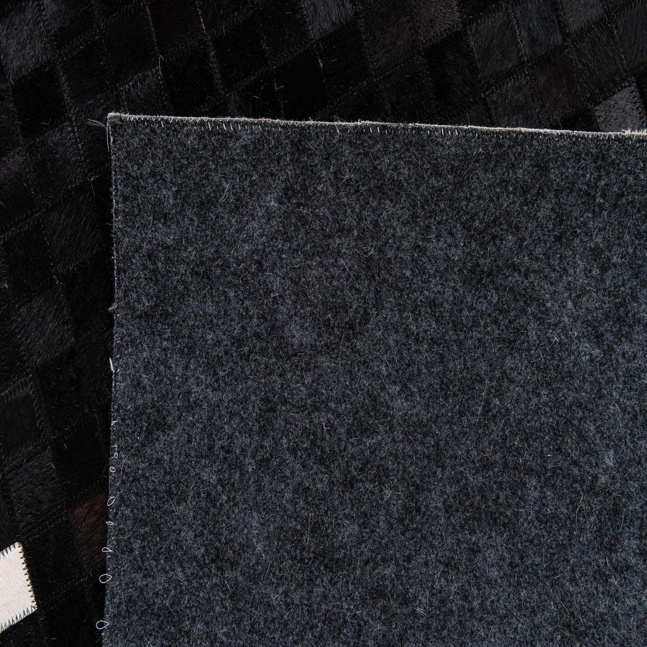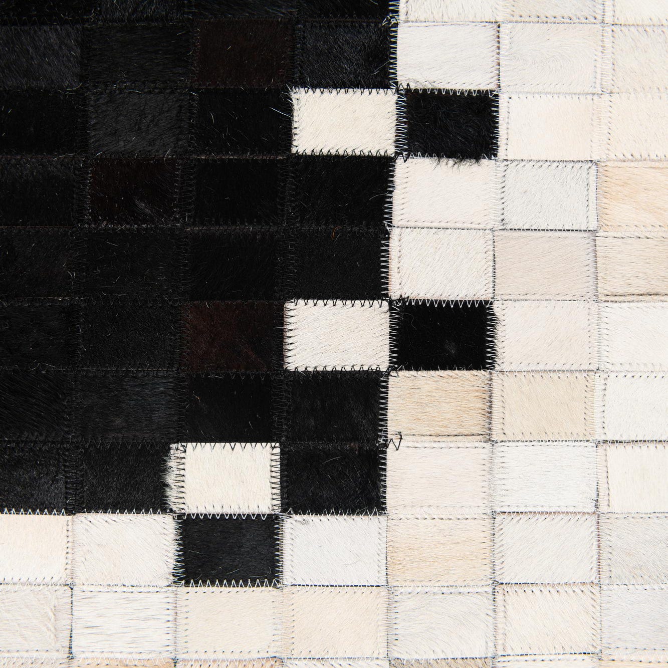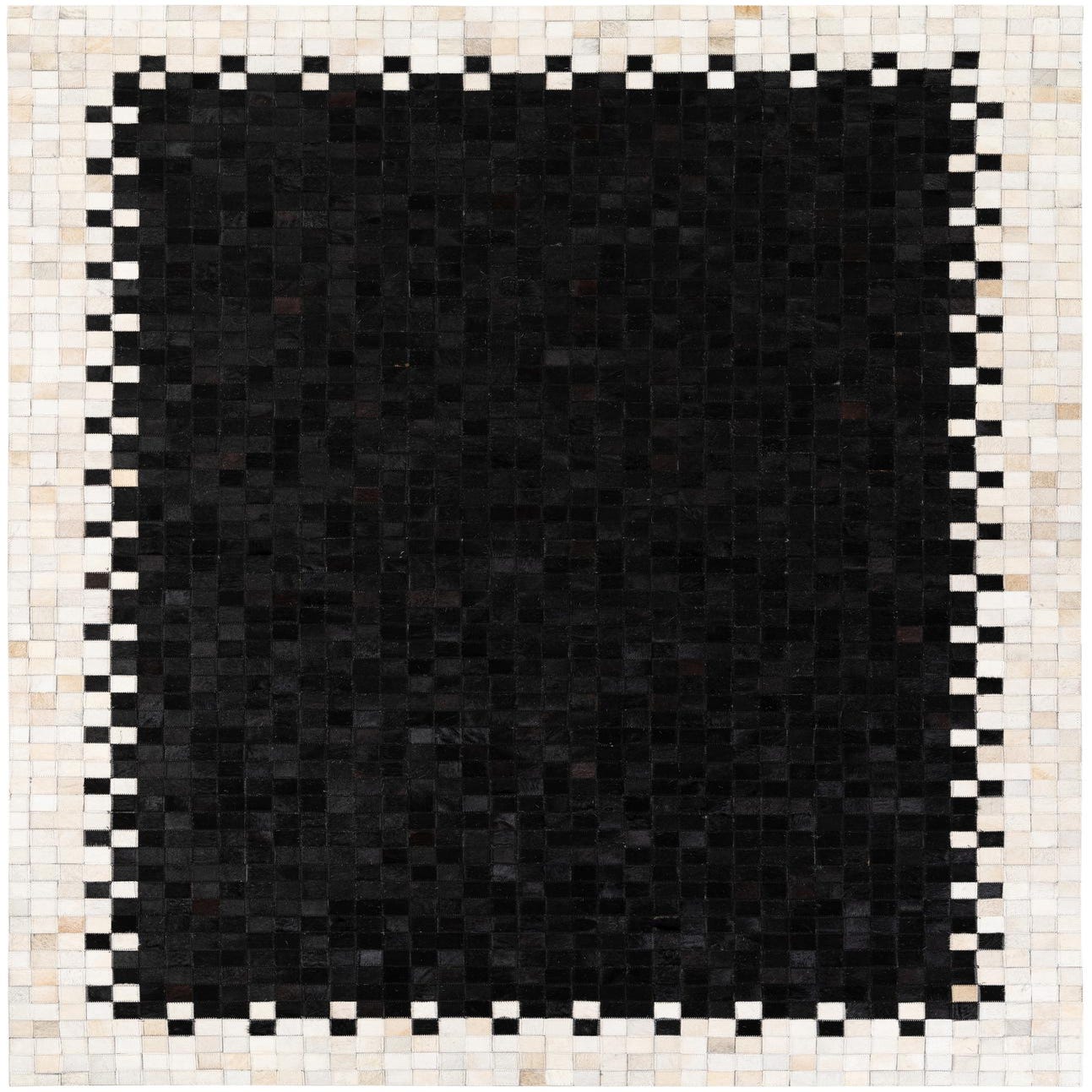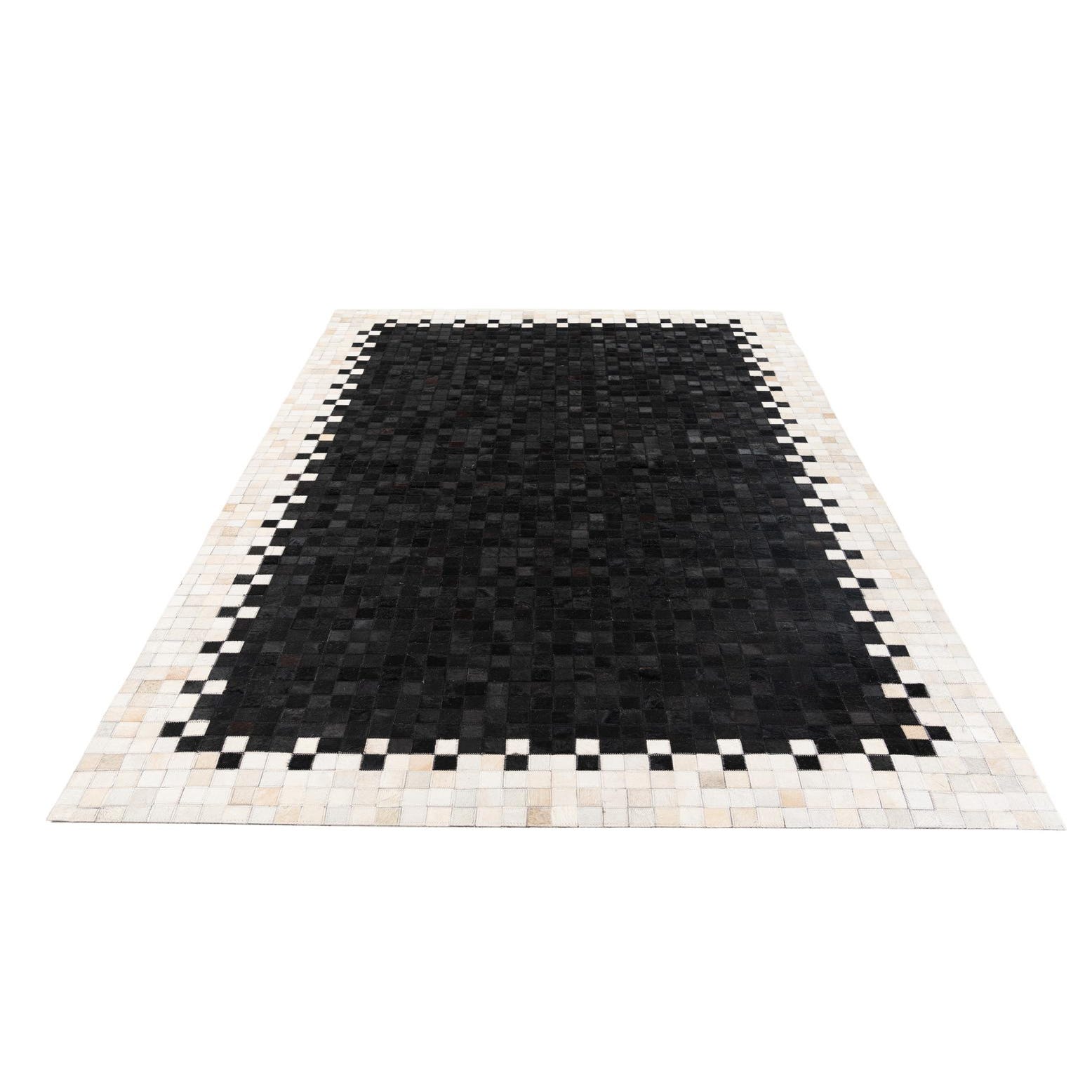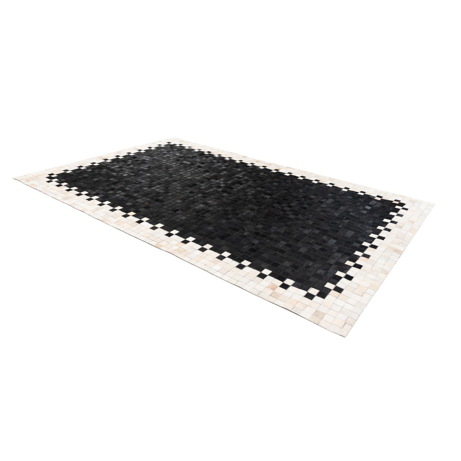 A 5x8 rectangular black modern cowhide rug with a white and black checkered border, suitable for a living room.