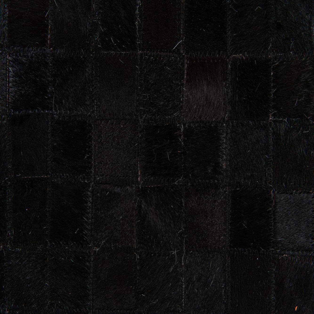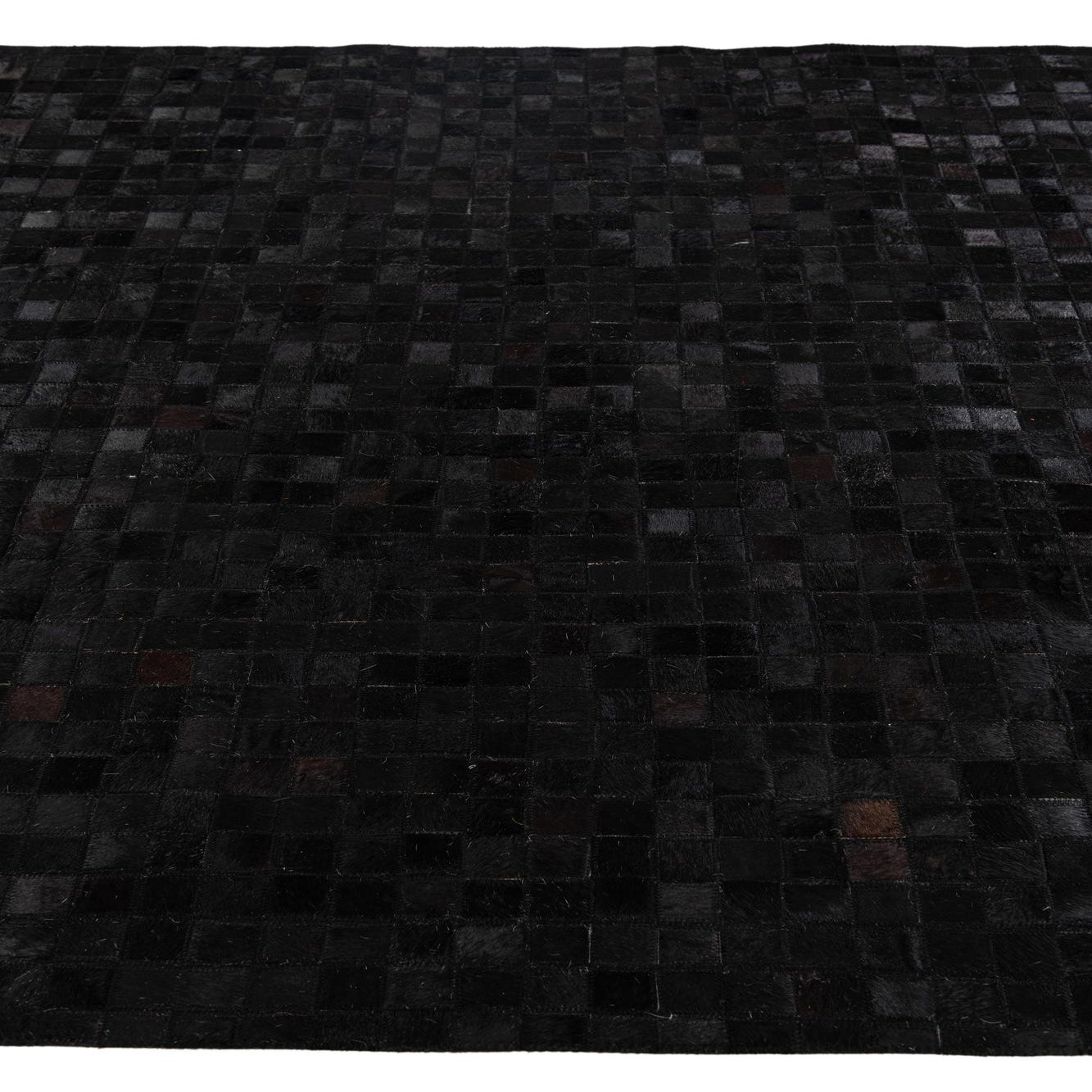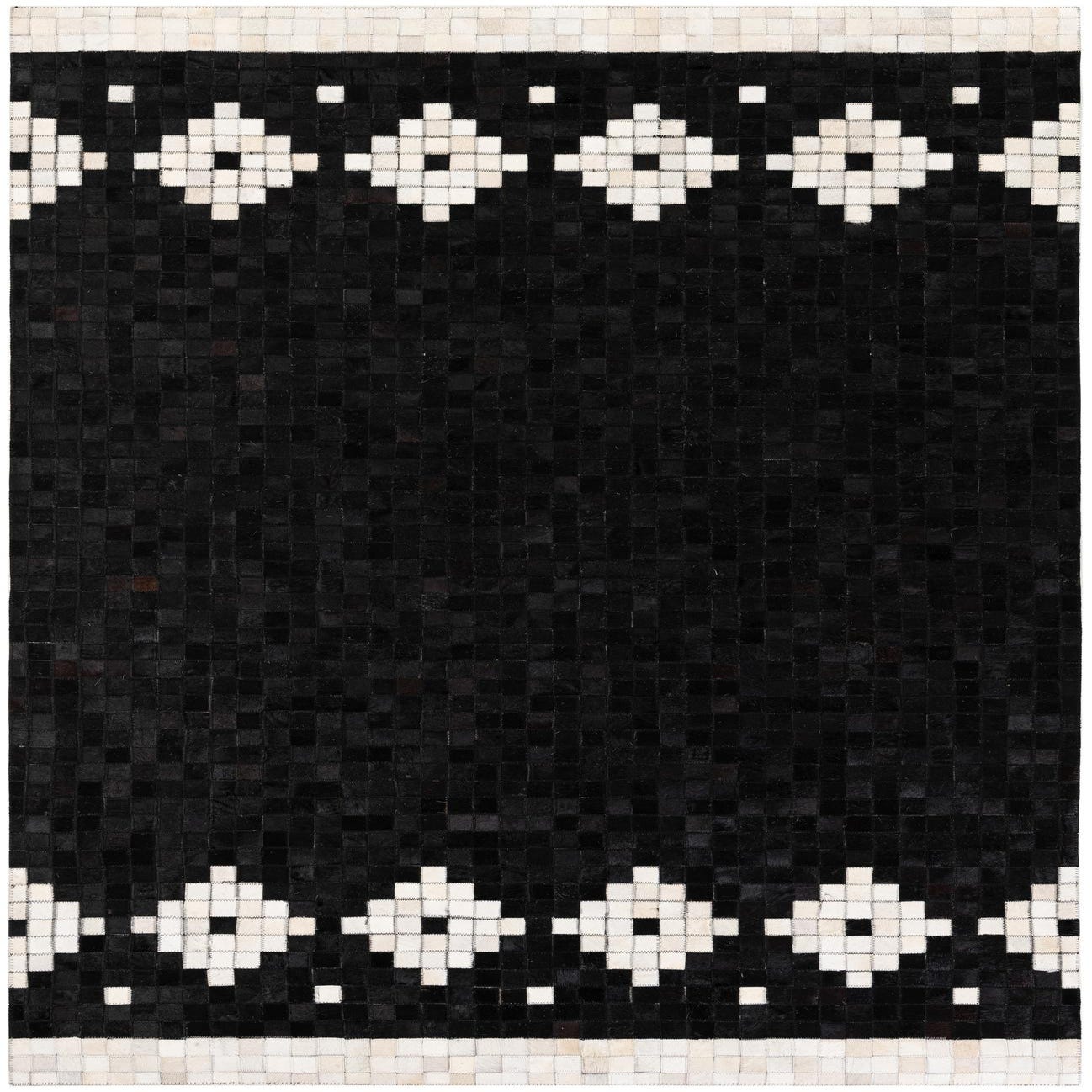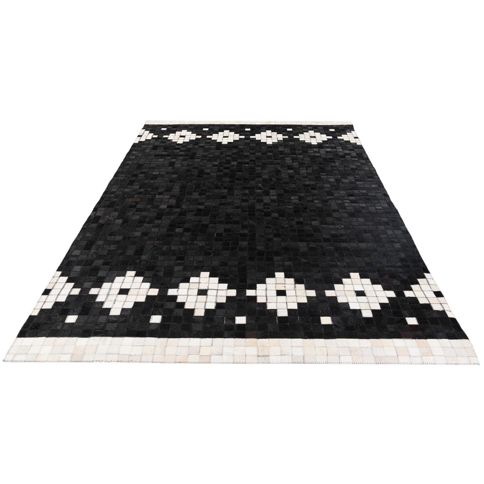 A 5x8 rectangular black cowhide rug with a modern geometric pattern of white diamond shapes and small squares along the top and bottom borders.