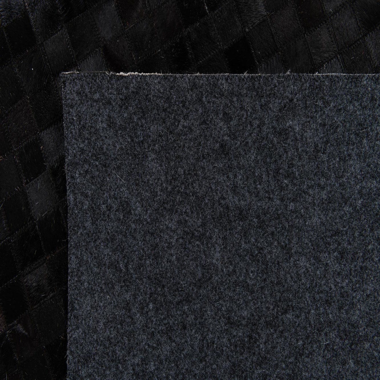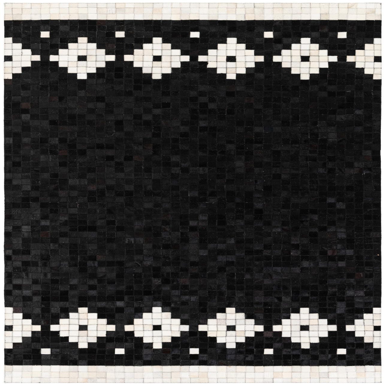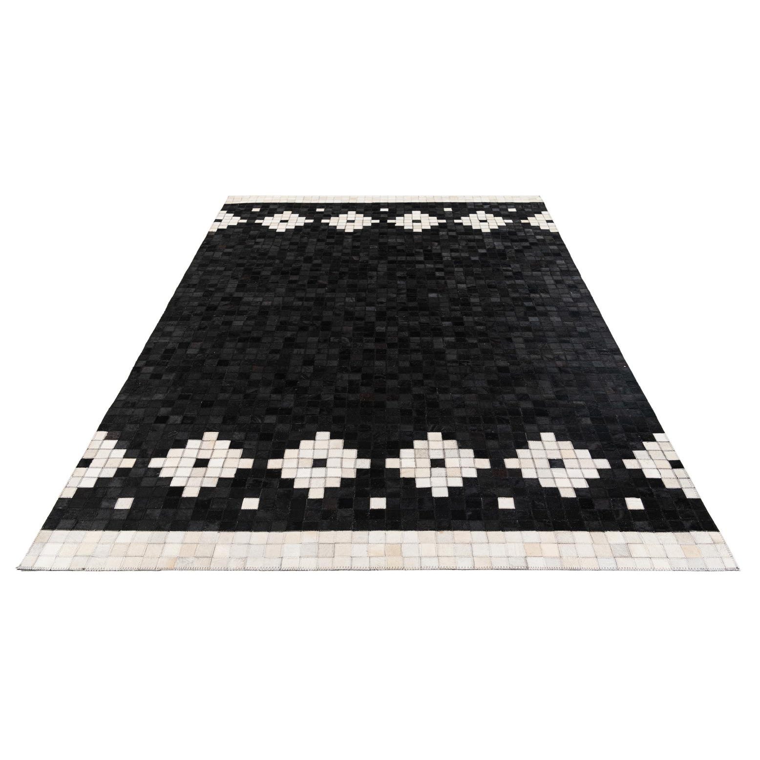 A 5x8 rectangular black cowhide rug with a modern geometric pattern of white diamonds and squares at the top and bottom borders.