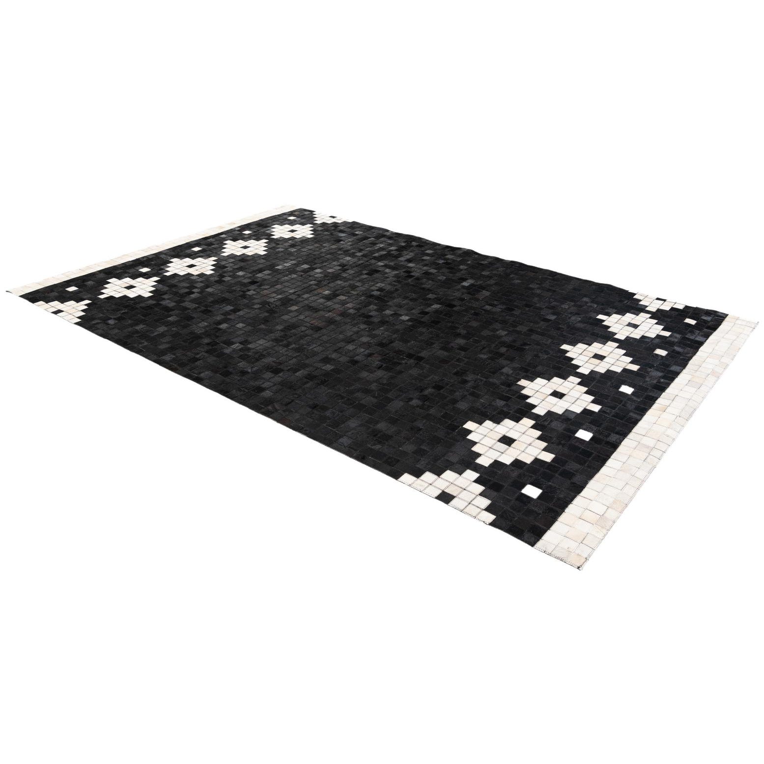 A 5x8 rectangular black patchwork cowhide rug with white geometric diamond and square borders at the top and bottom.