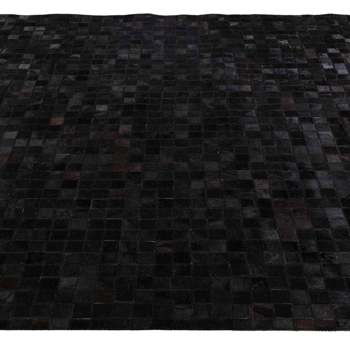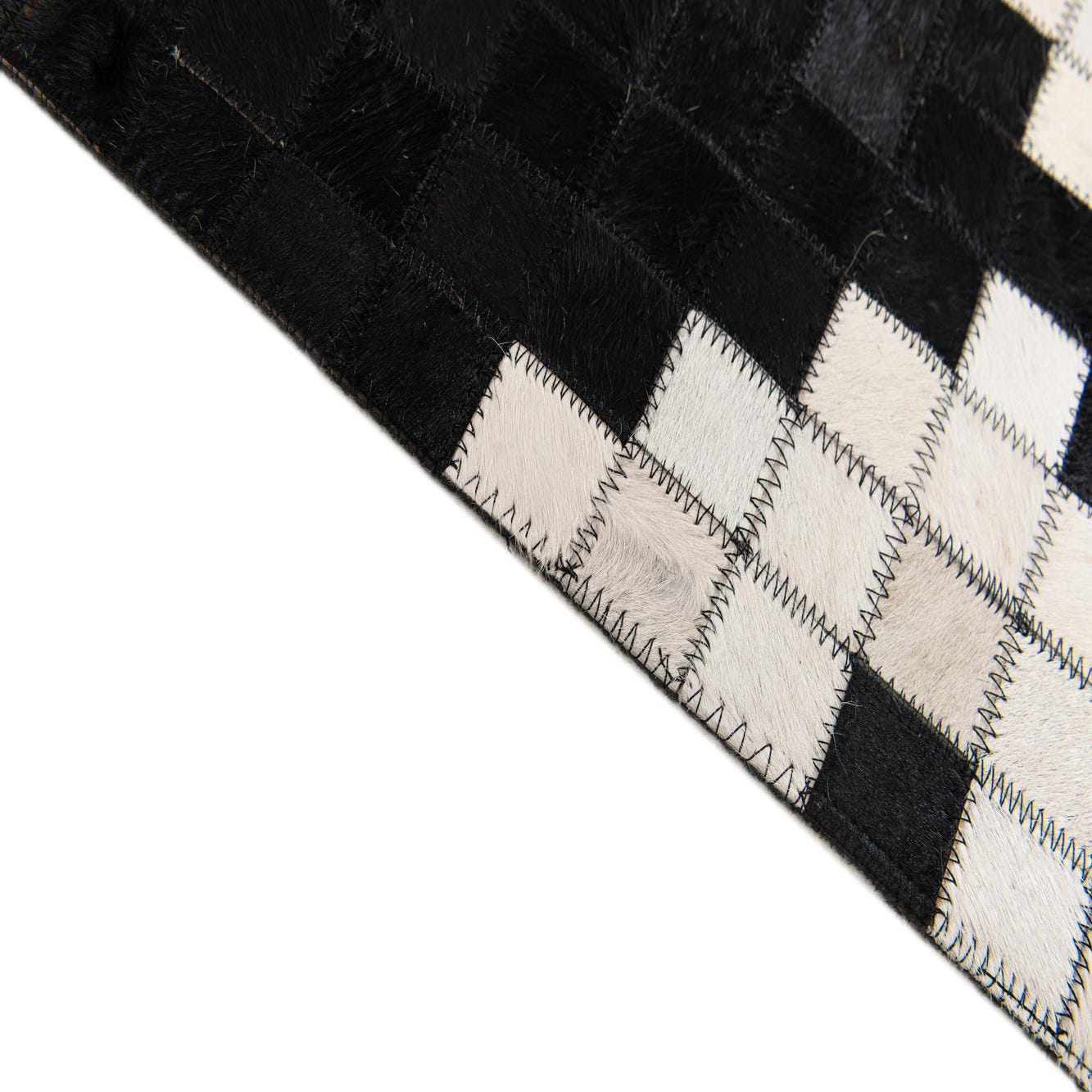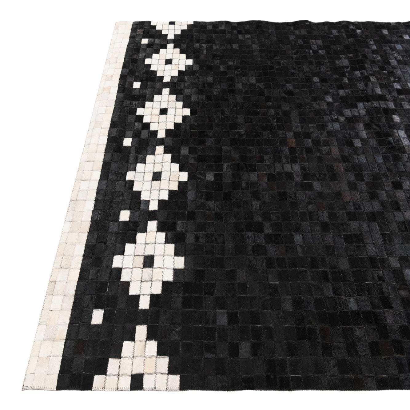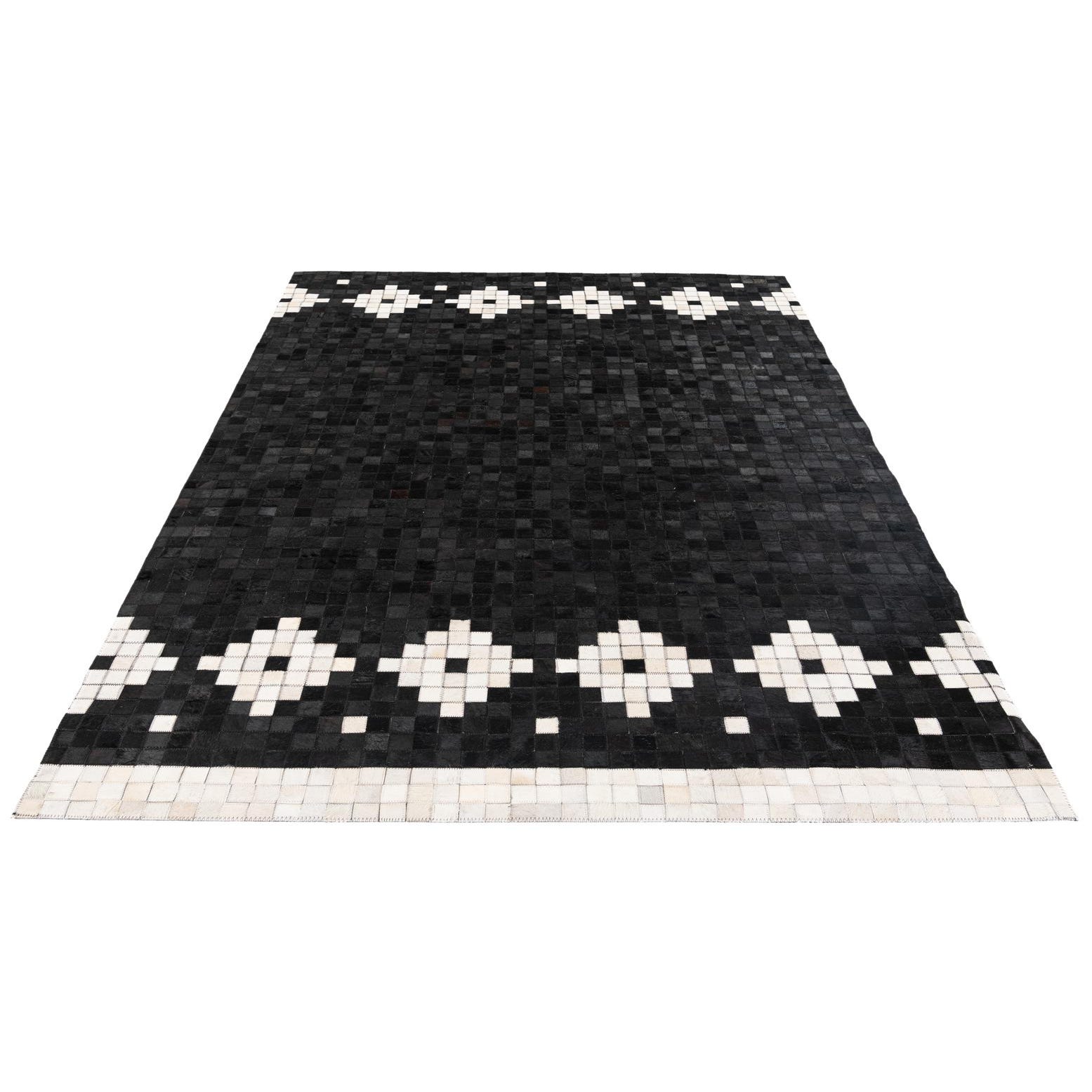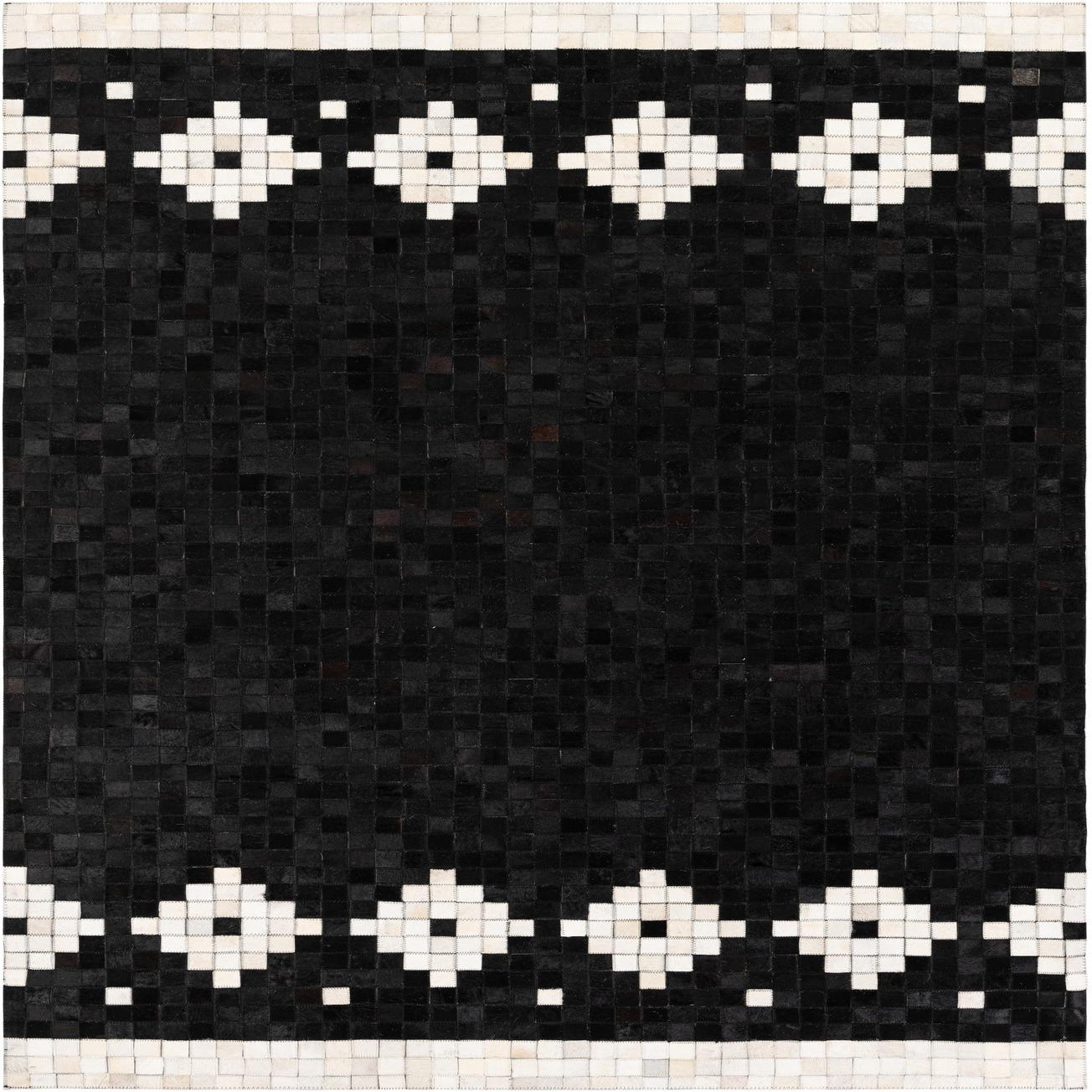 A bold black field formed from small, hand-stitched cowhide squares creates a refined pixel-like ground, punctuated by a repeating row of ivory diamond motifs along the short ends. Subtle brown and tan variations within the black tiles add depth and natural character, while narrow ivory borders frame the pattern for a clean finish. Handmade of cowhide and leather, the surface offers the soft, slightly velvety feel of hair-on-hide with the tactile structure of stitched panels and visible leather seams.
