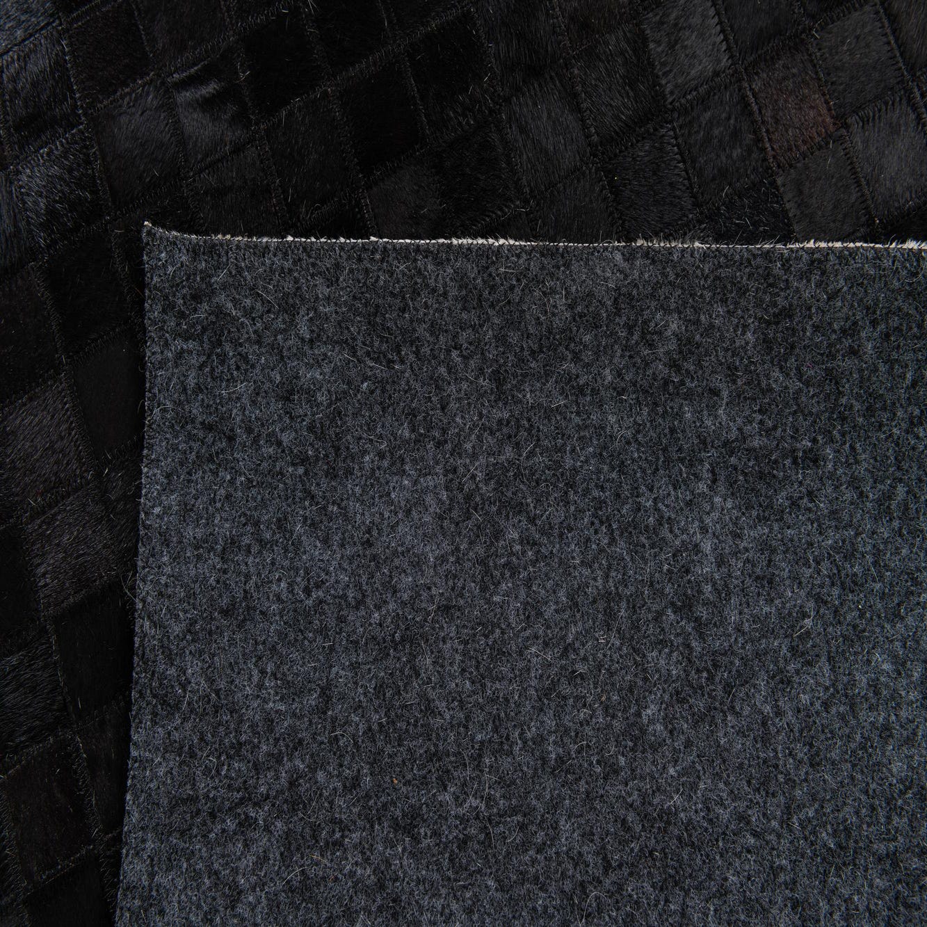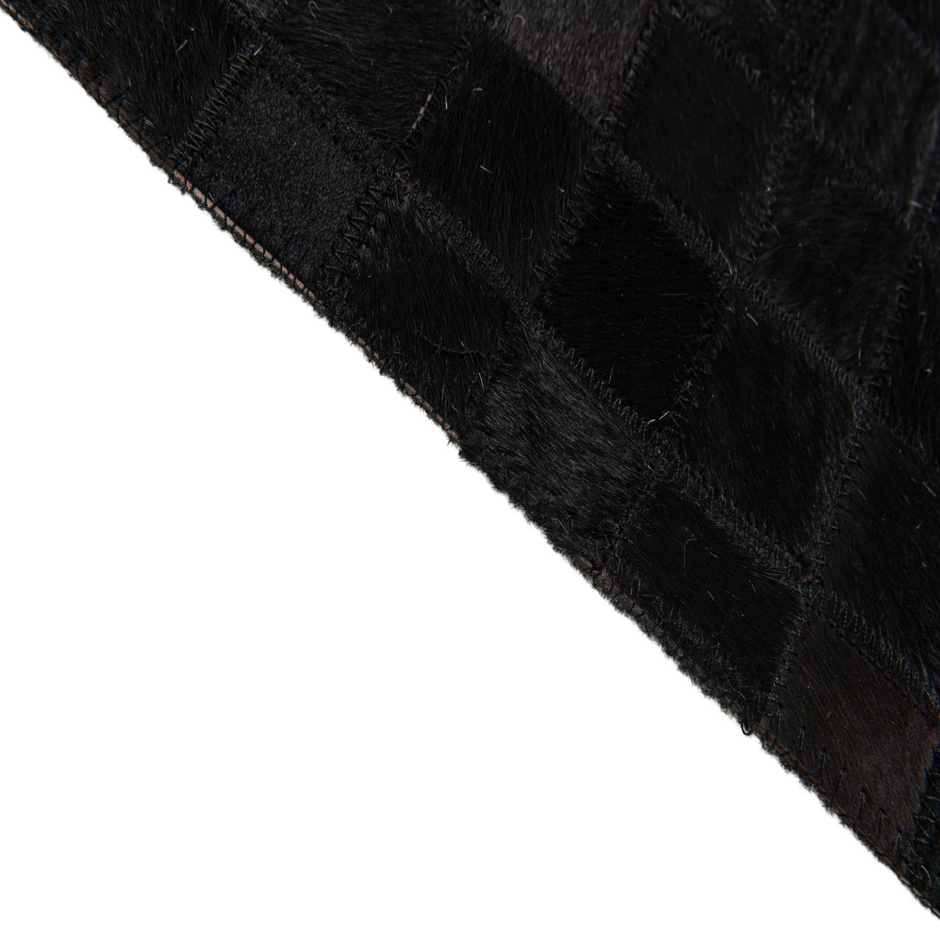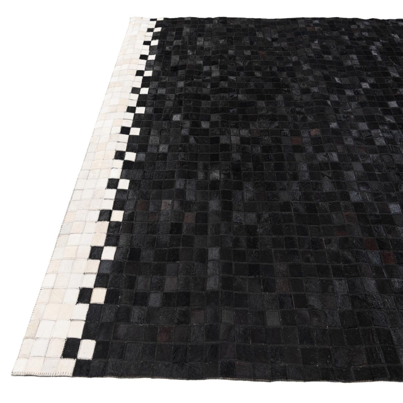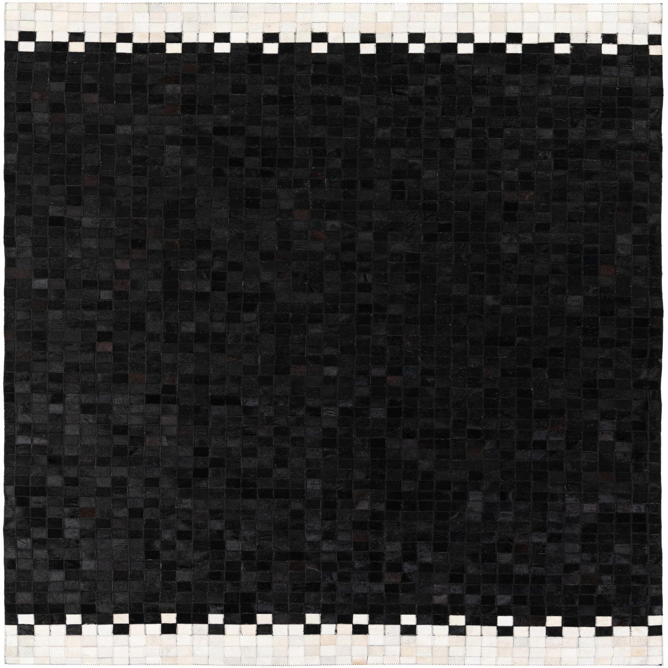 A 5x8 rectangular black cowhide rug with a modern design, featuring a mosaic of black squares and a white and black checkered border.
