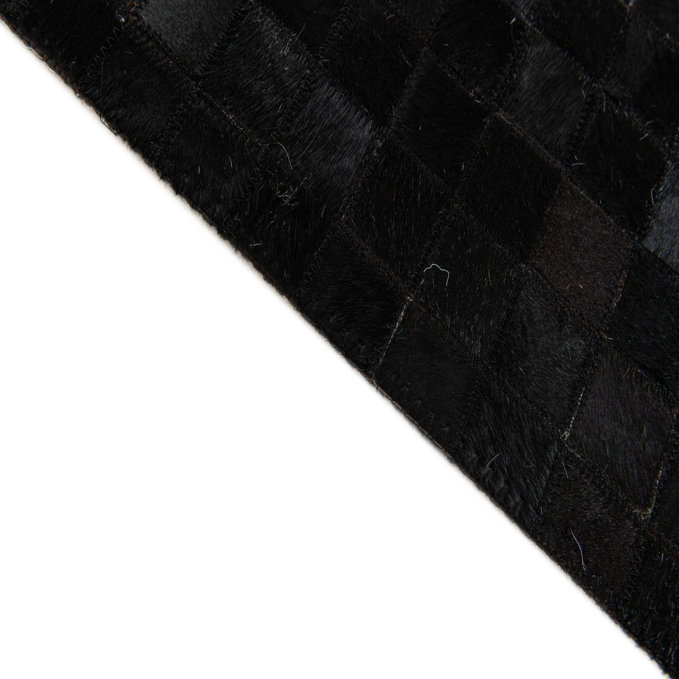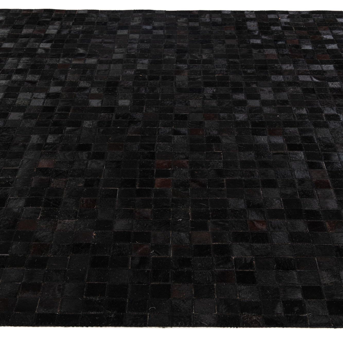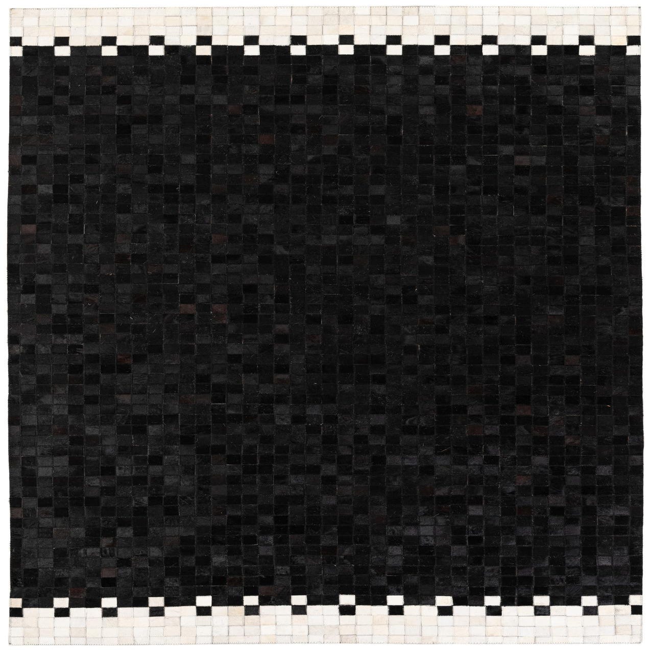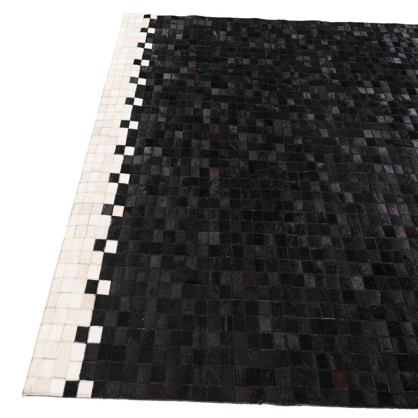 A 5x8 rectangular black modern cowhide rug with a white and black checkered border at the top and bottom edges.