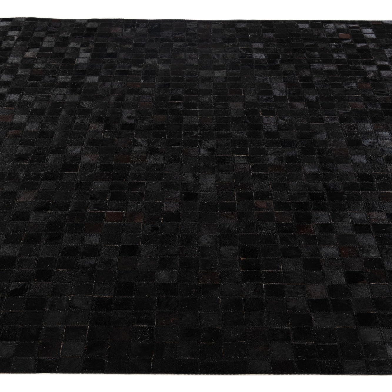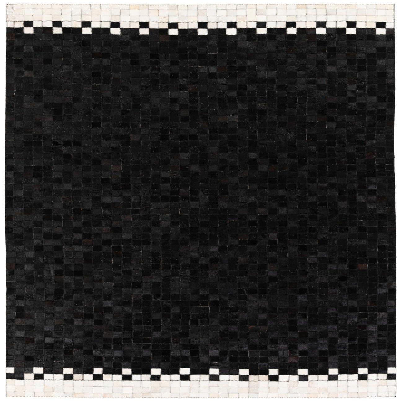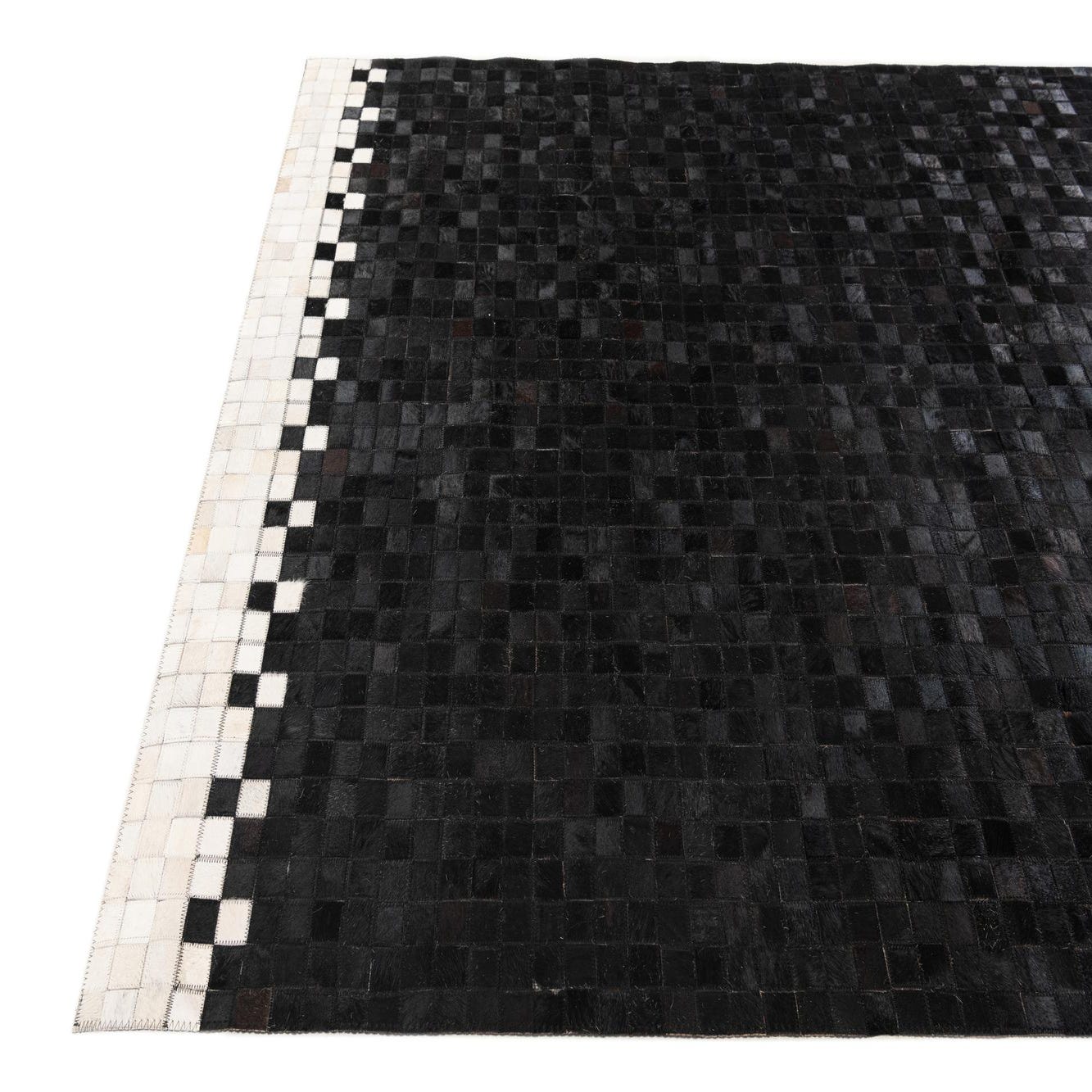 A 5x8 rectangular black modern cowhide rug with a white and black checkered border at the top and bottom.