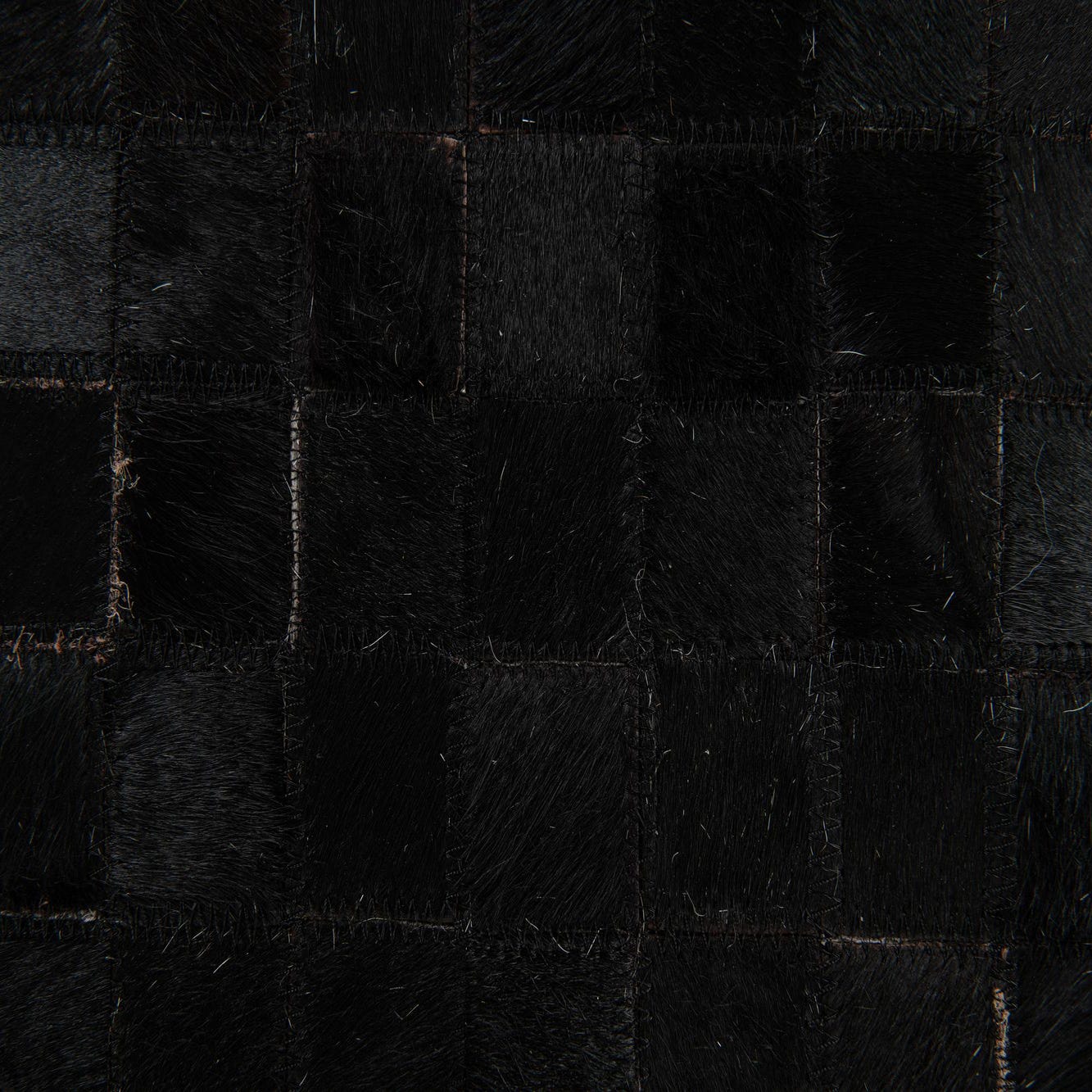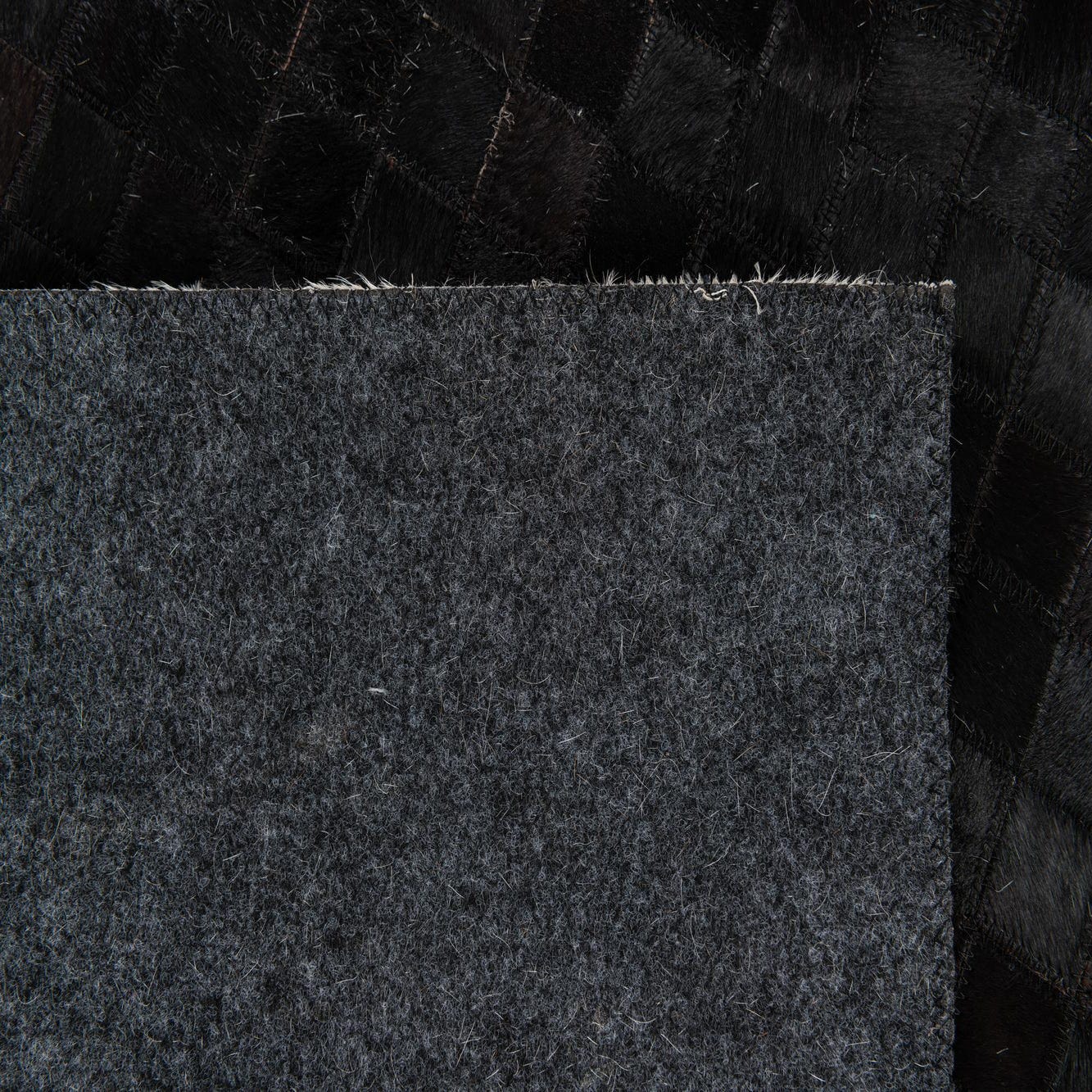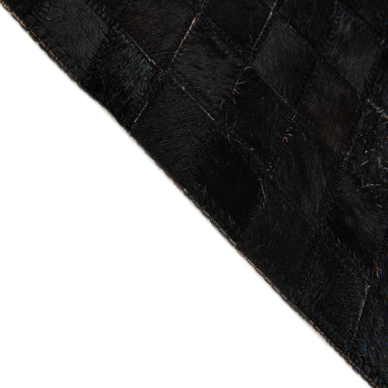 A 5x8 rectangular black modern cowhide rug with a white and black checkered border at the top and bottom.