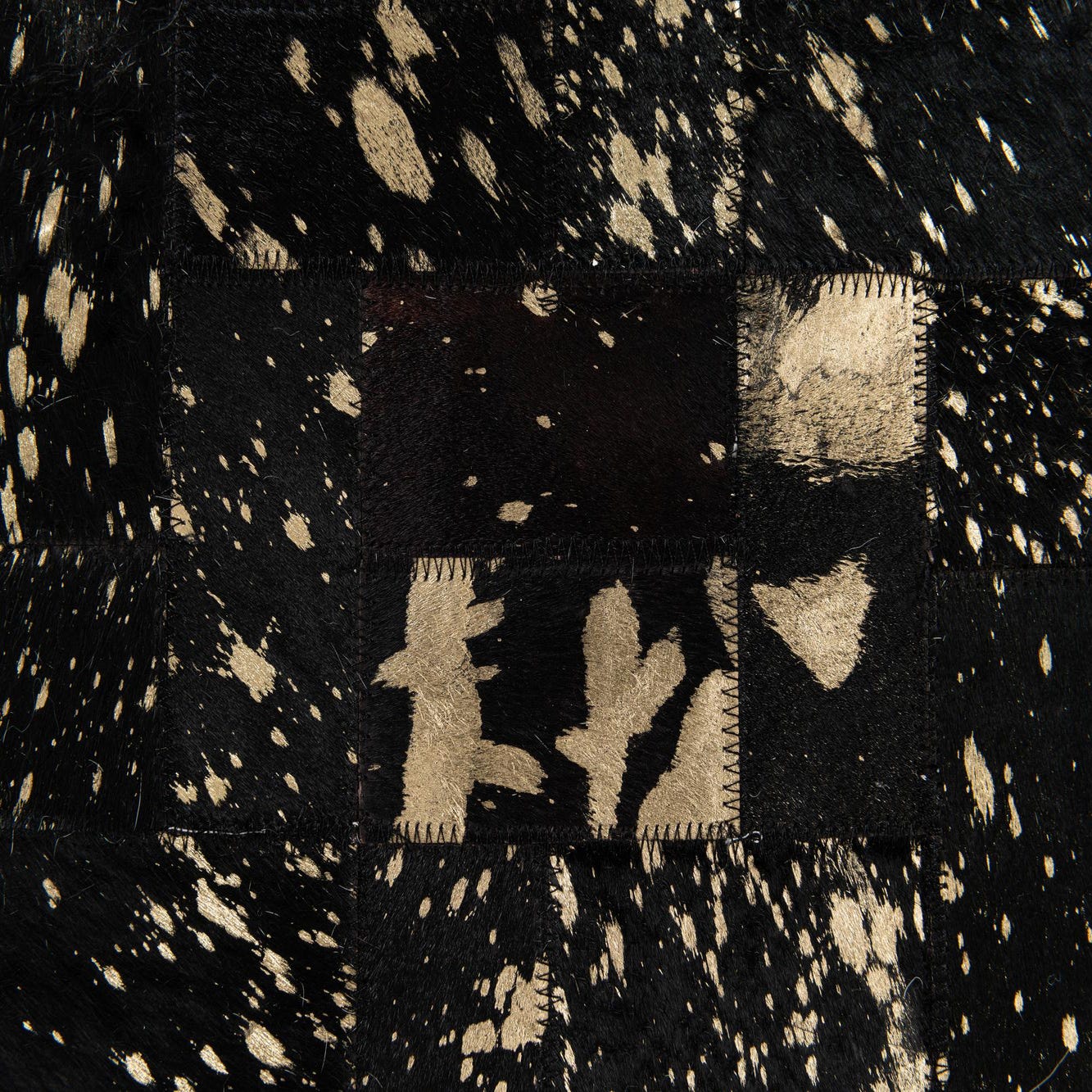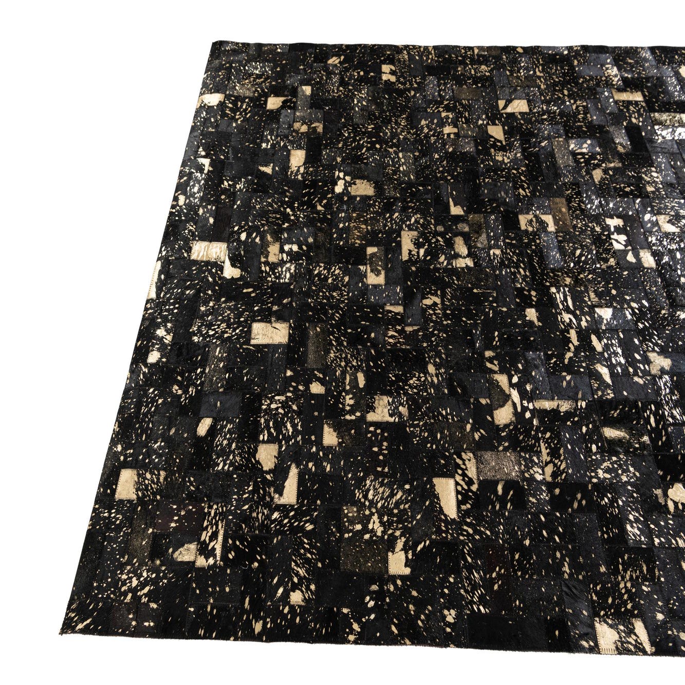 Handmade from cowhide and leather, this rug pairs a deep black ground with irregular gold accents for a richly textured look. The surface is a patchwork of small hair-on-hide rectangles and smooth leather pieces, each showing natural variation in nap and tone. Gold flecks and broader metallic patches break up the black background, creating an abstract, speckled pattern that reads modern and graphic while retaining an organic, tactile quality underfoot.