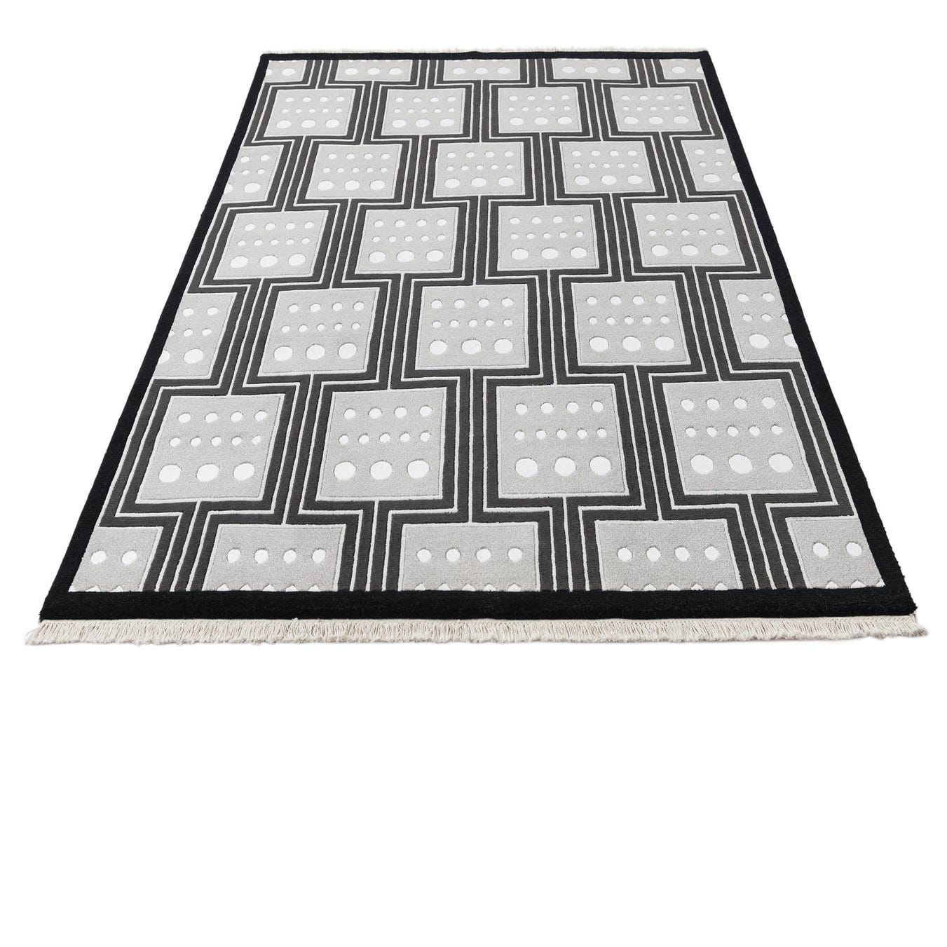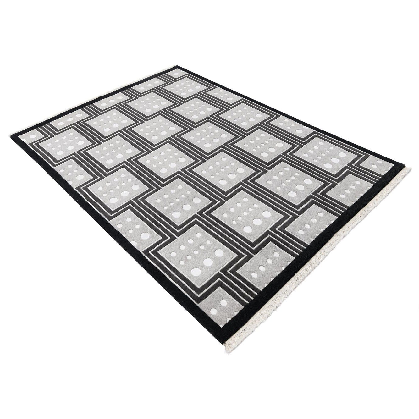A 5x8 rectangular Darya rug with a modern Persian pattern in black, grey, and white, featuring a geometric grid of squares with dotted centers.