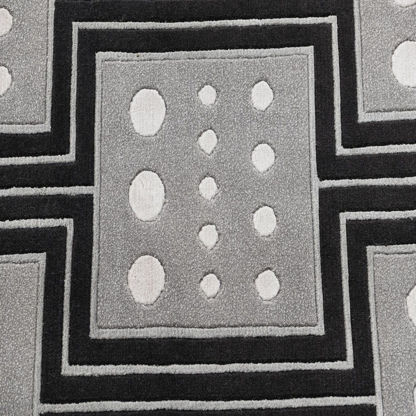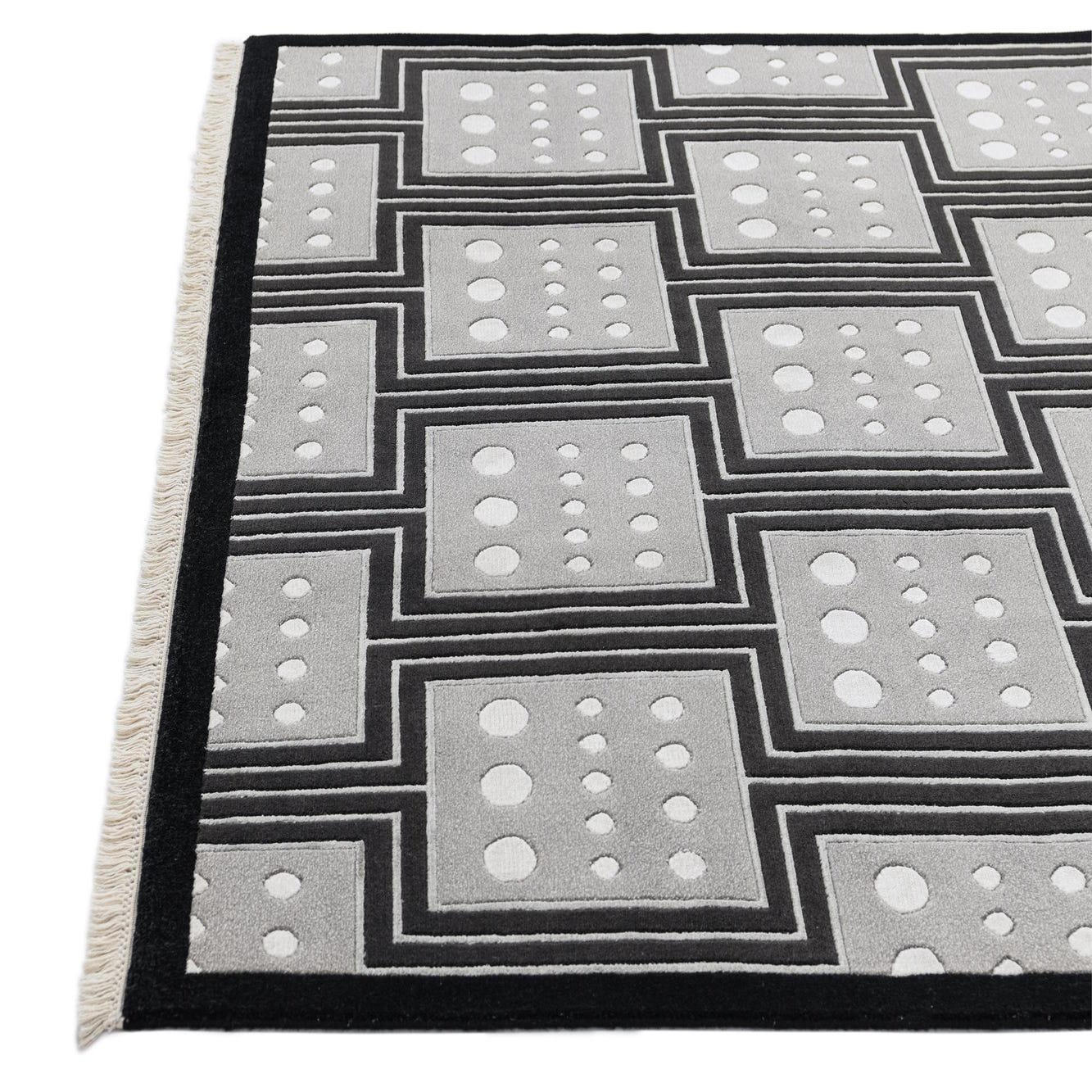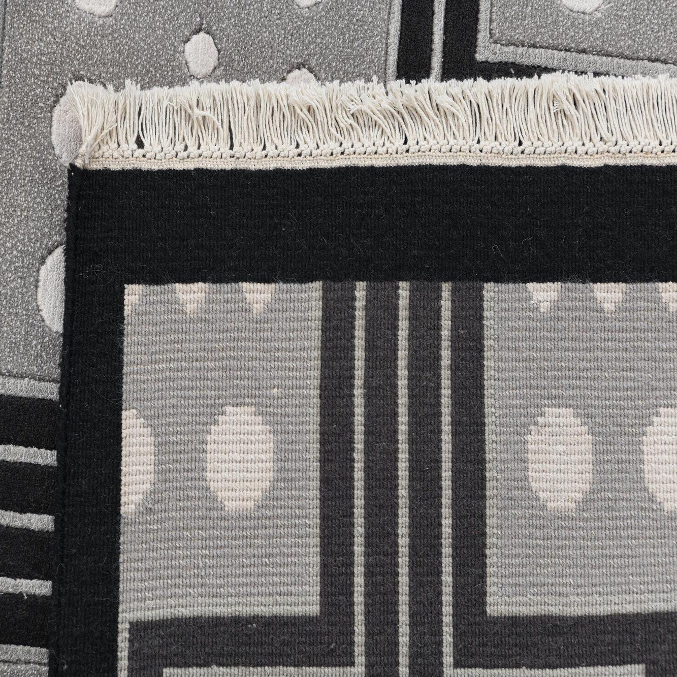 Primary color is Black. Colors in this rug include: Black, Beige, Gray, Silver.